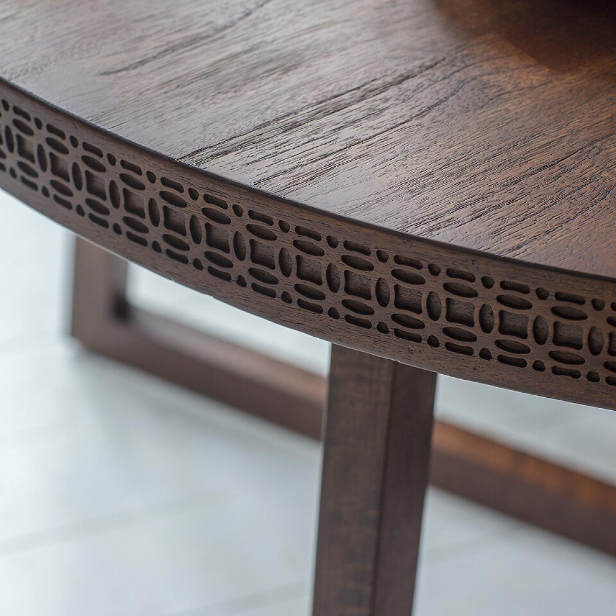 The Barauni Boho Carved Wood Round Dining Table (Seats 4) is made using mahogany, teak and mindy ash veneers against a base of mango solids, with a contrasting inlaid pattern. A stunning matte finish ensure the different grains in the mixed timbers stand out in the light. The table features a patterned frieze of blind fret work around the top of the table, creating a global traveller look that has a hint of ethnic design detail. This beautiful table is exciting but timeless in its approach and so can be mixed with modern or classic pieces in an eclectic living space. Product details. Seats 4Non-extending. Assembly required. Product Composition - Mango / Mindi / Mahogany / MDFProduct Dimensions - 120 cm x120 cm x75 cm , Weight - 28 KGClearance to floor- 68.8 cm Package Dimensions - 127 cm x 127 cm x 21 cm, Weight 33 kg. This product will be dispatched by one of our trusted suppliers. You’ll be contacted by their selected courier about your delivery. Please note: this product cannot be delivered to all Offshore Islands, Northern Ireland or Republic of Ireland. GALLE01