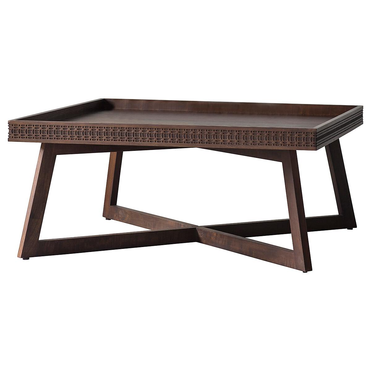 The Barauni Boho Carved Tray Coffee Table is truly a stunner. It is made using Mango solids with mixed timber veneers of Teak-Mahogany-Mindy Ash and Mango which give contrast and make the inlaid pattern stand out. It has a stunning matte black charcoal finish - the different grains in the mixed timbers stand out in the light and catch your eye with this beautiful detail. The table features a patterned frieze of blind fret work, made from solid mango wood, around the tray-style top. Product details. Assembly required. Product Composition - Mango / Mindi / Mahogany / MDFProduct Dimensions - 90 cm x 90 cm x 40 cm , Weight - 15 KGPackage Dimensions - 130 cm x 98 cm x 16 cm, Weight 18 kg. This product will be dispatched by one of our trusted suppliers. You’ll be contacted by their selected courier about your delivery. Please note: this product cannot be delivered to all Offshore Islands, Northern Ireland or Republic of Ireland.