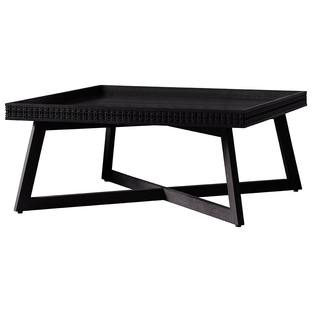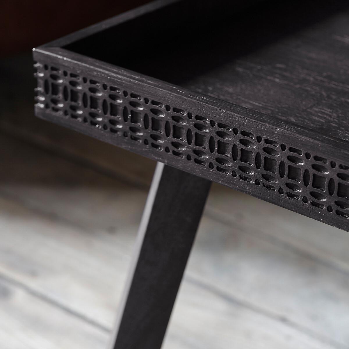 The Barauni Boho Carved Tray Coffee Table is truly a stunner. It is made using Mango solids with mixed timber veneers of Teak-Mahogany-Mindy Ash and Mango which give contrast and make the inlaid pattern stand out. It has a stunning matte black charcoal finish - the different grains in the mixed timbers stand out in the light and catch your eye with this beautiful detail. The table features a patterned frieze of blind fret work, made from solid mango wood, around the tray-style top. Product details. Assembly required. Product Composition - Mango / Mindi / Mahogany / MDFProduct Dimensions - 90 cm x 90 cm x 40 cm , Weight - 15 KGPackage Dimensions - 130 cm x 98 cm x 16 cm, Weight 18 kg. This product will be dispatched by one of our trusted suppliers. You’ll be contacted by their selected courier about your delivery. Please note: this product cannot be delivered to all Offshore Islands, Northern Ireland or Republic of Ireland.