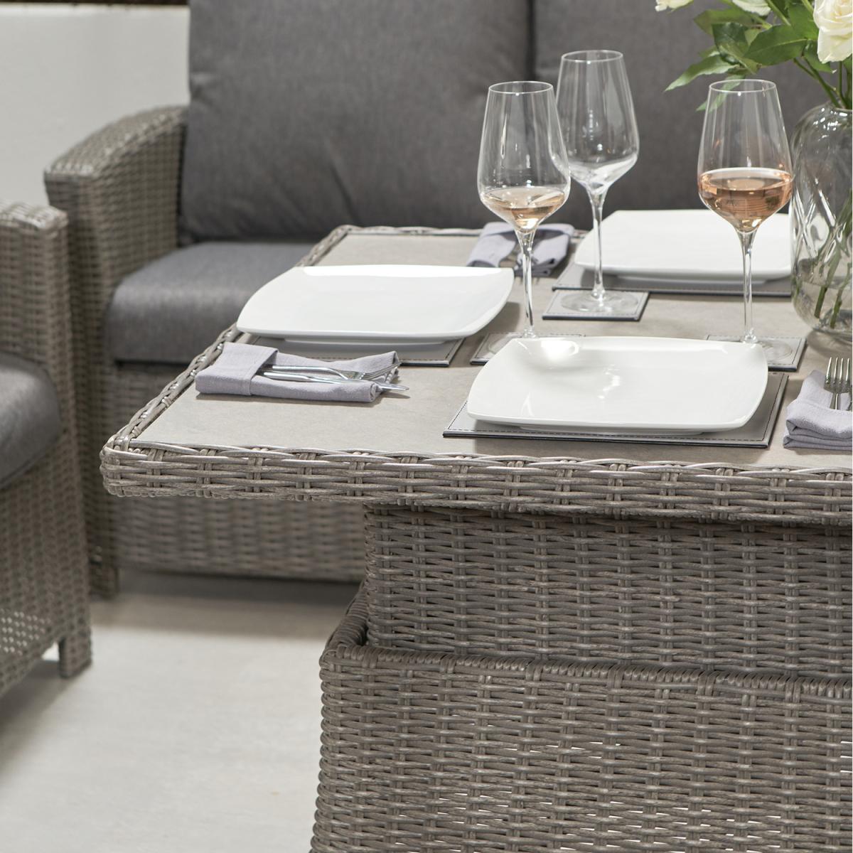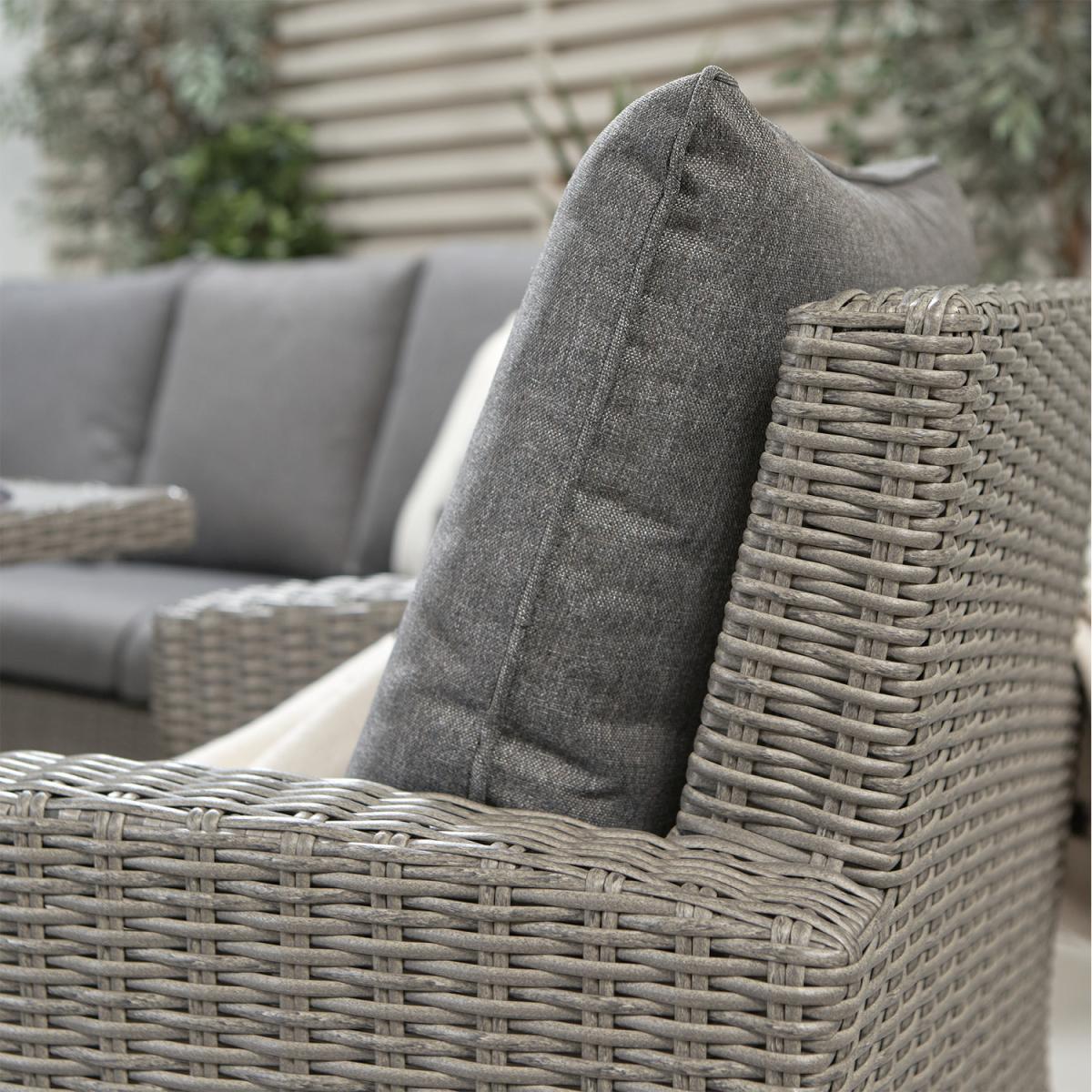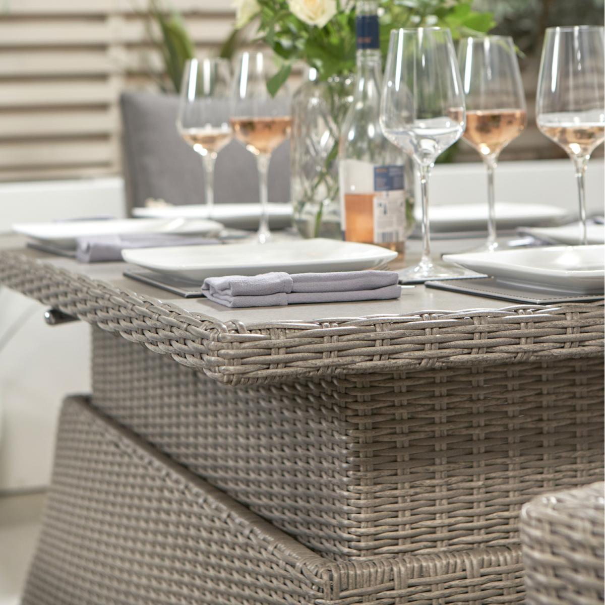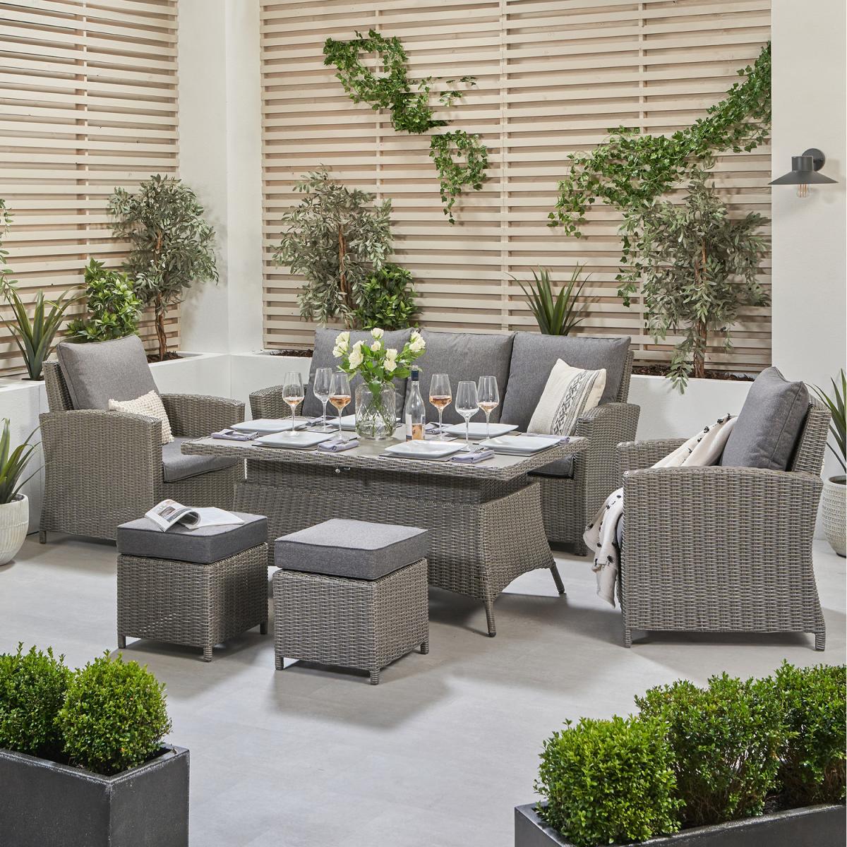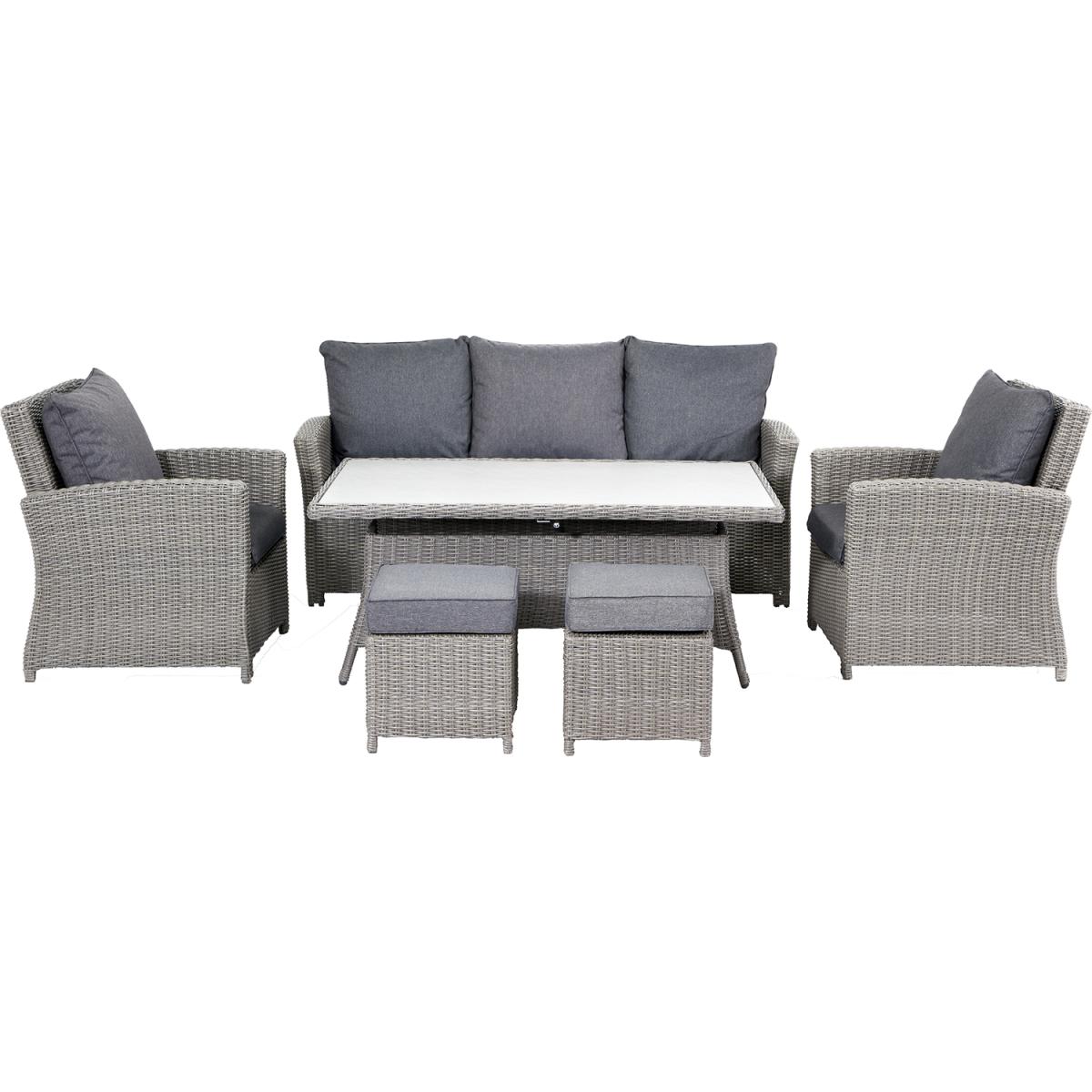 The 3 seater lounge set includes a 3 seater sofa, 2 armchairs and 2 footstools around an adjustable rectangular dining table. The set is crafted from a synthetic half round rattan weave ensuring a modern look, and durable weather-resistant finish. This outdoor lounge set also features a powder-coated aluminium frame, which ensures its high-quality and robustness. The stylish, adjustable table is topped with premium ceramic for a heavy duty, quality finish. The adjustable table can be used as either a low coffee table or higher relaxed dining table by using the simple discrete gas pump mechanism, making this table hassle-free to adjust. The season proof, fire retardant cushions are water repellent, allowing the water to run off the cushion. In the rare event that any moisture does penetrate the outer fabric there is a ventilation section in each cushion which allows it disperse.