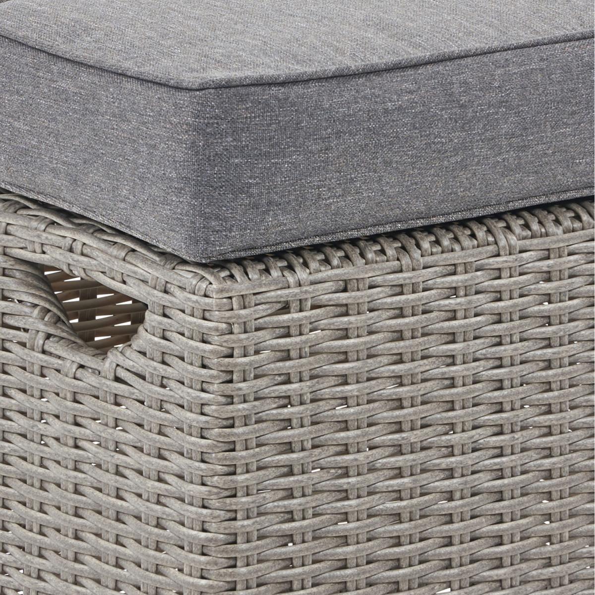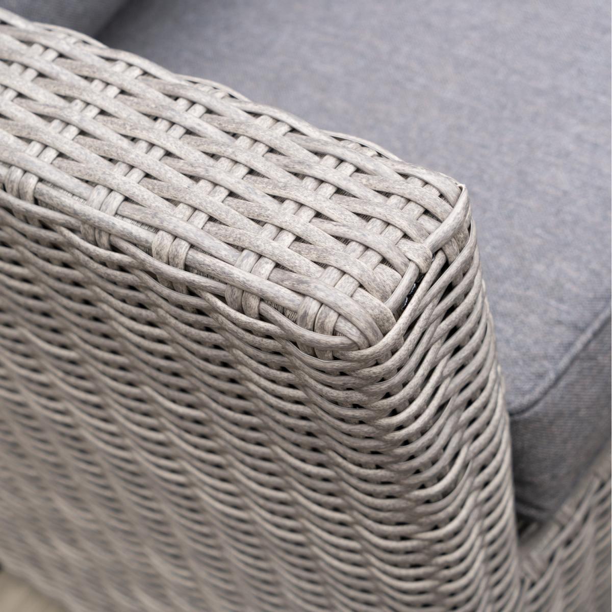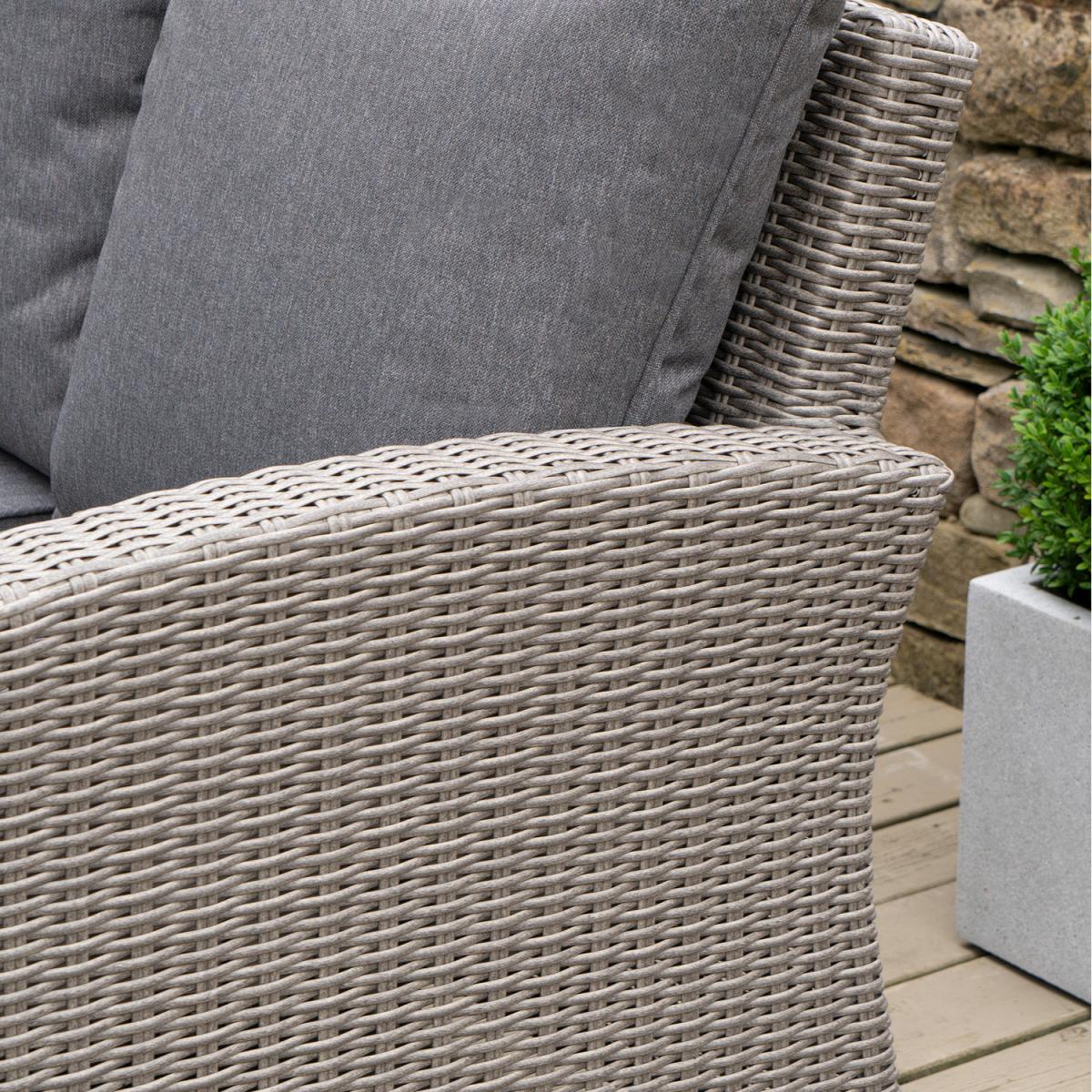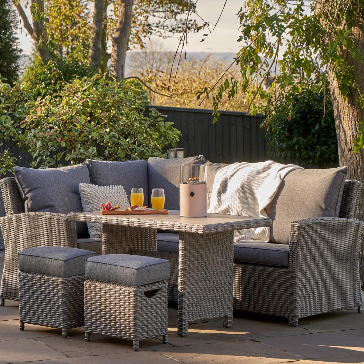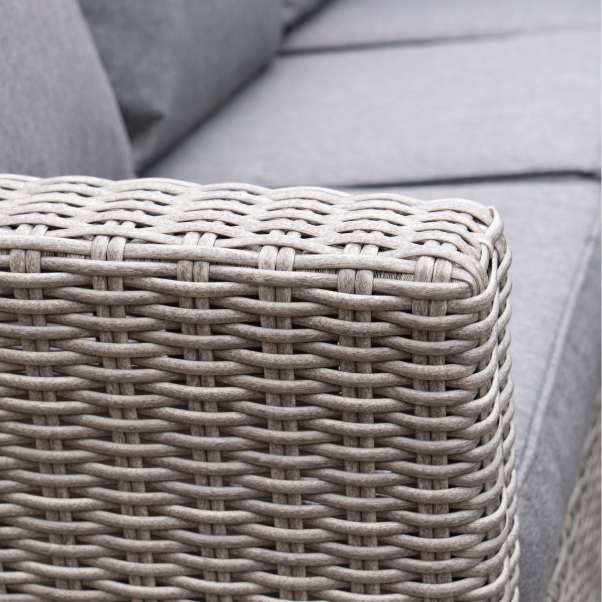 The Barbados Compact Set with Relaxed Dining offers gorgeous, classic style within a neat and flexible design. This set comprises of a corner sofa arrangement, and 2 footstools around a rectangular dining table. The set is crafted from a synthetic half round rattan weave ensuring a modern look, and durable weather resistant finish. This outdoor corner set also features a powder-coated aluminium frame, which ensures its high-quality and robustness. The stylish table is topped with premium ceramic for a heavy duty, quality finish. The season proof, fire retardant cushions are water repellent, allowing the water to run off the cushion. In the rare event that any moisture does penetrate the outer fabric there is a ventilation section in each cushion which allows it disperse.