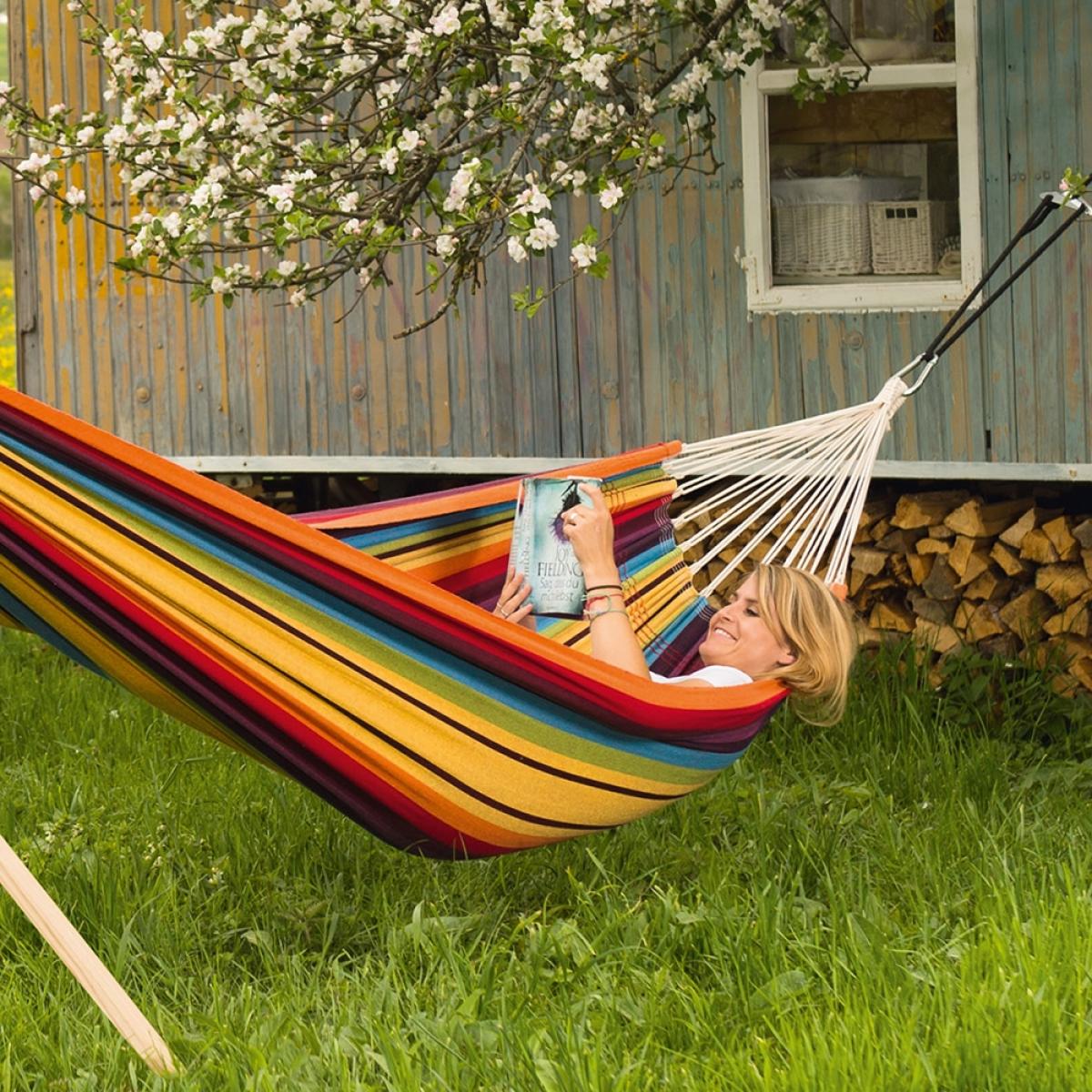 The Amazonas Barbados Double Hammock in rainbow fabric is the couples hammock of choice. Super-wide, snugly comfortable, very robust and virtually indestructible, the Barbados Double is the perfect hammock for relaxing as a couple. Hang it on your balcony, inside your home or set it up for the summer in the garden, you will be thinking of any excuse to chill in your hammock! With Brazilian hammocks like Amazonas, the wider they are, the more comfortable they are. These unique hammocks are the perfect way to relax and wind down, why not treat yourself or someone else!. Features & Benefits:.