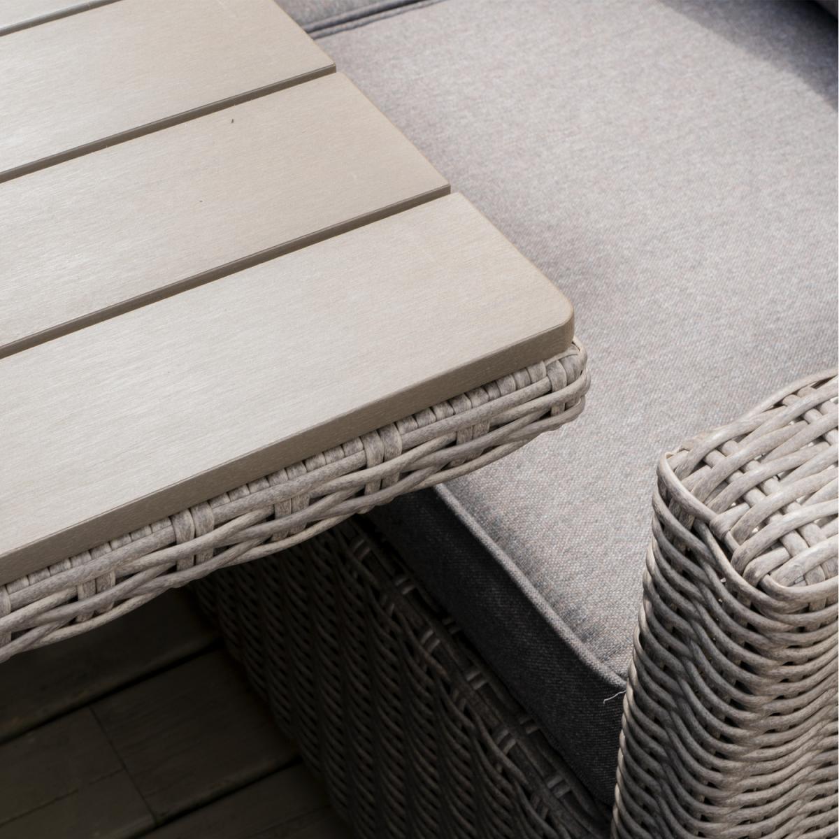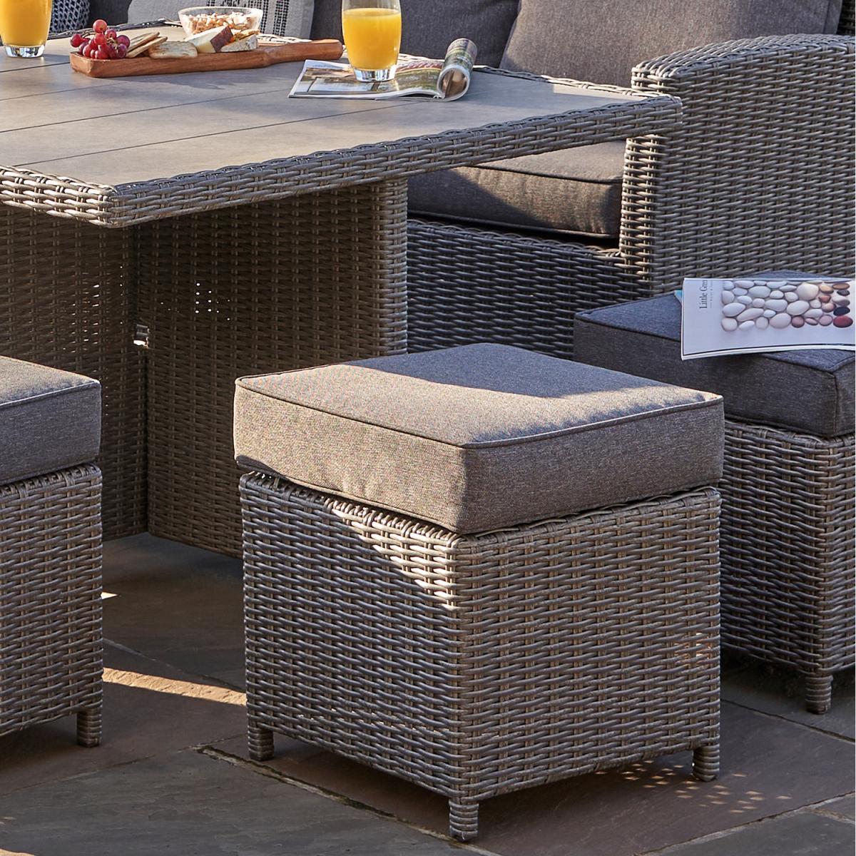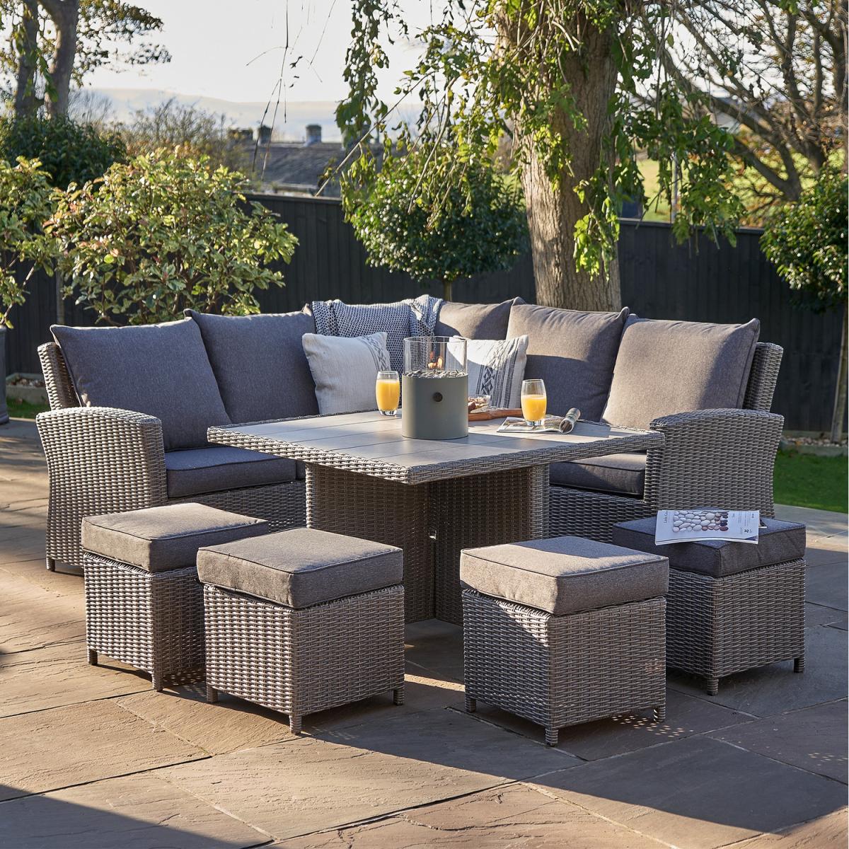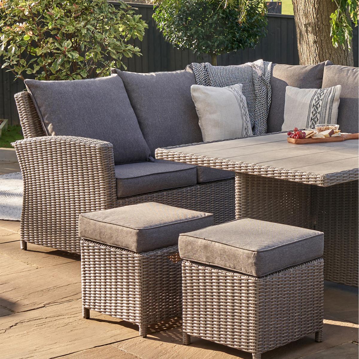 The Slate Grey Barbados Square Corner Seating Set with Ceramic Top cleverly offers seating for the whole family, with a neat and stylish design. This set comprises of a corner sofa arrangement, and 4 footstools around a square dining table. The set is crafted from a synthetic half round rattan weave ensuring a modern look, and durable weather resistant finish. This outdoor corner set also features a powder-coated aluminium frame, which ensures its high-quality and robustness. The stylish table is topped with premium ceramic slats for a heavy duty, quality finish. The season proof, fire retardant cushions are water repellent, allowing the water to run off the cushion. In the rare event that any moisture does penetrate the outer fabric there is a ventilation section in each cushion which allows it disperse.