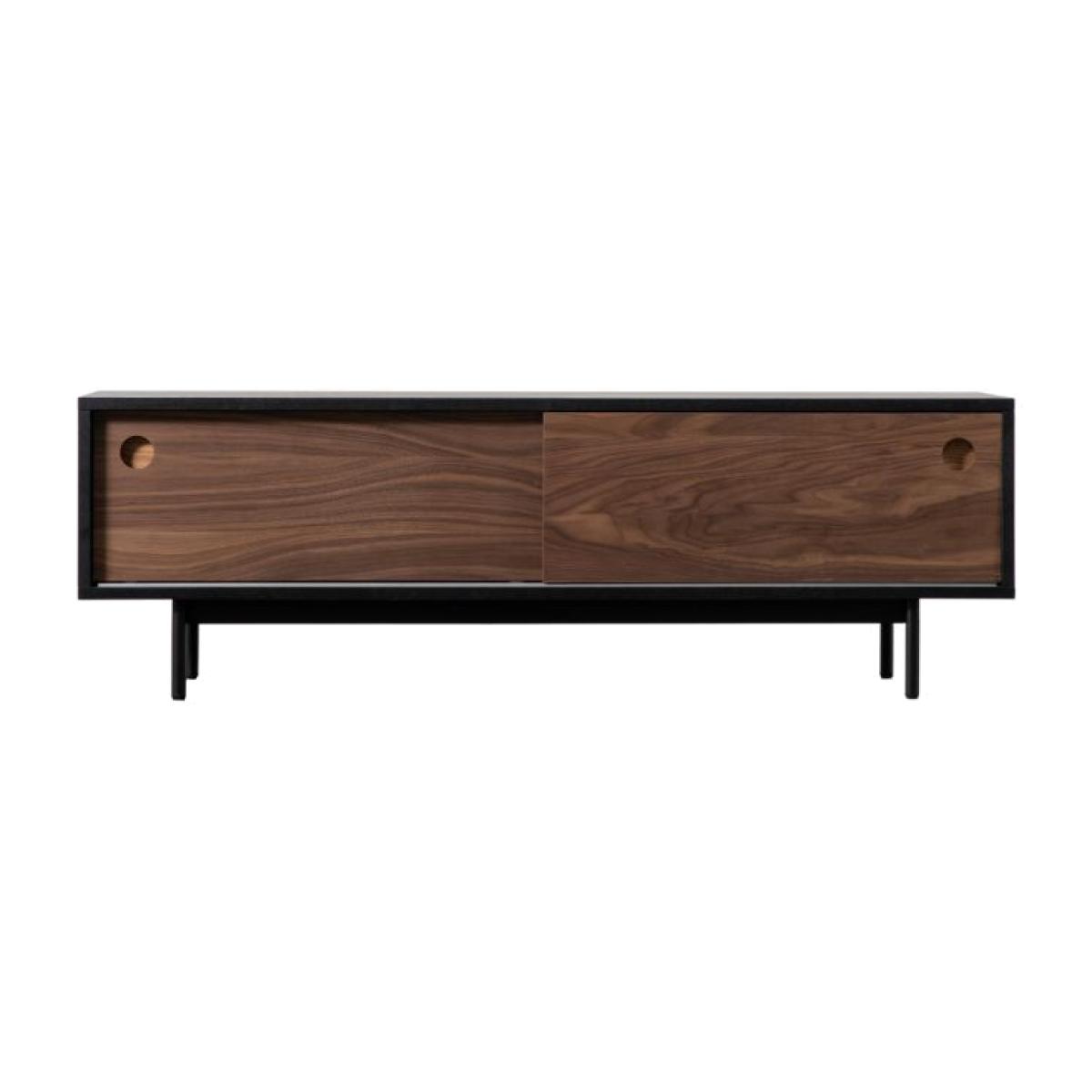 This eye-catching media unit combines oak stained in a black finish and walnut veneers with black metal legs to create a stunning contemporary look. Cut out circular handles with a wood panel behind add an interesting and unusual design feature. The doors slide to open. It is part of a collection, which offers a selection of cabinet pieces, is part of our Packed-Flat Design Project, offering easy delivery to any room in any property, whilst reducing the packaging needed. Assembly is required, but all the tools needed are supplied.
