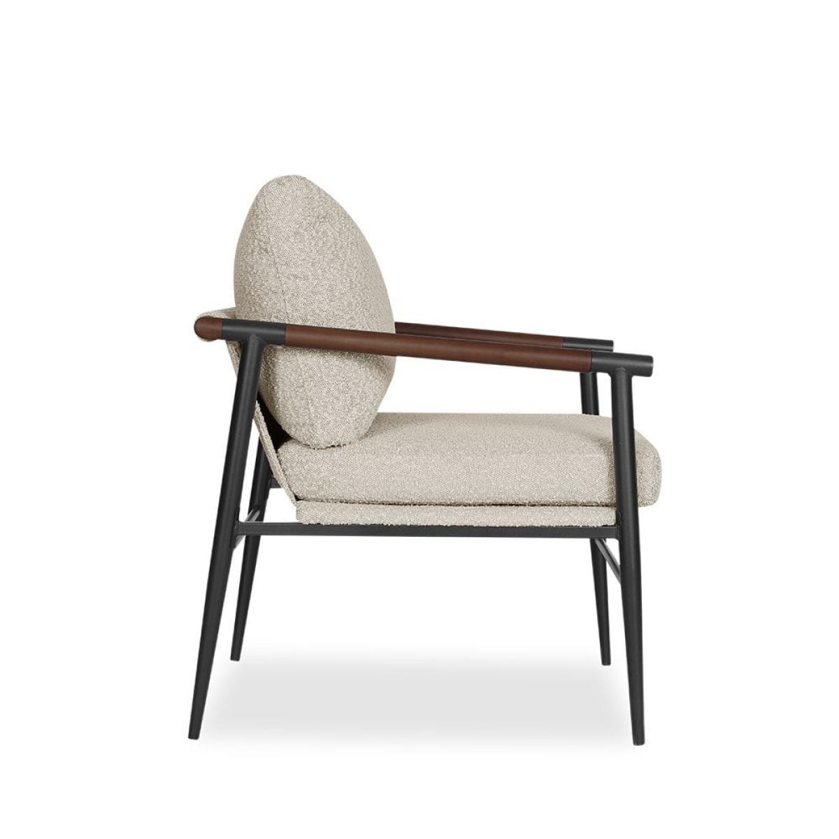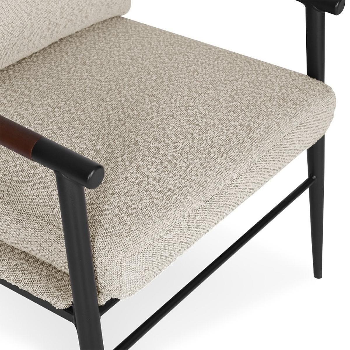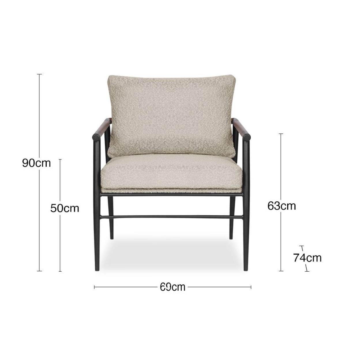 Bring a touch of mid-century modern into your living room with the Barbican Boucle Armchair. Constructed from a streamlined metal frame accented with wooden armrests, this classic piece of industrial-inspired furniture is upholstered in a sustainable speckled stone boucle for character and comfort. Deep-set seat, relaxed lounge vibes; welcome to the world of relaxation. For a rich depth of colour and unique softness, our boucle used in this chair is not only of the highest quality but it is made from recycled PET yarns so it is kinder to the environment too.