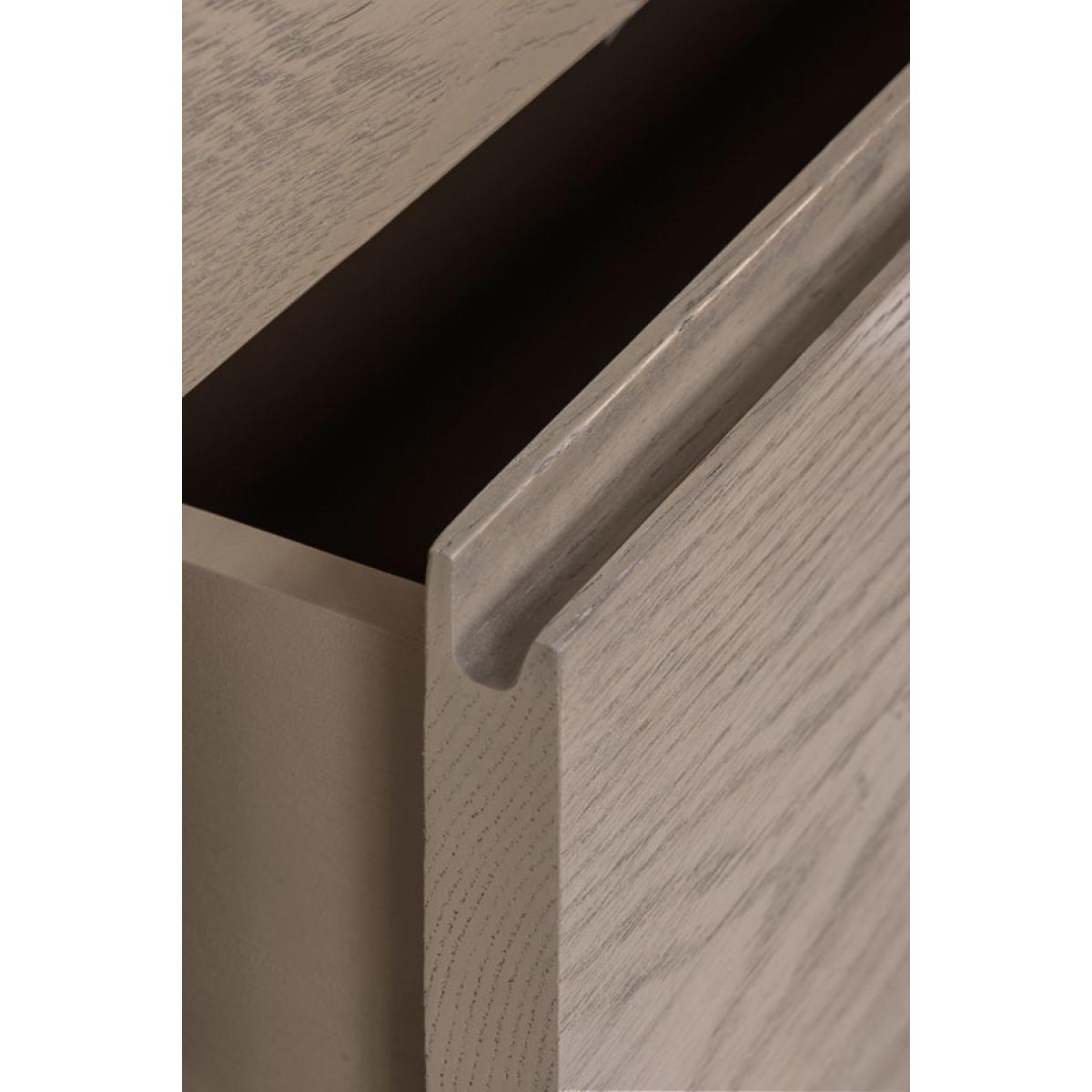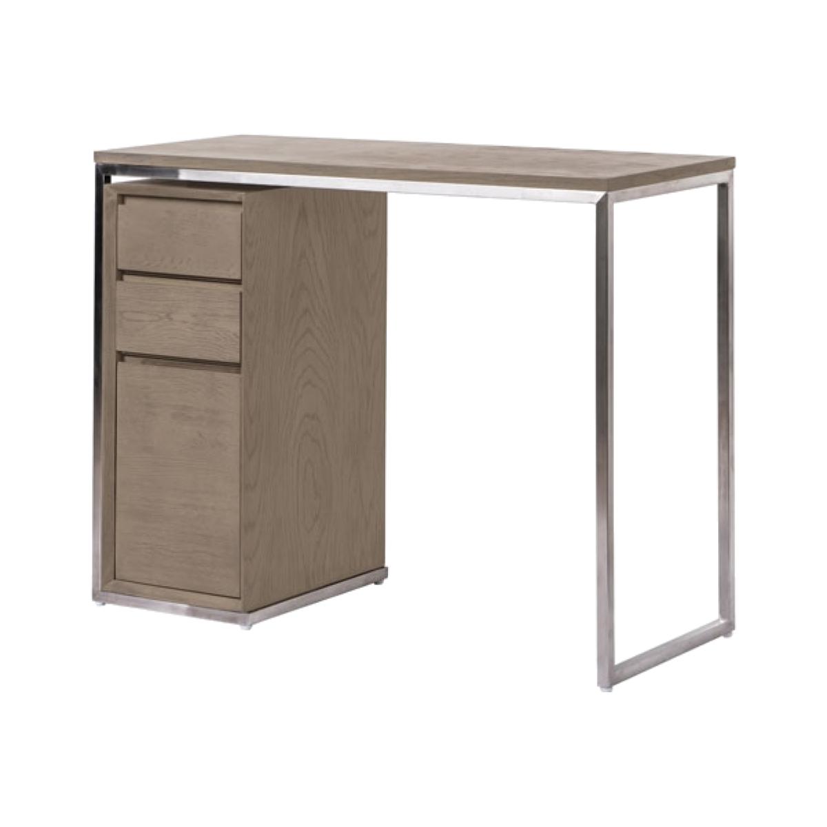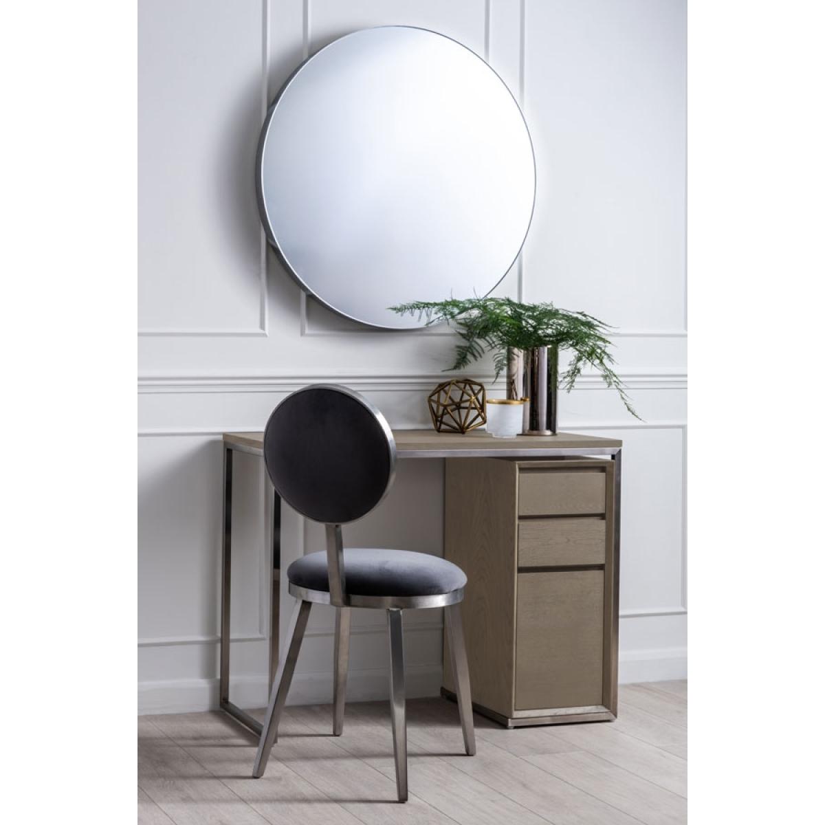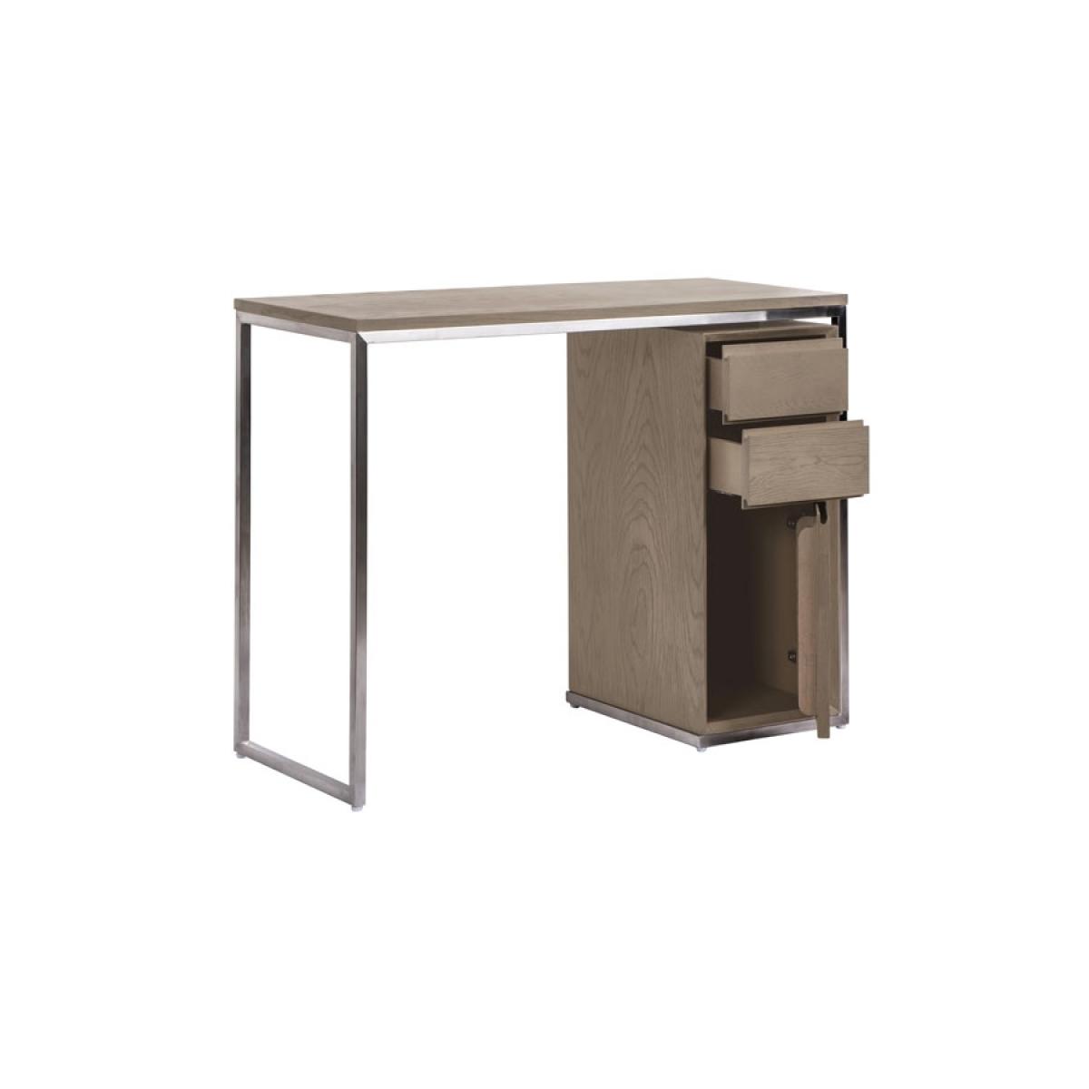 A contemporary dressing table inspired by modernist architecture. Also suitable for use as a desk or console table. 2 useful drawers with soft close catches. Cupboard with door for housing your hair dryer, straighteners and tongs. Cable port to the rear of the drawers and cupboard for routing cables. Smoked oak and oak veneer with matt lacquered finish. Sleek integral handles. Brushed stainless steel frame. Supplied fully assembled.