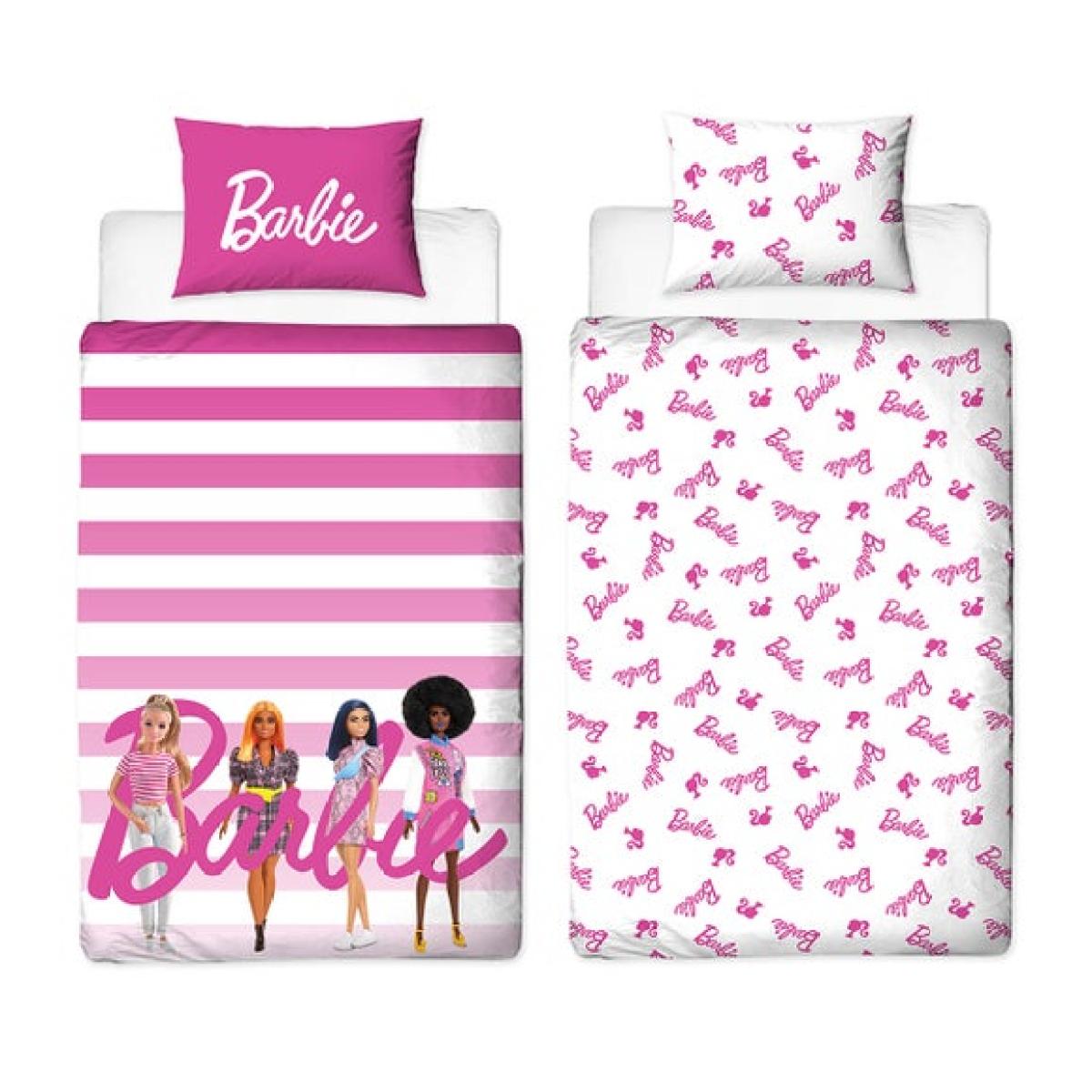 * Iconic Barbie design * Super soft material * Reversible design Make bedtime iconic with this Barbie Quilt Cover and Pillowcase Set. Featuring a bold print of Barbie in all her girl boss glory, to firefighter to President, this set celebrates everything pink, powerful and playful. The reversible deign lets you switch between a vibrant Barbie doll scene and a chic tumble of logos and silhouettes, keeping your little one's room as stylish as they are. Crafted from a soft polycotton blend with recycled polyester, it's comfy, durable and easy to care for. Popper fastenings make it easy to whip off and wash, ready for the next adventure. Designed for single beds, it's perfect for little icons in the making.