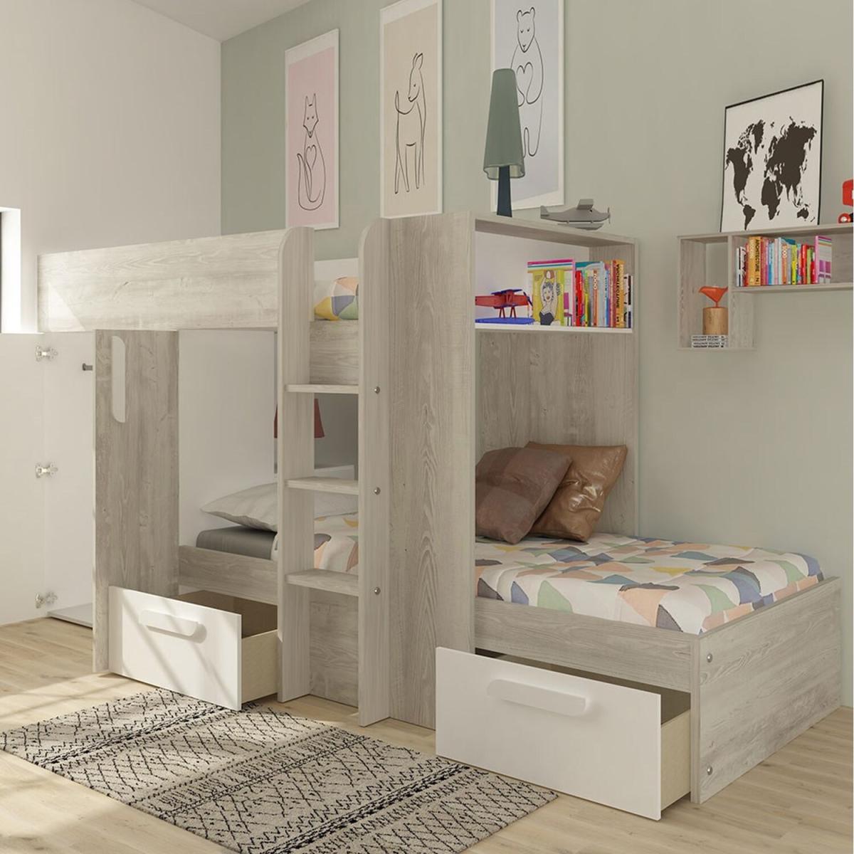A unique offset bunk design with loads of handy storage and stylishly finished in a light oak effect and white, blue or pink. The lower bunk can be offset to the left or right depending on your bedroom layout. Perfect for girls and boys with a light colour way that can be suited to neutral room decor or bold contracting colours. The choice is yours to make a truly designer bedroom. With it's brilliant storage system, this bunk bed incorporates wardrobe space, under bed drawers and shelving. A great space saver and fun bunk bed all in one Manufactured from laminated high density particle board in a White, blue or pink and Oak Effect Finish