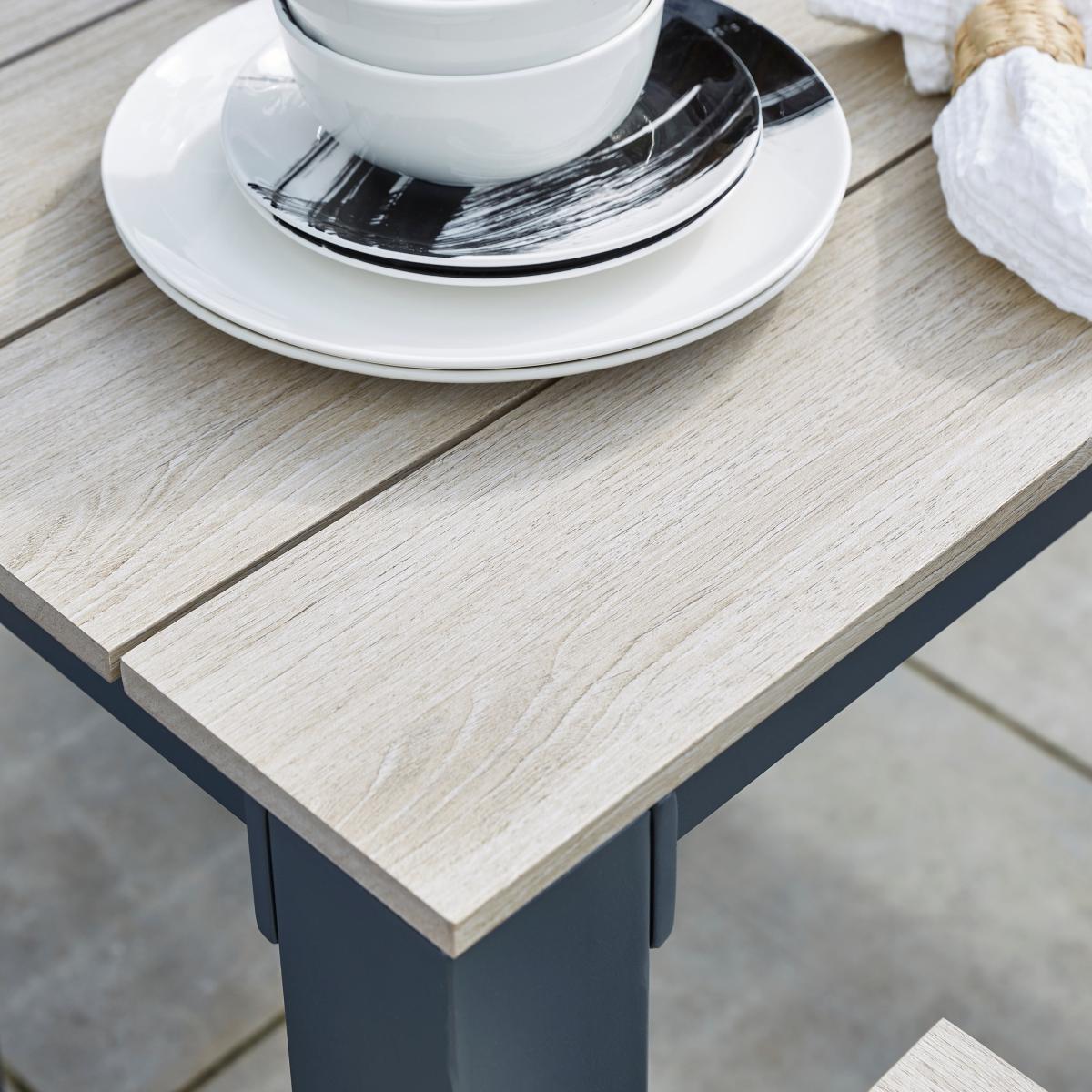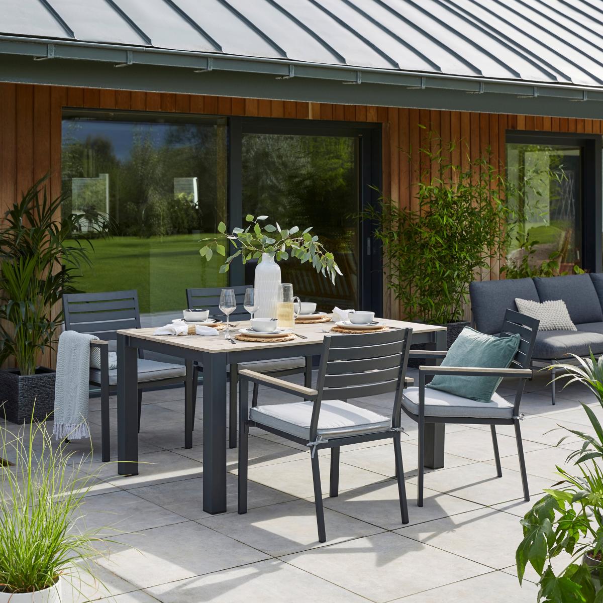I love this set for its sleek, contemporary design that works well in both modern and transitional garden spaces. Its neutral tones and minimalist style make it versatile, allowing it to complement a range of outdoor décors, from lush greenery to architectural structures. Practical styling tips include pairing it with colourful cushions or tableware to add a pop of colour, and incorporating string lights or lanterns for cosy evening dining. This set’s clean lines and sturdy construction make it ideal for casual family get-togethers or stylish outdoor entertaining, seamlessly blending comfort and sophistication.