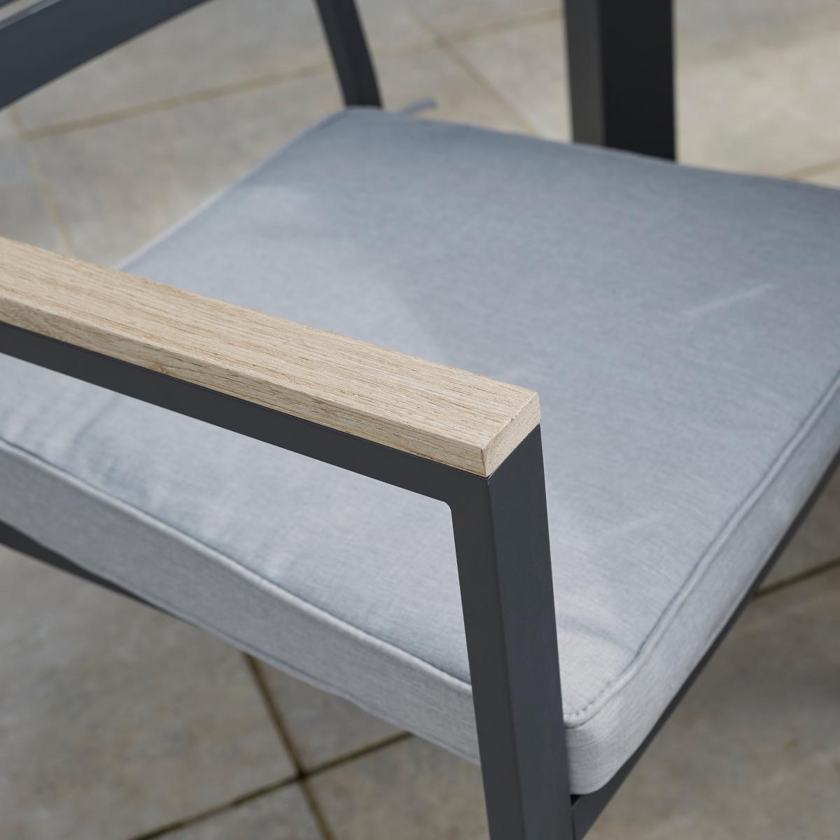 * 4 x Chairs and 1 x Table * Polywood table top and chair armrests * Upholstered chair cushions * Powder coated This set includes four comfortable chairs and a sturdy dining table, making it perfect for gatherings with family and friends. The table features a sleek polywood top, while the chairs are designed with matching polywood armrests for a coordinated, modern look. Complete with durable cushions, this set offers both comfort and style for your garden or patio.