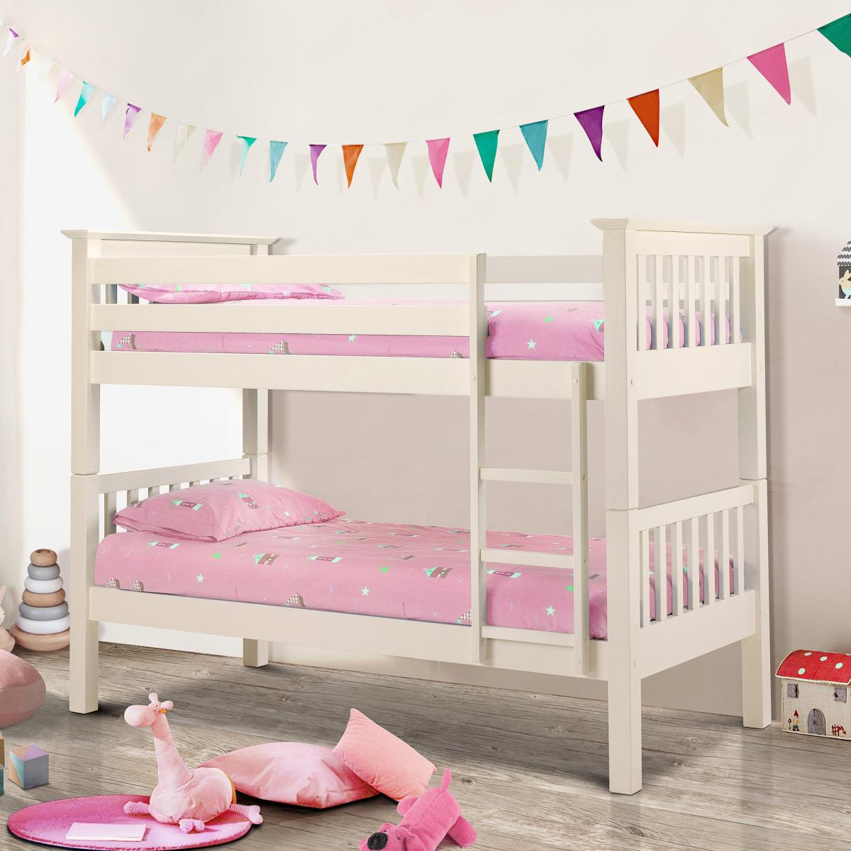 A strong modern bunk bed in off white with safety bars, a ladder and solid bed slats. The Barcelona Bunk Bed will light up your children’s bedroom and features a strong modern MDF construction that is highly durable. It has safety bars, for peace of mind as well as a ladder and bed slats to give you a practical space-saving bunk bed. Please note: Mattresses for this bed frame should not exceed 6" in height due to EU legal requirements. Suitable for ages 6 years and over. Please note, unfortunately we cannot deliver this item to the Channel Islands.