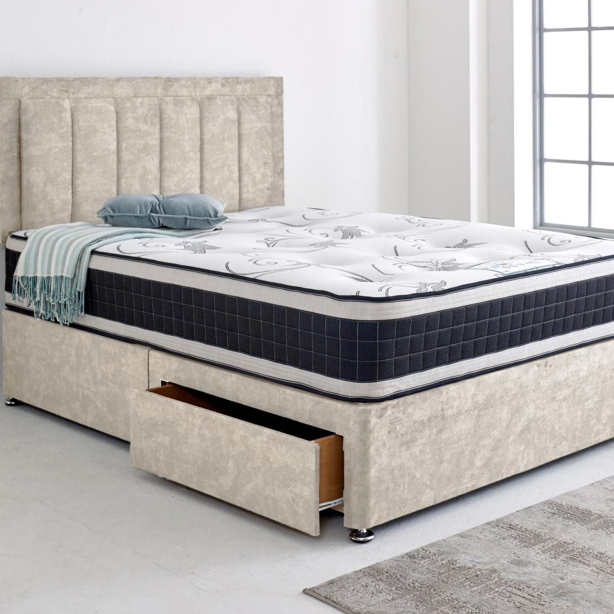 The Divan Bed has been made in the UK, crafted with precision and care, showcases the finest British craftmanship, ensuring long lasting quality. Elegant 24" inch headboard with a Barcelona stripe design giving it an elegant look and stylish finish, adding a touch of class to your bedroom. This Divan bed shows sophistication and elegance, adding a touch of luxury to your bedroom. Customise your style and express your unique taste with this luxury Divan Bed and Headboard. Elevate your bedroom and experience the perfect blend of elegance, style and quality. Transform your space into a haven of comfort and sophistication.