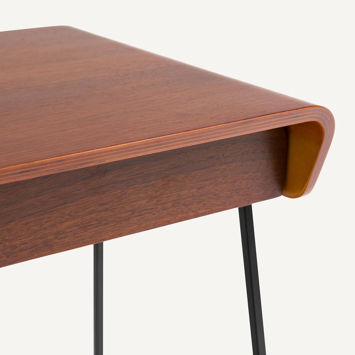 I love this bedside table for its sleek, minimalist design and warm walnut veneer that adds a touch of natural elegance. It works particularly well in contemporary or Scandi-inspired interiors, where clean lines and subtle materials are key. Practical styling tips include layering with textured bedding or placing a small stack of books and a lamp on top to create a cosy yet functional corner. The black metal legs add a slight industrial edge, making it versatile enough to pair with both modern and eclectic décor. For added interest, consider mid-century accessories or soft textiles nearby to soften its sharp edges while maintaining a sophisticated look.