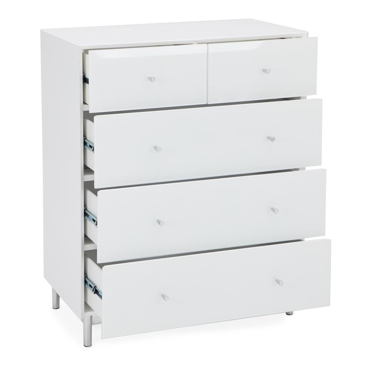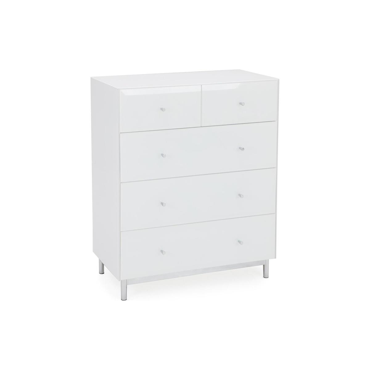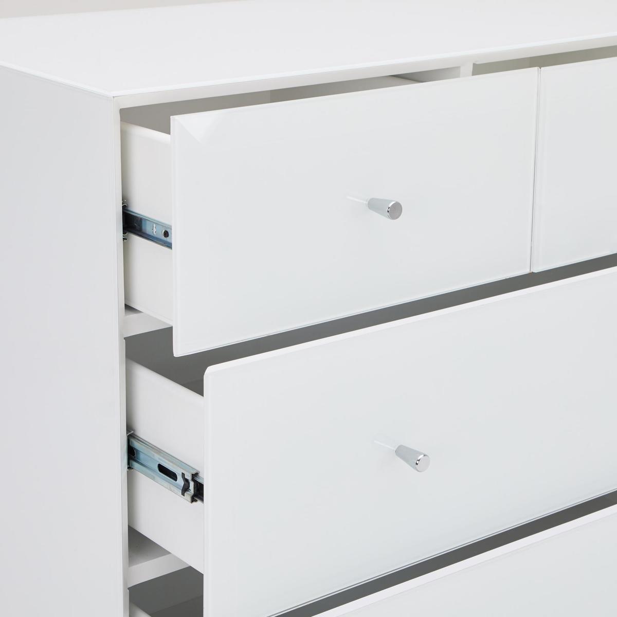 Dunelm Exclusive - Designed and Developed by Dunelm. Beautifully crafted with white glass panels, petite handles and matching chrome legs, the Bardoux range offers a clean, feminine finish. Complete with stylish bevelled edges, this stunning range is perfect for both modern spaces or as a contrast for more traditional styles. Complete with 5 spacious drawers offering ample storage space, the Bardoux 5 drawer chest is finished in a stunning white colourway and comes fully assembled for added convenience.