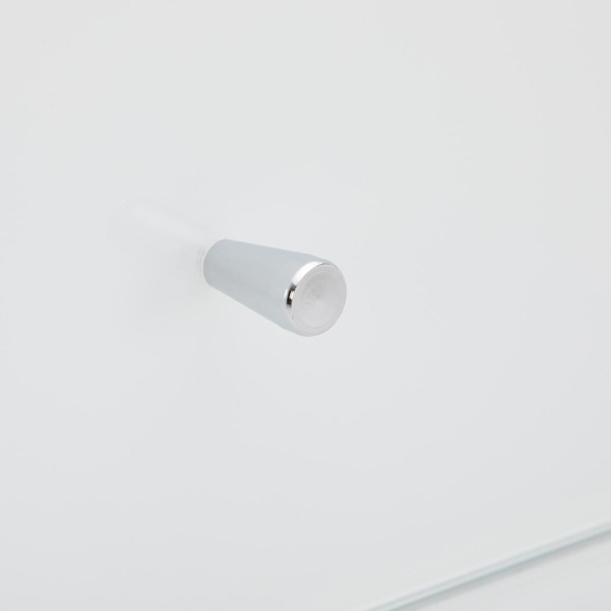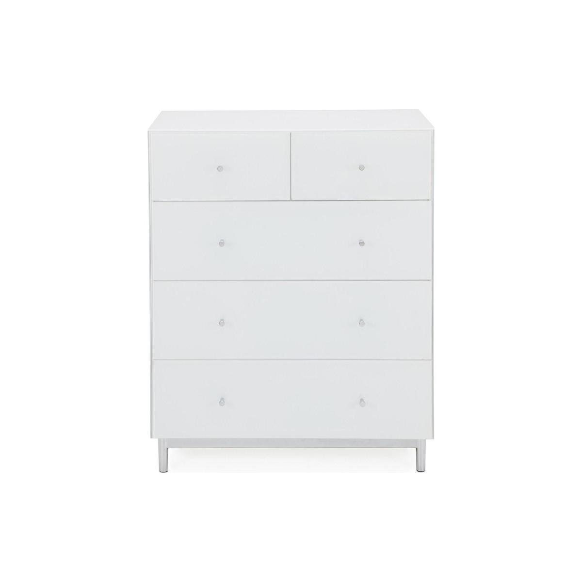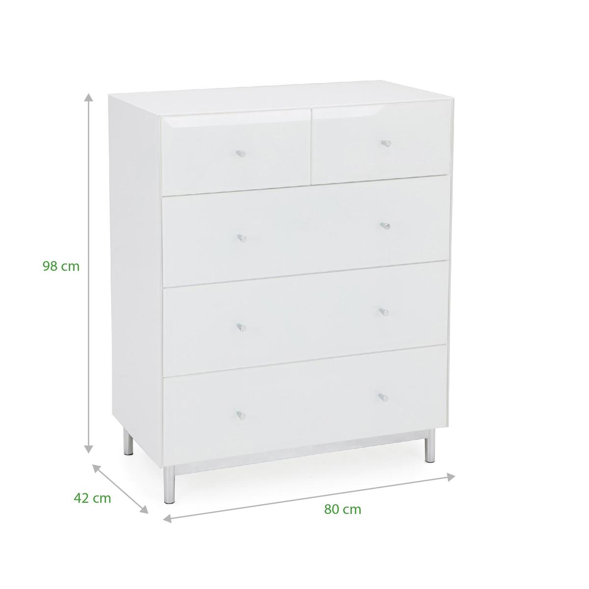 Dunelm Exclusive - Designed and Developed by Dunelm. Beautifully crafted with white glass panels, petite handles and matching chrome legs, the Bardoux range offers a clean, feminine finish. Complete with stylish bevelled edges, this stunning range is perfect for both modern spaces or as a contrast for more traditional styles. Complete with 5 spacious drawers offering ample storage space, the Bardoux 5 drawer chest is finished in a stunning white colourway and comes fully assembled for added convenience.