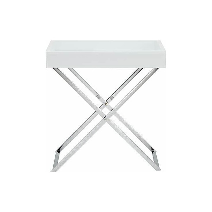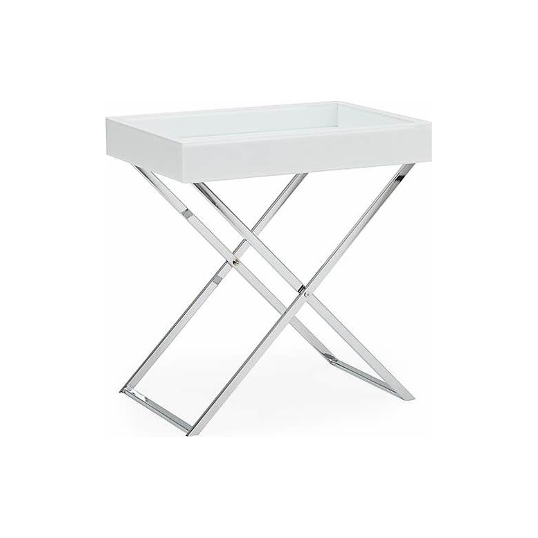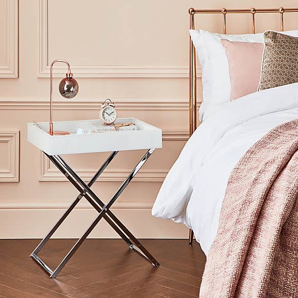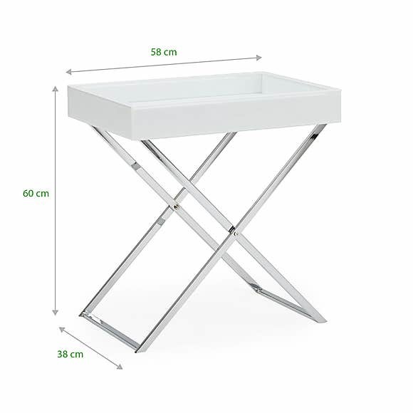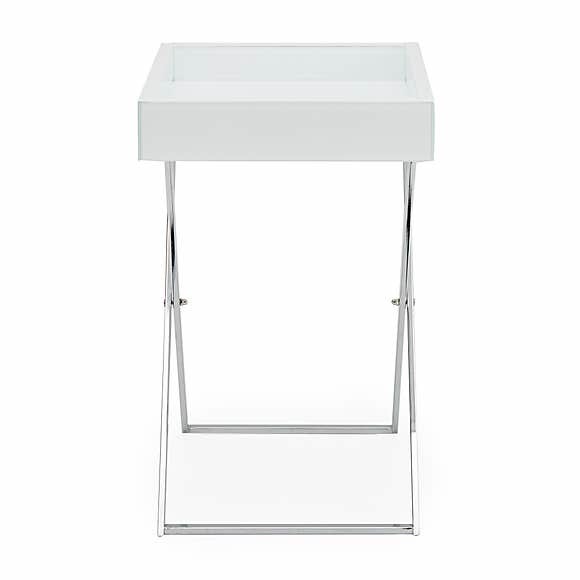 Dunelm Exclusive - Designed and Developed by Dunelm Beautifully crafted with white glass panels, petite handles and matching chrome legs, the Bardoux range offers a clean, feminine finish. Complete with stylish bevelled edges, this stunning range is perfect for both modern spaces or as a contrast for more traditional styles. Perfect for use in any room, the part assembly Bardoux side table features an elegant tray top, offering convenient storage and a gorgeous cross leg design. [Click here to view the full Bardoux range](https://www.dunelm.com/category/home-and-furniture/furniture/shop-by-collection/bardoux-furniture-collection)