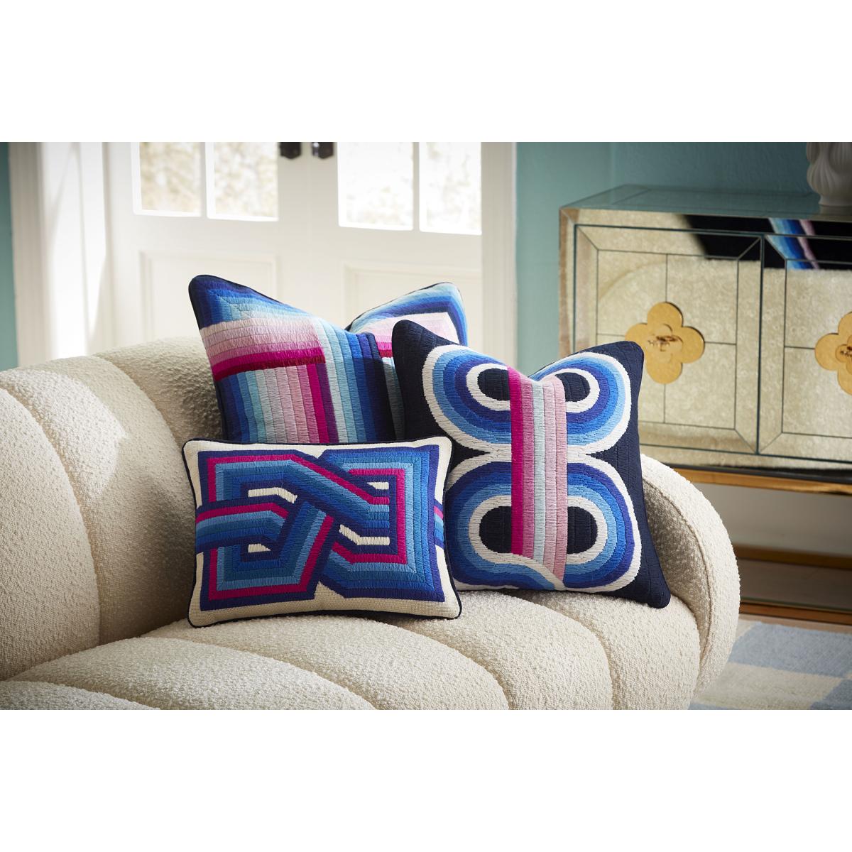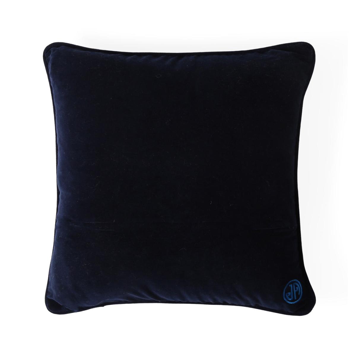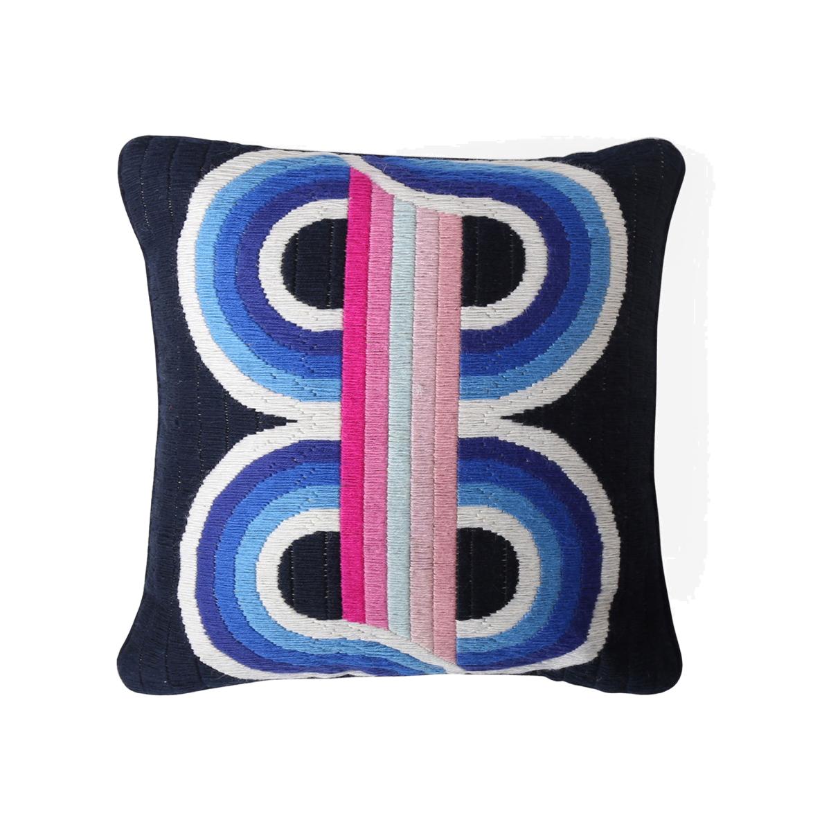 Embroidered by hand, this woollen cushion is the result of remarkable artisanal work: it requires around 32 hours’ work to make! American designer and ceramicist Jonathan Adler loves to revive forgotten traditional crafts and techniques. With audacity and fantasy, he revisits the technique of Bargello embroidery. Having appeared around the 16th century in Florence, this embroidery stitch is characterised by regularly overlapping broken lines, giving rise to a pattern that develops in waves. Jonathan Adler creates a pattern inspired by psychedelic graphics from the 70s. Vibrant in bold blues and punchy pinks, these cushions enhance any room. You’ll love the delightful discrepancy between tradition, ancestral know-how and the colourful, pop, offbeat imagery of Jonathan Adler. The back of the cushion is covered with luxurious black velvet. Jonathan Adler has become a eulogist for an uninhibited, playful and punchy style of decoration, defending irreverent luxury and mixing American modernism with Arts & Crafts references.