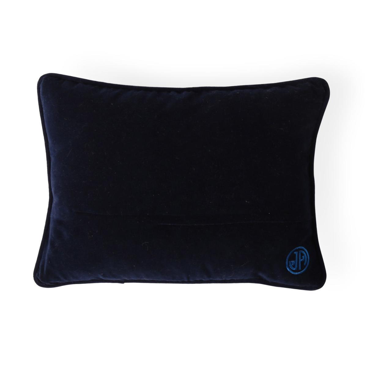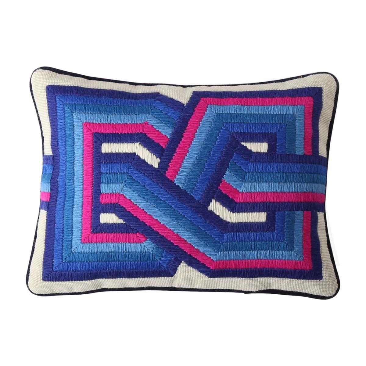 Embroidered by hand, this woollen cushion is the result of remarkable artisanal work: it requires around 32 hours’ work to make! American designer and ceramicist Jonathan Adler loves to revive forgotten traditional crafts and techniques. With audacity and fantasy, he revisits the technique of Bargello embroidery. Having appeared around the 16th century in Florence, this embroidery stitch is characterised by regularly overlapping broken lines, giving rise to a pattern that develops in waves. Jonathan Adler creates a pattern inspired by psychedelic graphics from the 70s. Vibrant in bold blues and punchy pinks, these cushions enhance any room. You’ll love the delightful discrepancy between tradition, ancestral know-how and the colourful, pop, offbeat imagery of Jonathan Adler. The back of the cushion is covered with luxurious black velvet. Jonathan Adler has become a eulogist for an uninhibited, playful and punchy style of decoration, defending irreverent luxury and mixing American modernism with Arts & Crafts references.