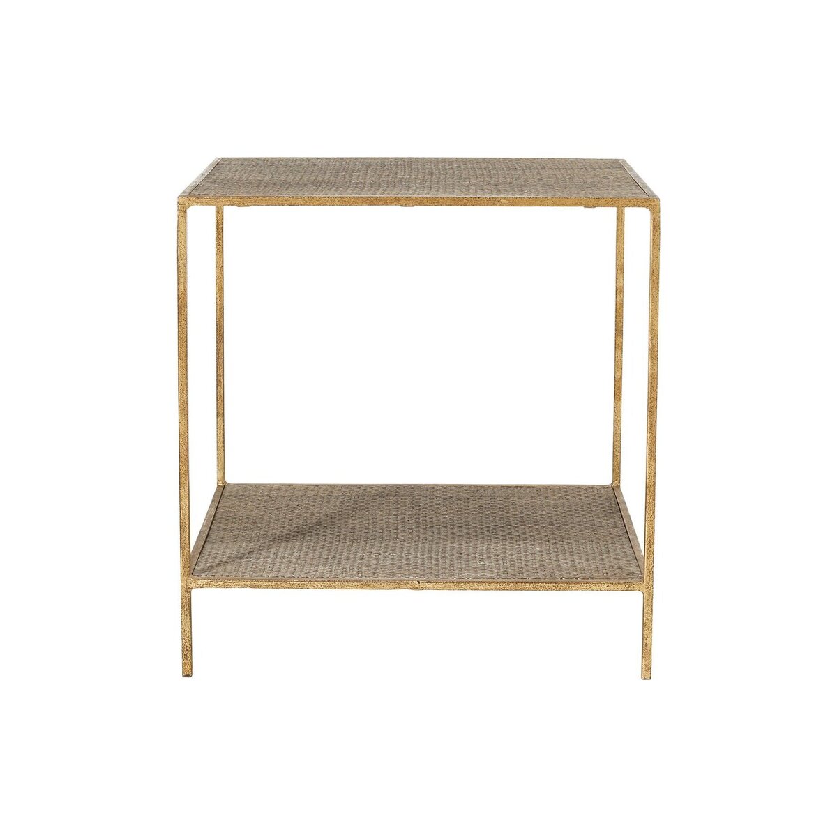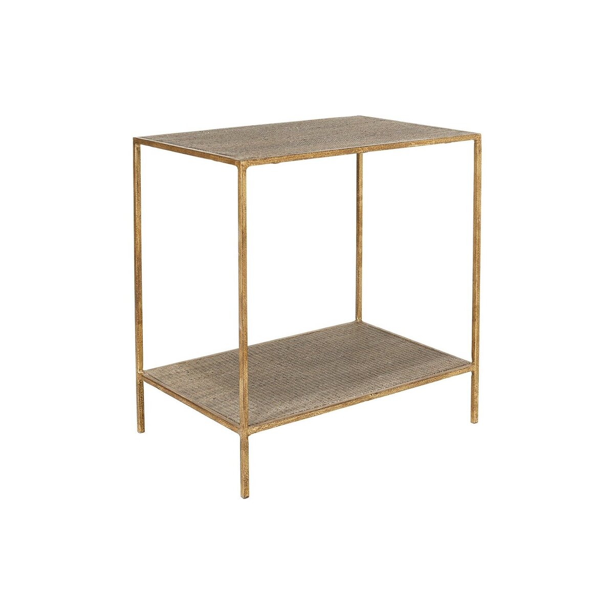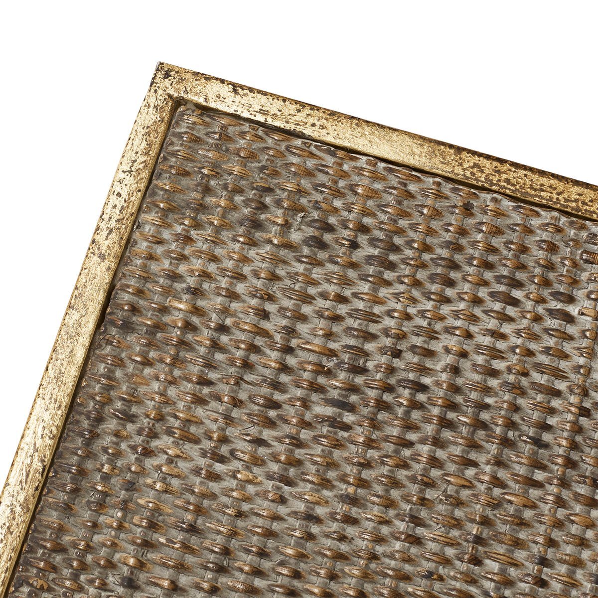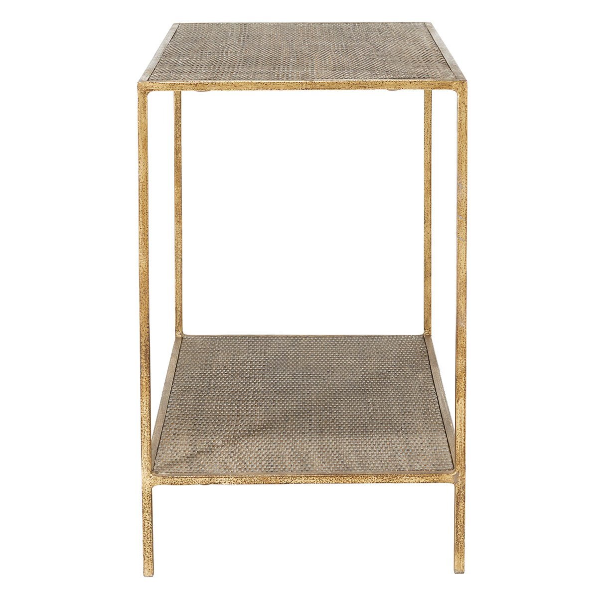 This geometric design features an iron frame with a distressed, hand-painted, antique gold finish. Two flat surfaces are crafted from handwoven Indonesian rattan, finished with grey paint and varnish. Part of the Baricella Side Table's is in its flexibility; it’s perfect for storing taller items, such as vases, stacks of books or records.