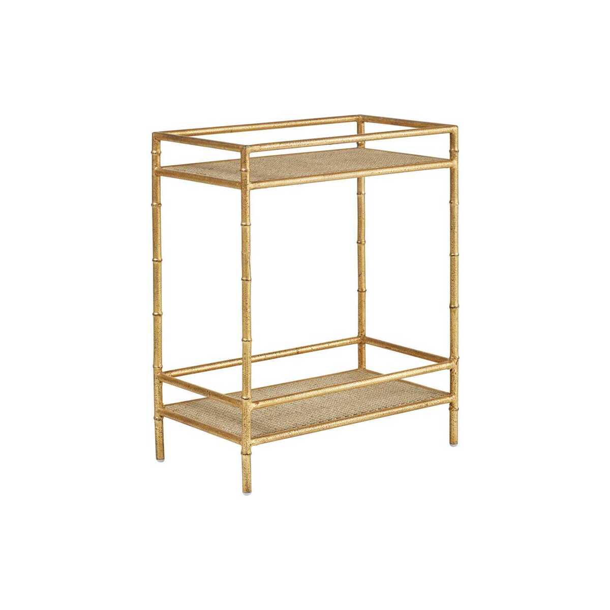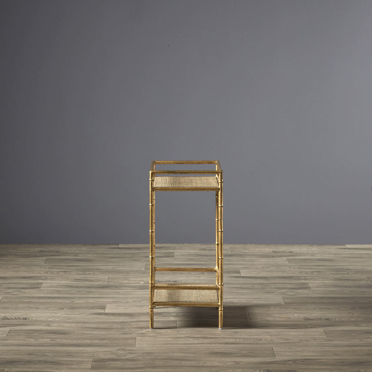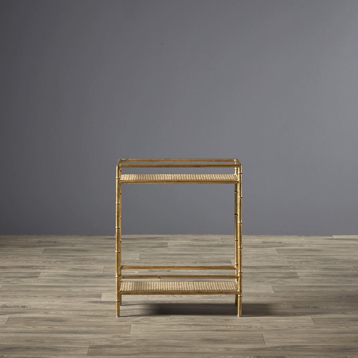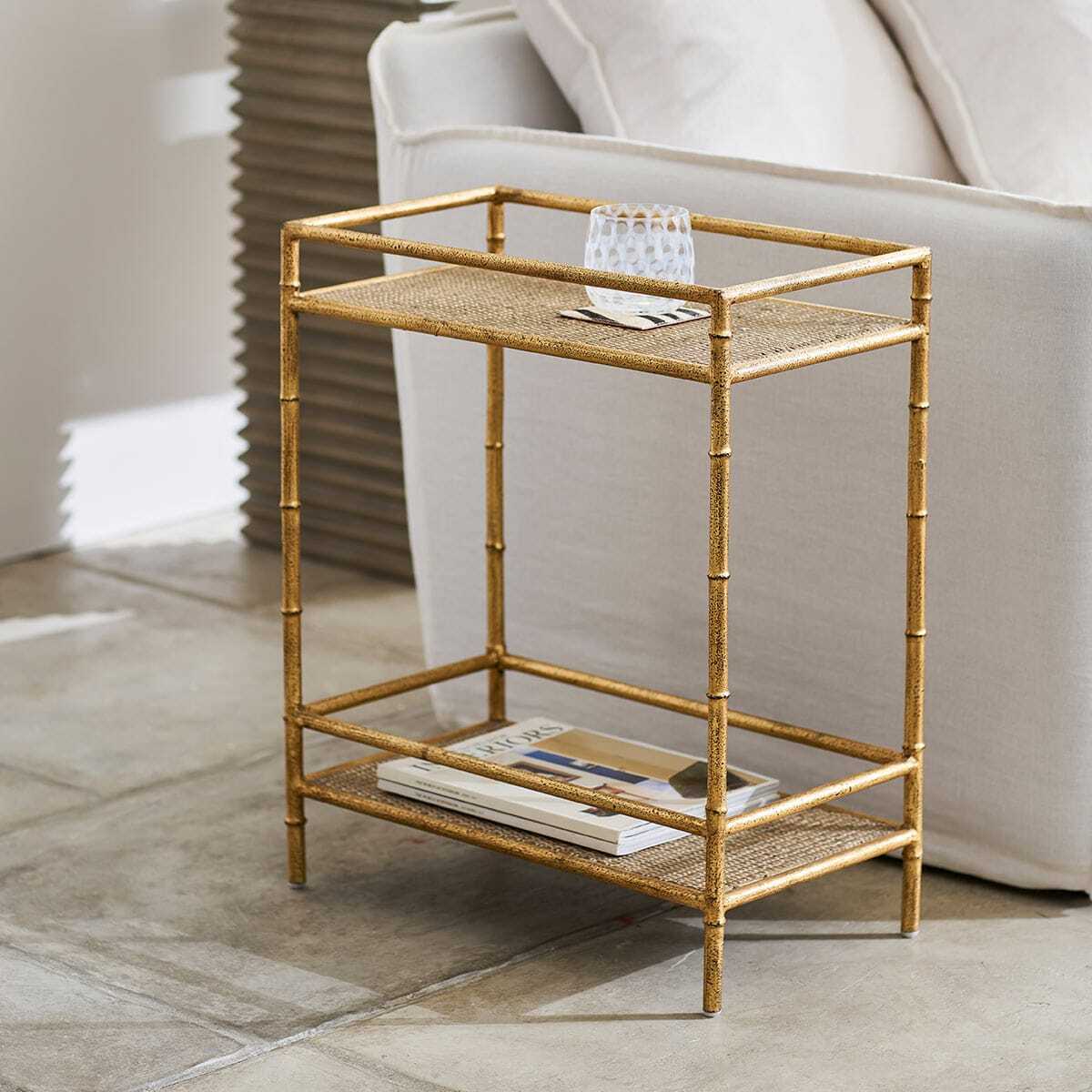 Making a feature of its bamboo-inspired iron frame - with a distressed hand-painted antique-gold finish - this geometric side table design also holds two table tops, handwoven from metal and finished with varnished grey paint to resemble real rattan. Beyond the charm of its golden frame, the beauty of this piece is that it's perfect for storing taller items, such as vases or a stack of books or records. Baricella Side Table With Shelves - Gold