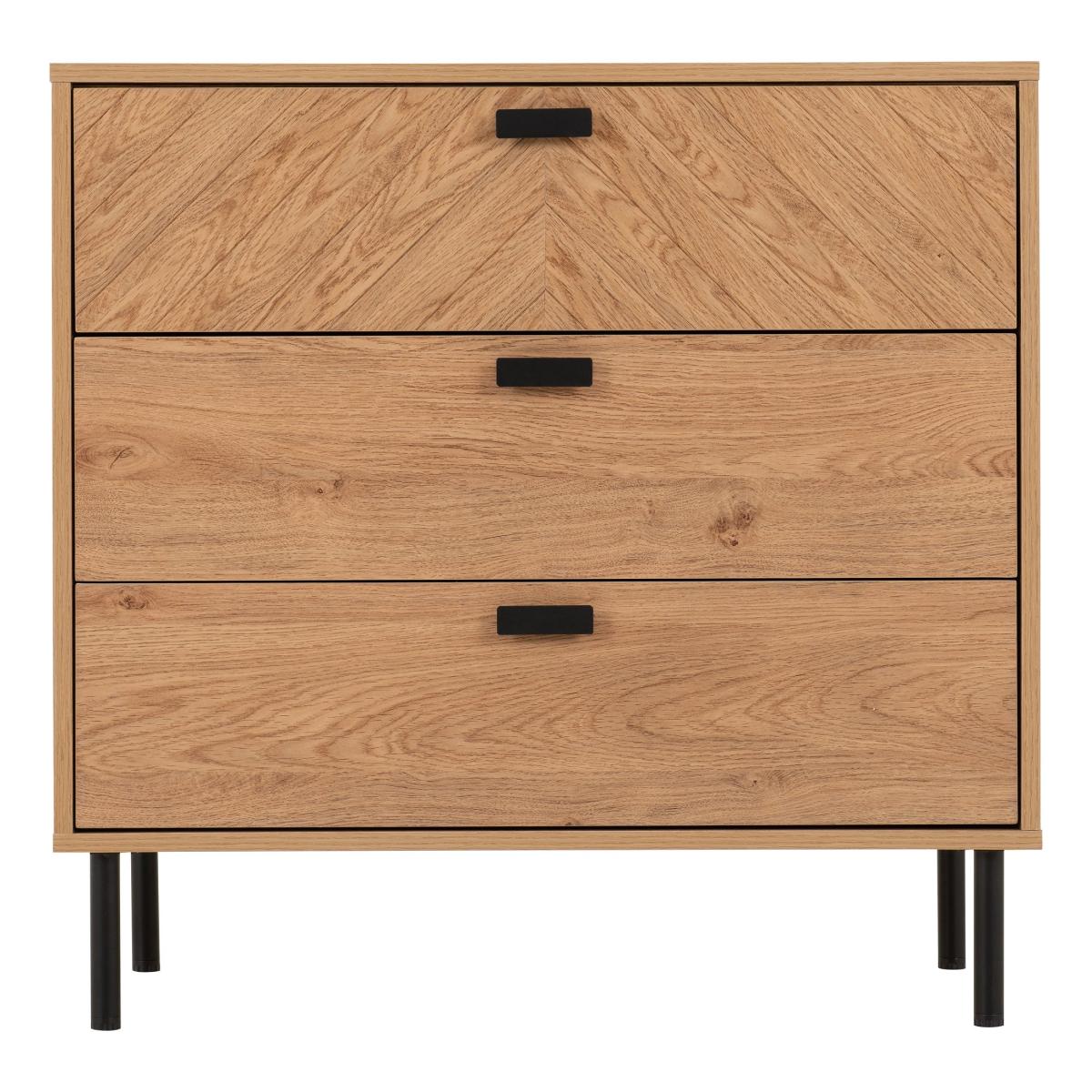 * Medium oak finish* Sleek black metal hardware* 3 spacious drawers This stunning piece is crafted in a medium oak effect, showcasing a charming wood grain finish that exudes natural elegance and sophistication. Perfectly suited for bedrooms, living rooms, or offices, the Leon chest of drawers offers ample storage while enhancing the room's aesthetic. Its three spacious drawers, adorned with durable black metal hardware, provide an ideal solution for organising clothes, accessories, or household items, ensuring everything has its place.