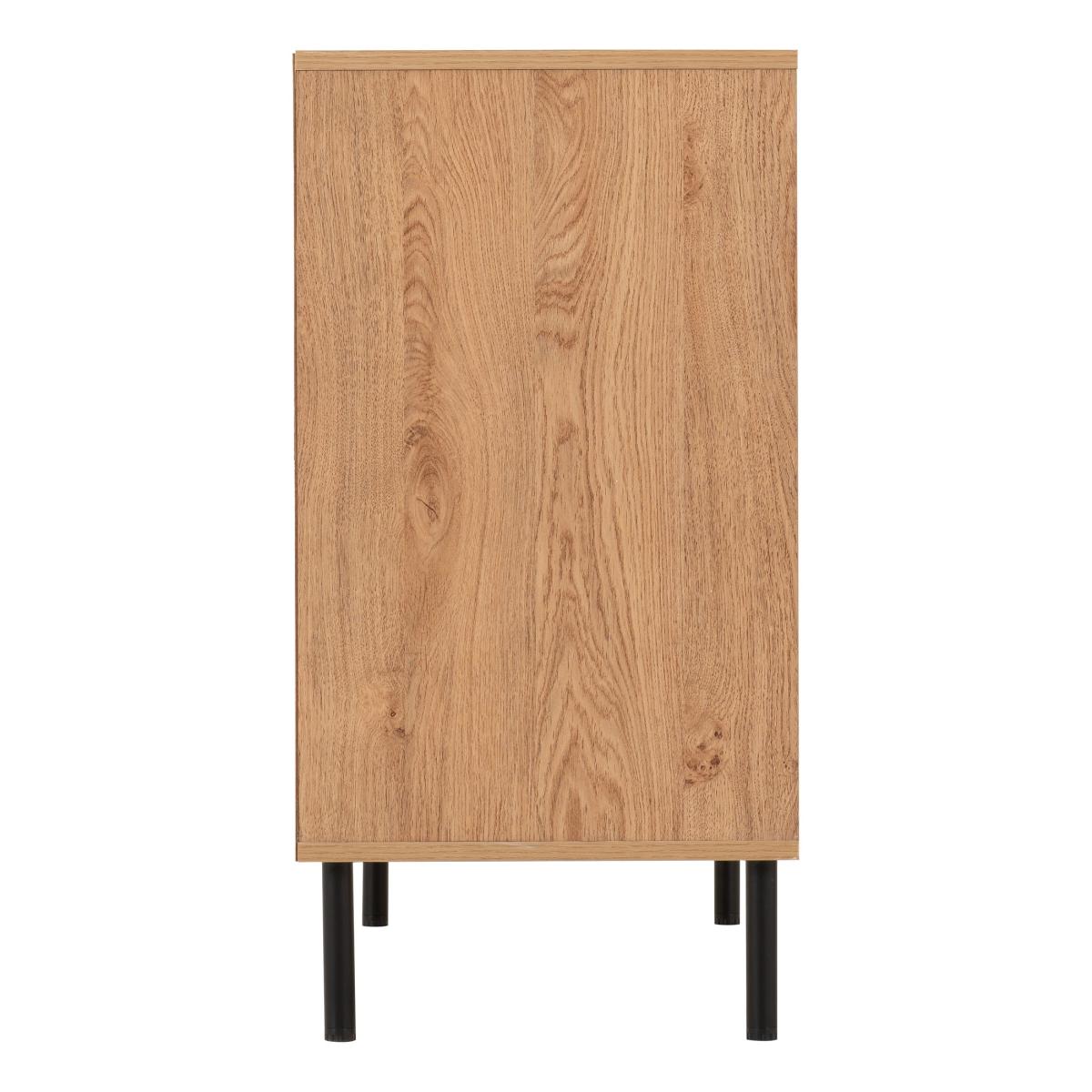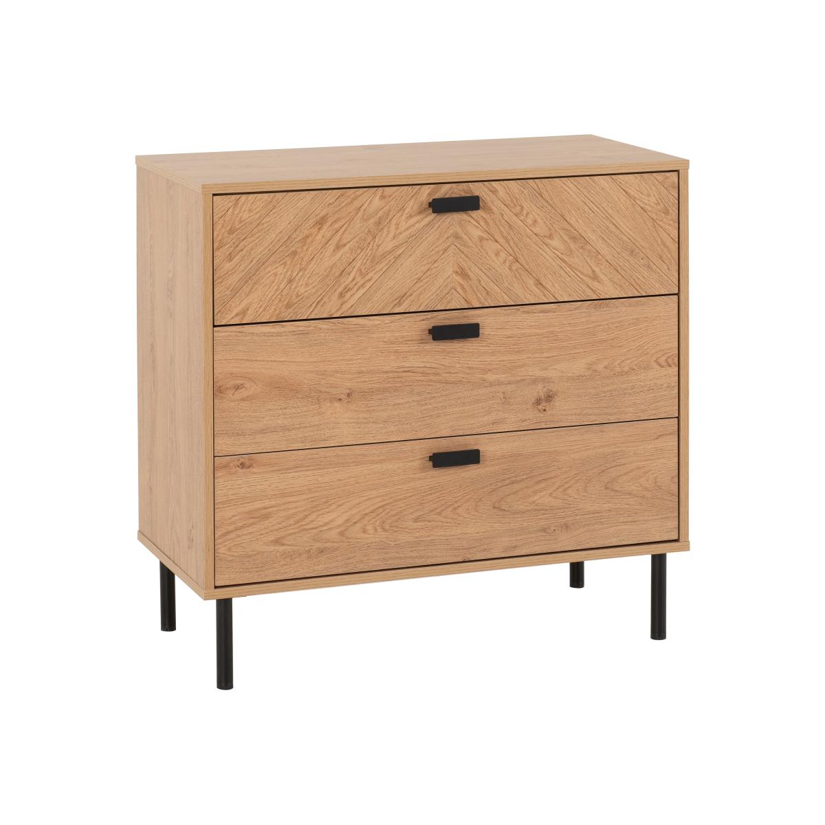 I’d choose this oak-effect three-drawer chest for its clean lines and natural warmth - it’s a versatile piece that slots easily into Scandinavian, mid-century or contemporary schemes. The subtle grain and matte black hardware give it just enough contrast to feel modern without overpowering a room. To style, keep the top surface simple: a low stack of books, a small ceramic vase of fresh greenery and a minimal table lamp. Tuck away bulky items inside the drawers to maintain a streamlined look, then add texture elsewhere in the room through a wool rug or linen cushions.