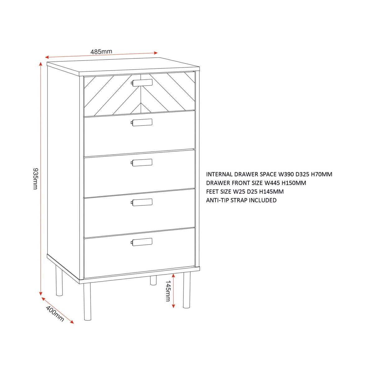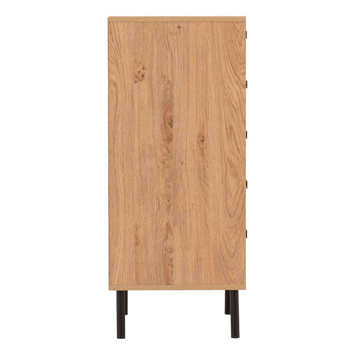 * Medium oak finish* Sleek black metal hardware* 5 spacious drawers This stylish piece is crafted in a medium oak effect, showcasing a charming wood grain finish that exudes natural elegance and sophistication. Perfectly suited for bedrooms, living rooms, or offices, this narrow chest offers ample storage while enhancing the room's aesthetic. Its five spacious drawers, adorned with durable black metal hardware, provide an ideal solution for organising clothes, accessories, or household items, ensuring everything has its place.