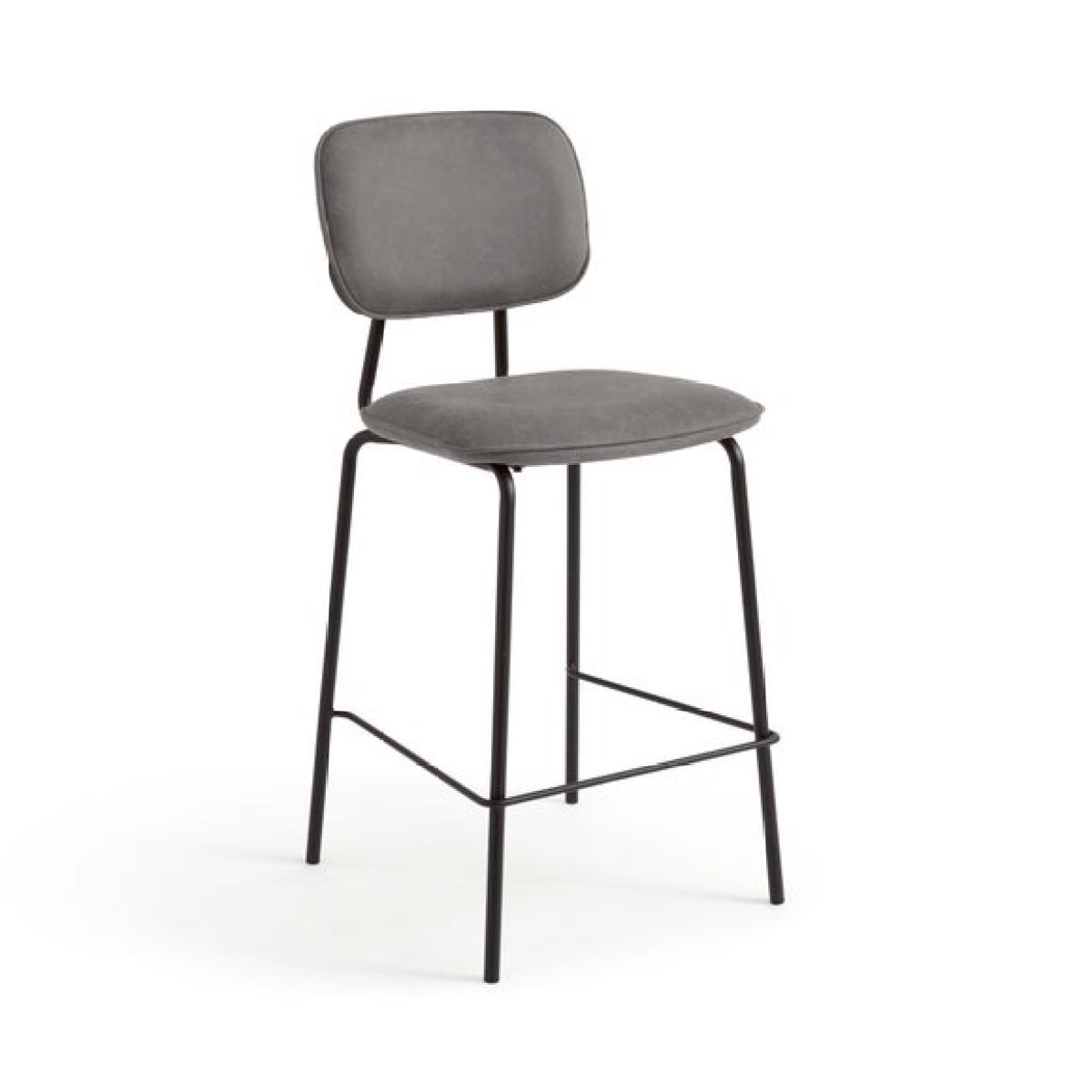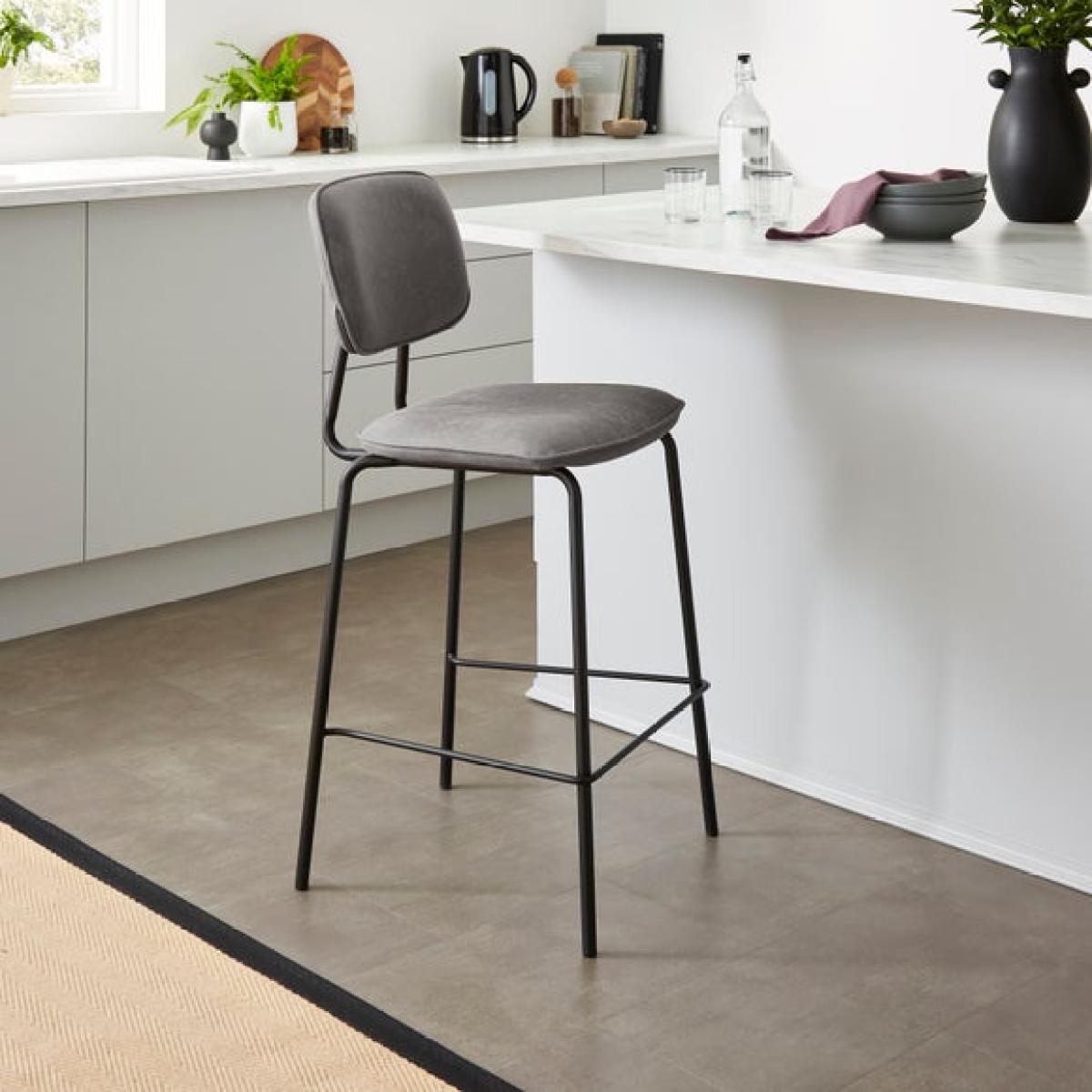 * Upholstered barstool * Trendy faux leather fabric * Metal legs Add a touch of modern comfort to your kitchen or breakfast bar with this sleek barstool from the Barker range. Upholstered in smooth faux leather, available in rich brown, cool grey, or earthy olive, it offers a stylish seating solution to suit any décor. The gently curved seat and supportive backrest provide comfort for everyday use, while the sturdy black metal legs add a contemporary edge.