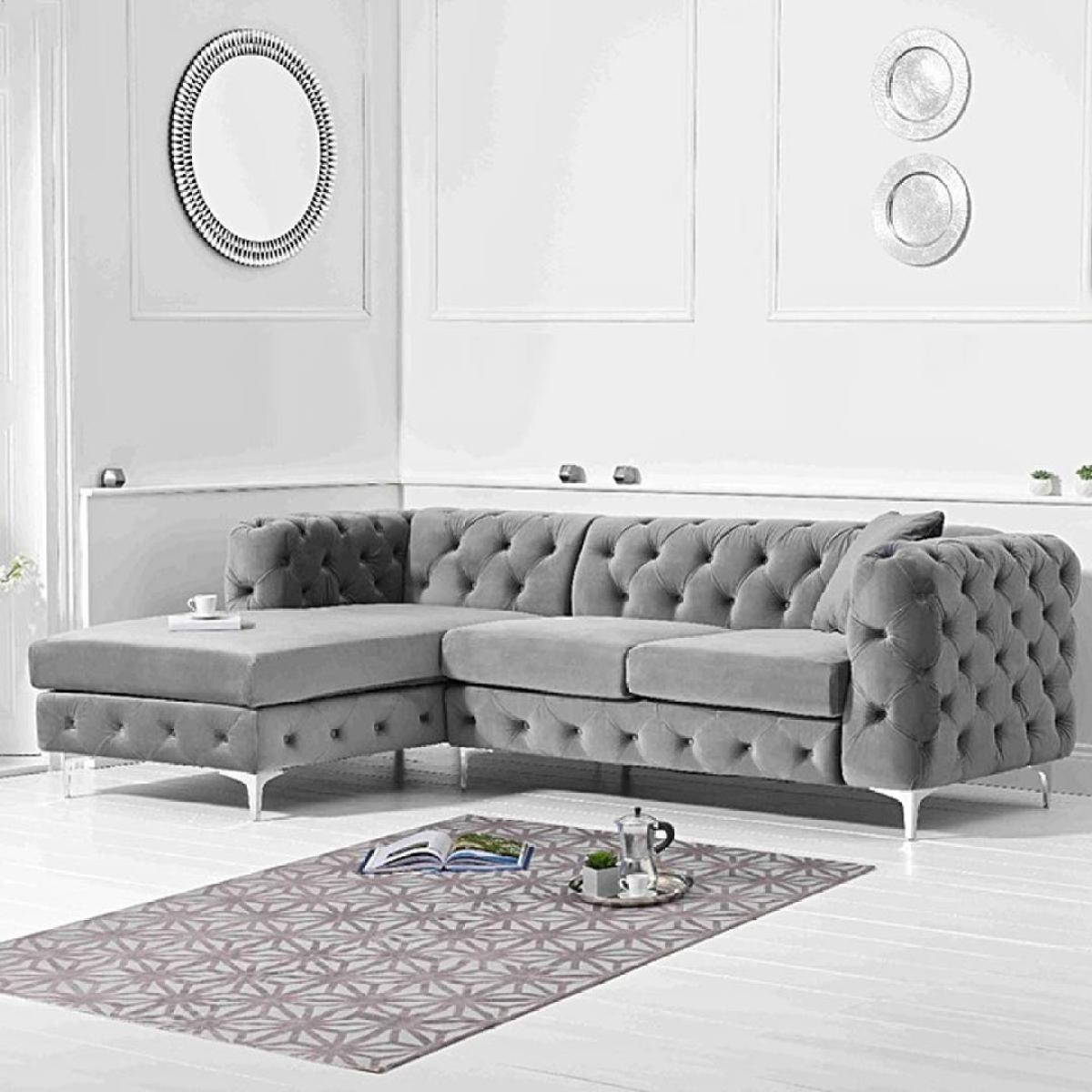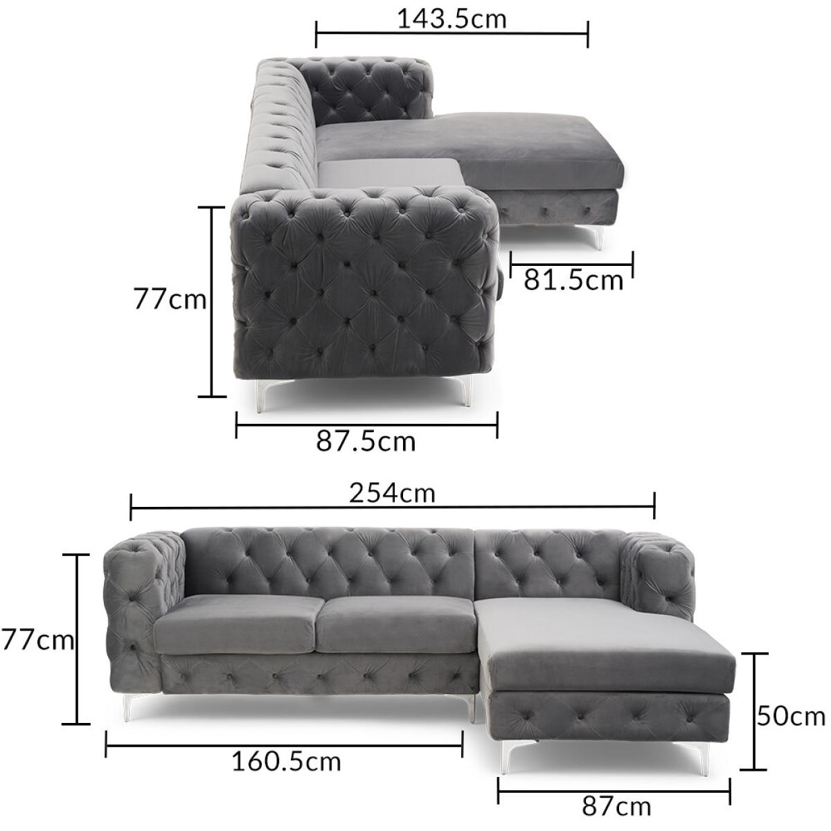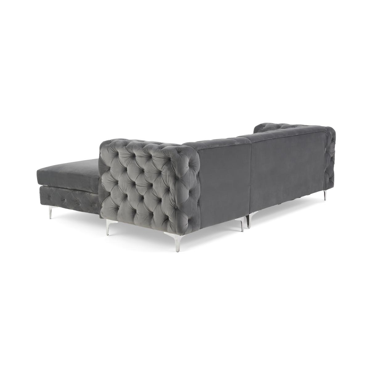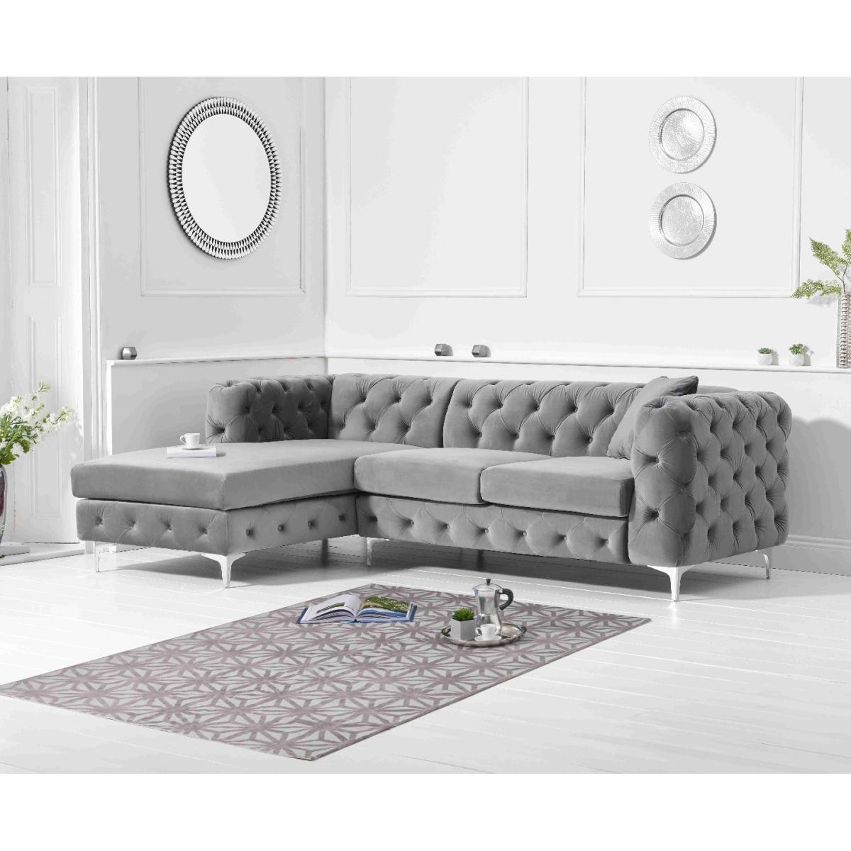 Comfort, luxury, design and elegance come together in the simply beautiful Barker left facing chaise sofa. Classic Chesterfield charm is paired with contemporary metal detailing and ultra-padded foam filled cushions for a comfortable and elegant finish. Chesterfield-inspired design. Beautifully upholstered in delicate grey velvetLeft facing chaise sofa. Luxuriously padded for extra comfort