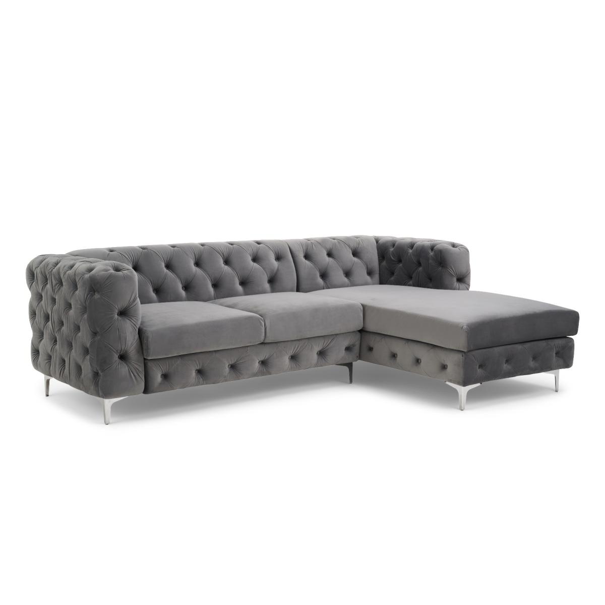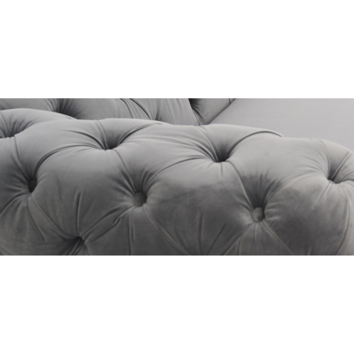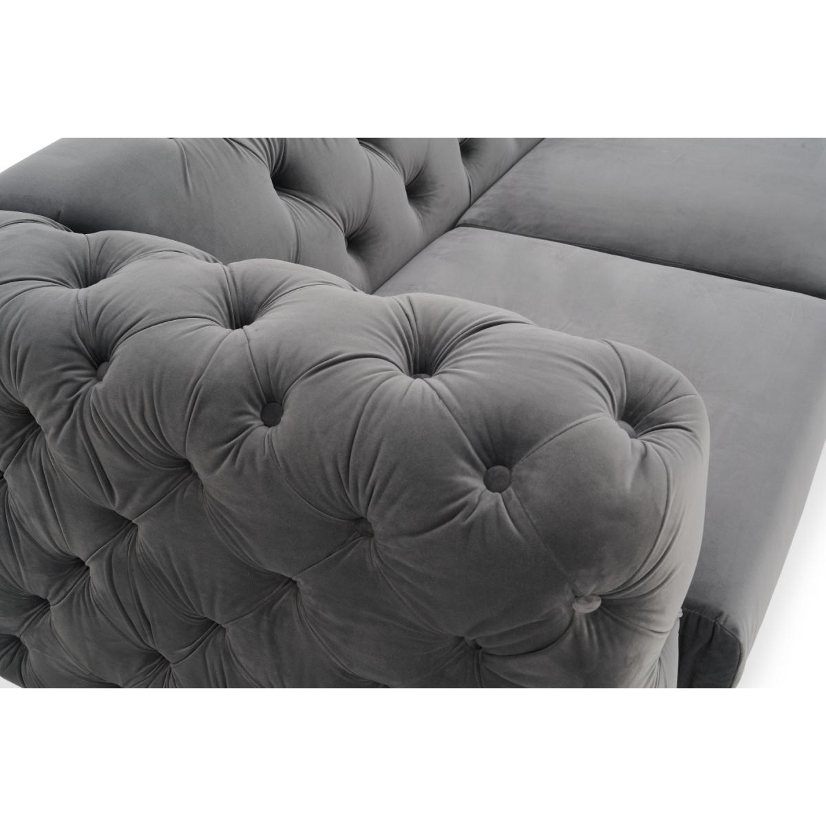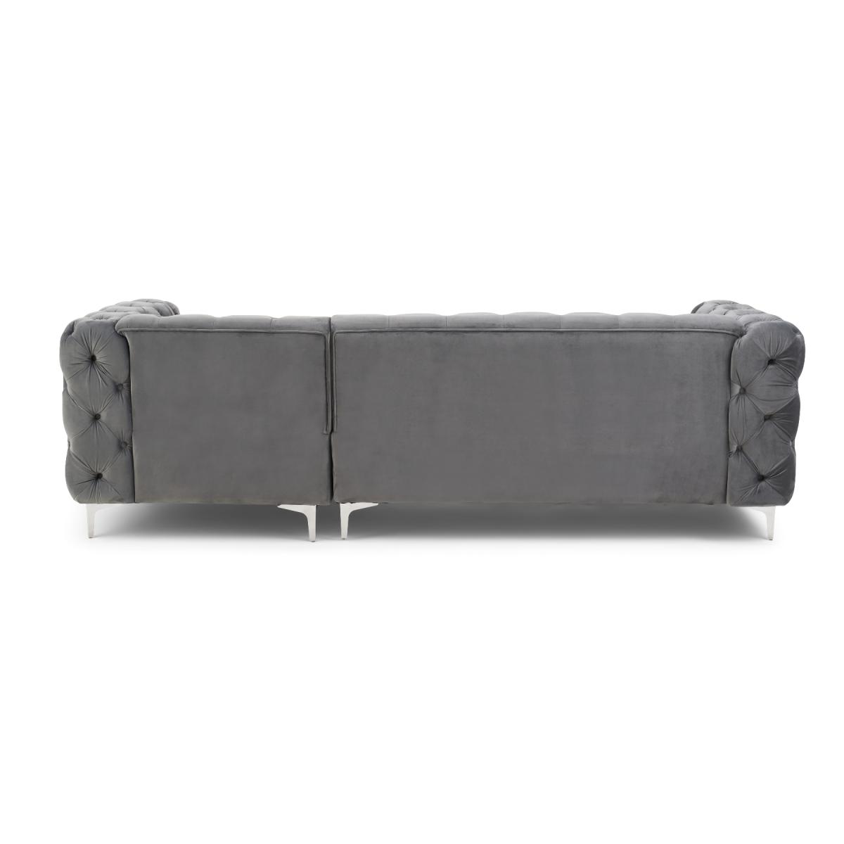 Comfort, luxury, design and elegance come together in the simply beautiful Barker left facing chaise sofa. Classic Chesterfield charm is paired with contemporary metal detailing and ultra-padded foam filled cushions for a comfortable and elegant finish. Chesterfield-inspired design. Beautifully upholstered in delicate grey velvetLeft facing chaise sofa. Luxuriously padded for extra comfort