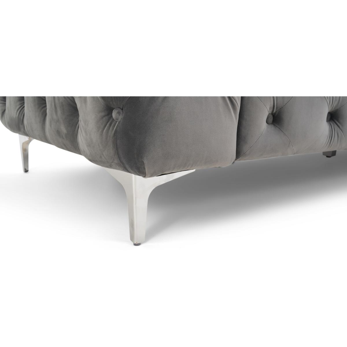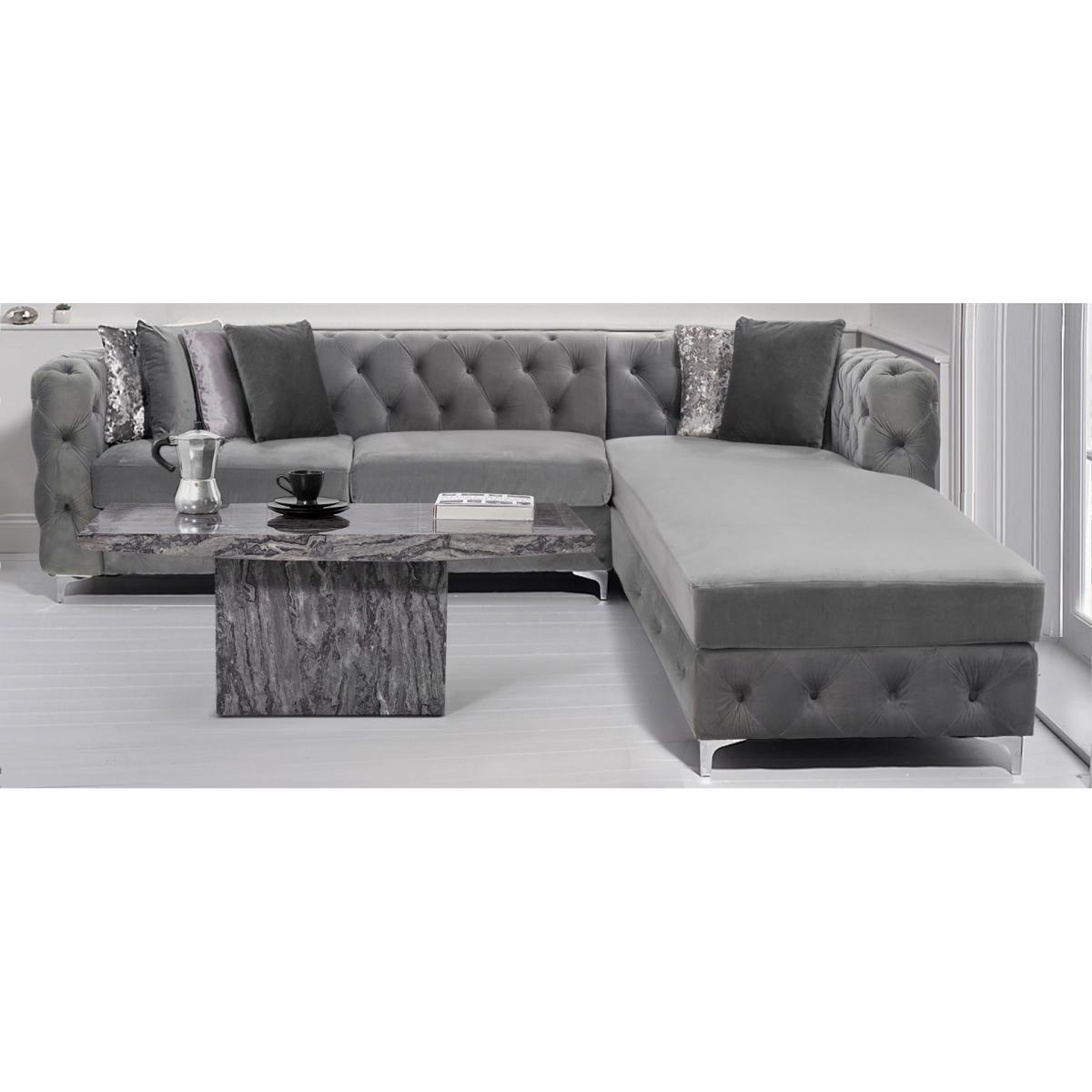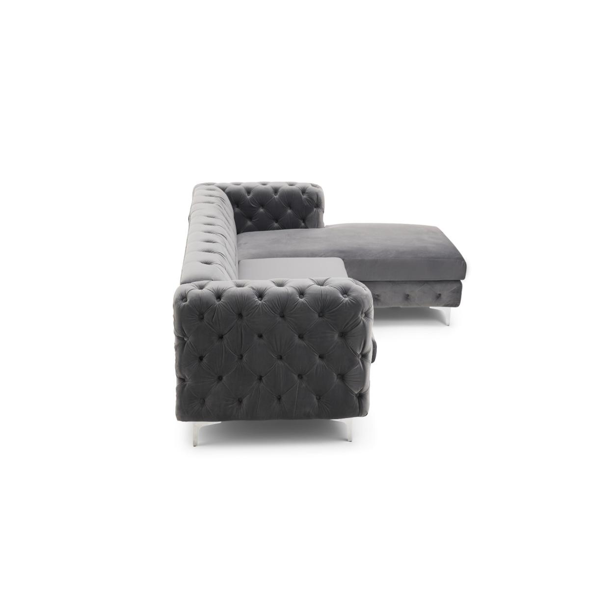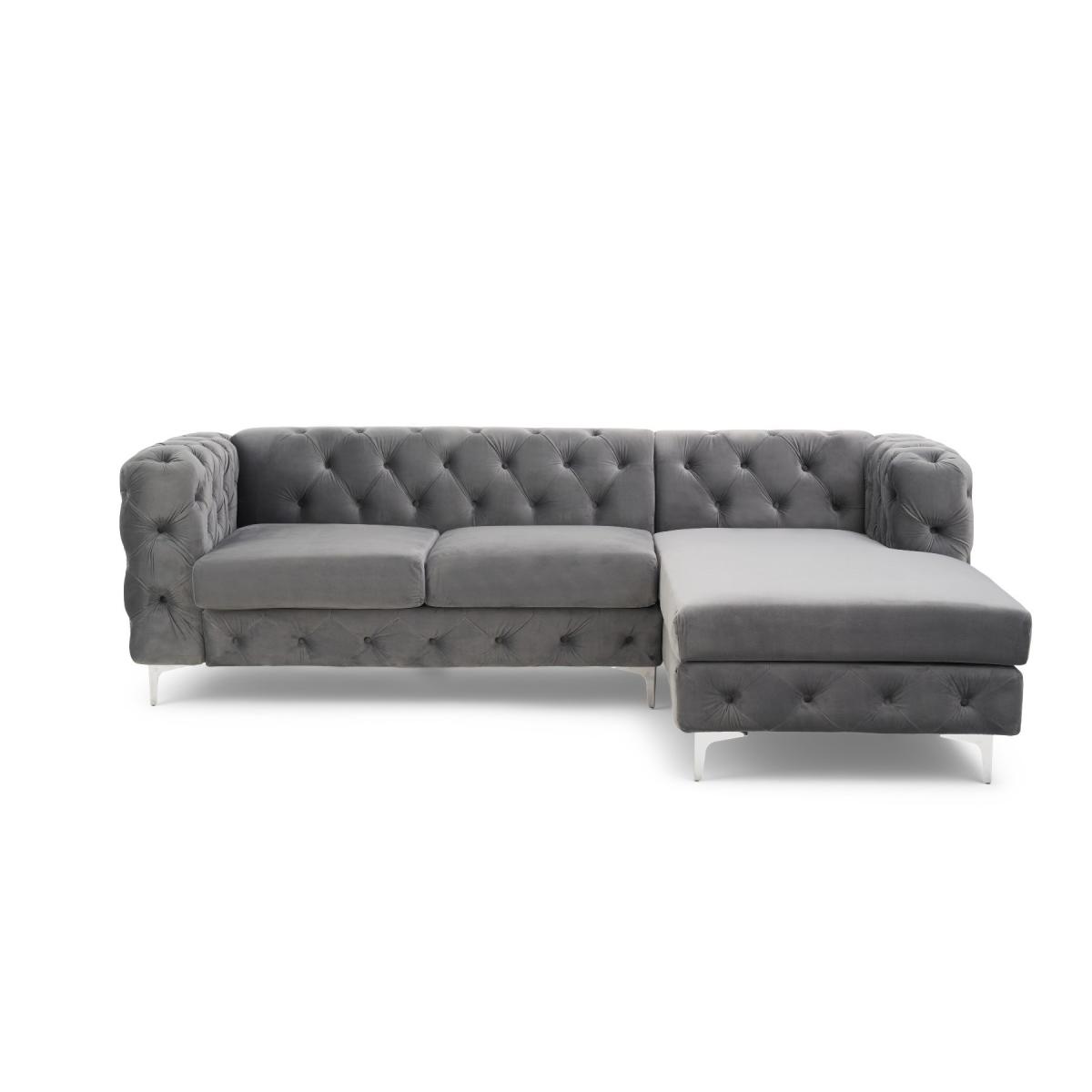 Comfort, luxury, design and elegance come together in the simply beautiful Barker left facing chaise sofa. Classic Chesterfield charm is paired with contemporary metal detailing and ultra-padded foam filled cushions for a comfortable and elegant finish. Chesterfield-inspired design. Beautifully upholstered in delicate grey velvetLeft facing chaise sofa. Luxuriously padded for extra comfort