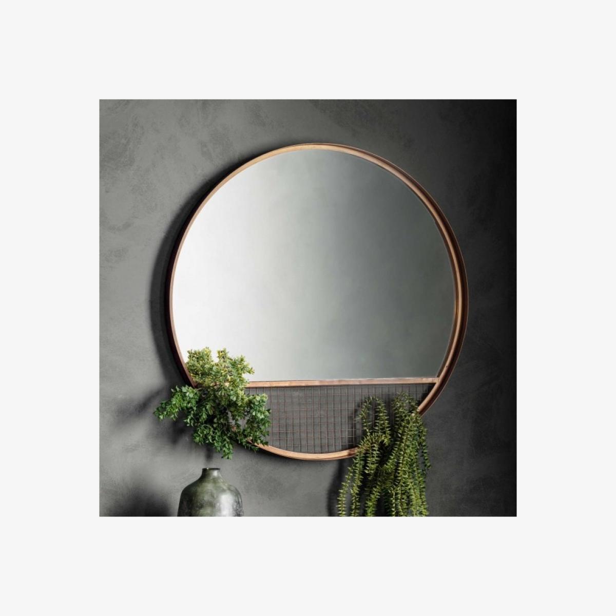 Shape: Round. Material:Glass / MDF / Iron. Colour/Finish: Bronze. This mirror with its smart bronze metal frame adds a contemporary feel to your home.