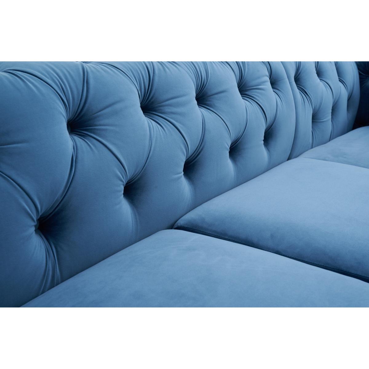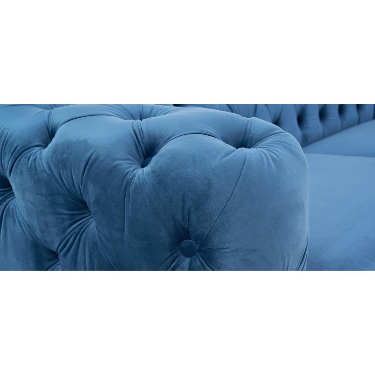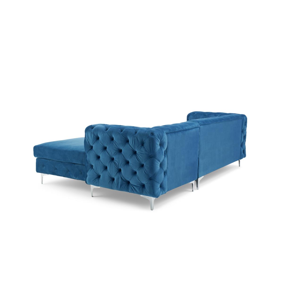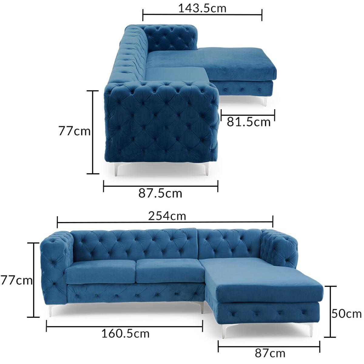 An allover Chesterfield inspired design is the statement style of the Barker collection. The deep-buttoning is luxurious and timeless, whilst the high armrests add a touch of modern elegance and the foam filled cushions provides a comfortable seat. Modern allover deep-buttoning. Chesterfield-inspired design. Expertly upholstered in luxurious blue velvet. Right facing chaise