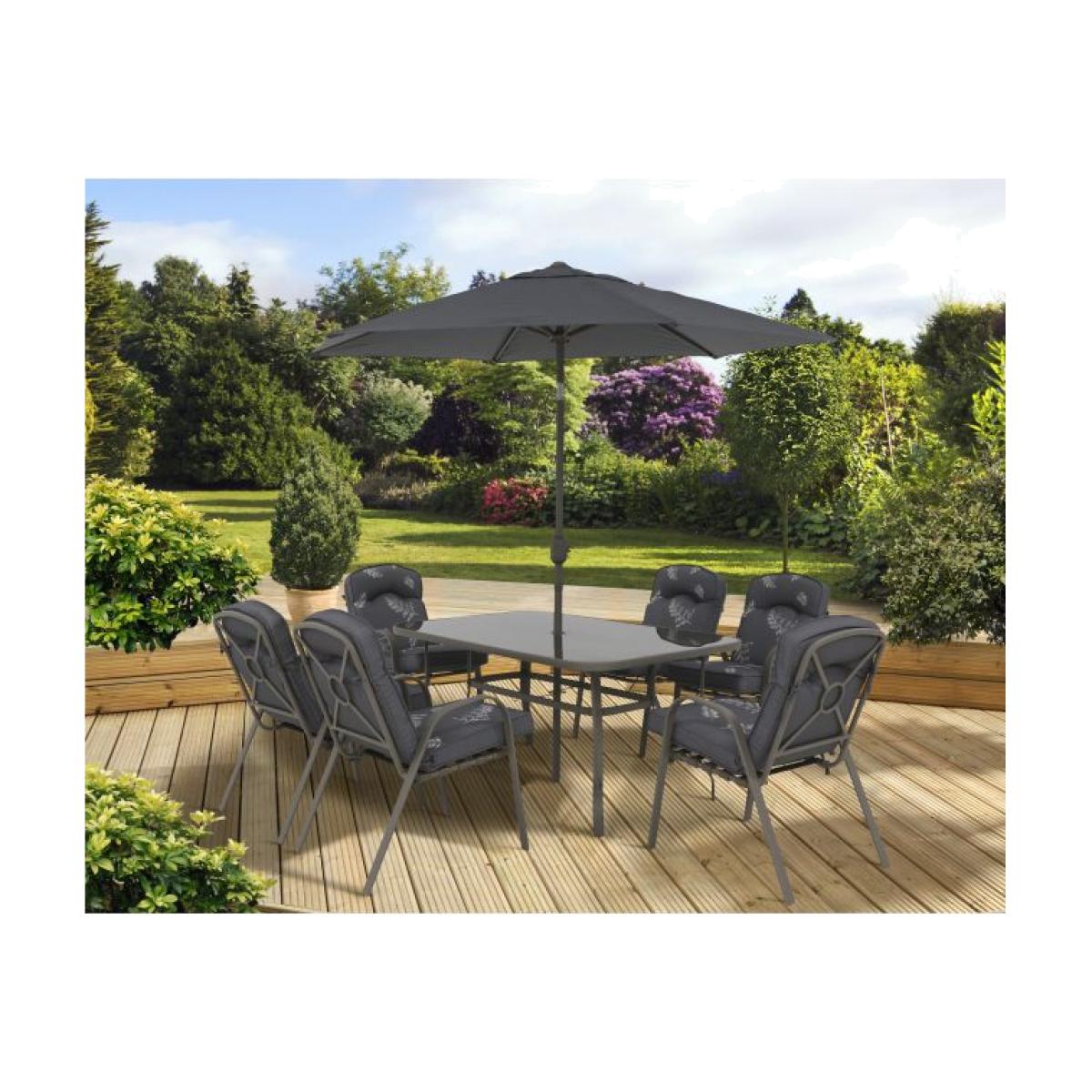 The Barkston 6-Seater Set comes with 6 stacking chairs, 1 rectangular table and a 2.5m parasol featuring a crank and tilt mechanism. The cushions have been updated for Summer 2022 in a fresh and eye-catching elegant leaf pattern on a grey background. All that's left is to sit back and relax in your outdoor space. The glass tabletop is made of 5mm coloured tempered glass. Seat and back cushions are 9cm deep. The frame is made of steel. Chair Dimensions: Width 60cm x Depth 80cm x Height 91cm Table Dimensions: Width 152cm x 96cm Depth x 74 cm Height Parasol Pole Diameter: 38mm Assembly of the table is required A parasol base is available to purchase separately All screens vary in colour reproduction and whilst every effort has been made to display the colour as accurately as possible it is for guidance only.