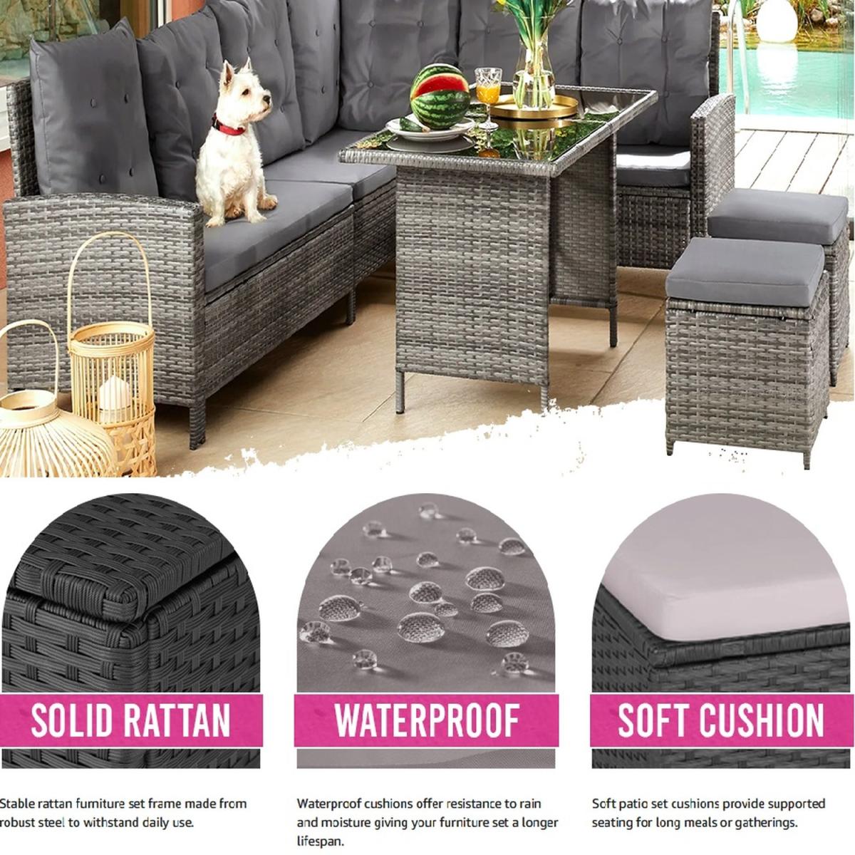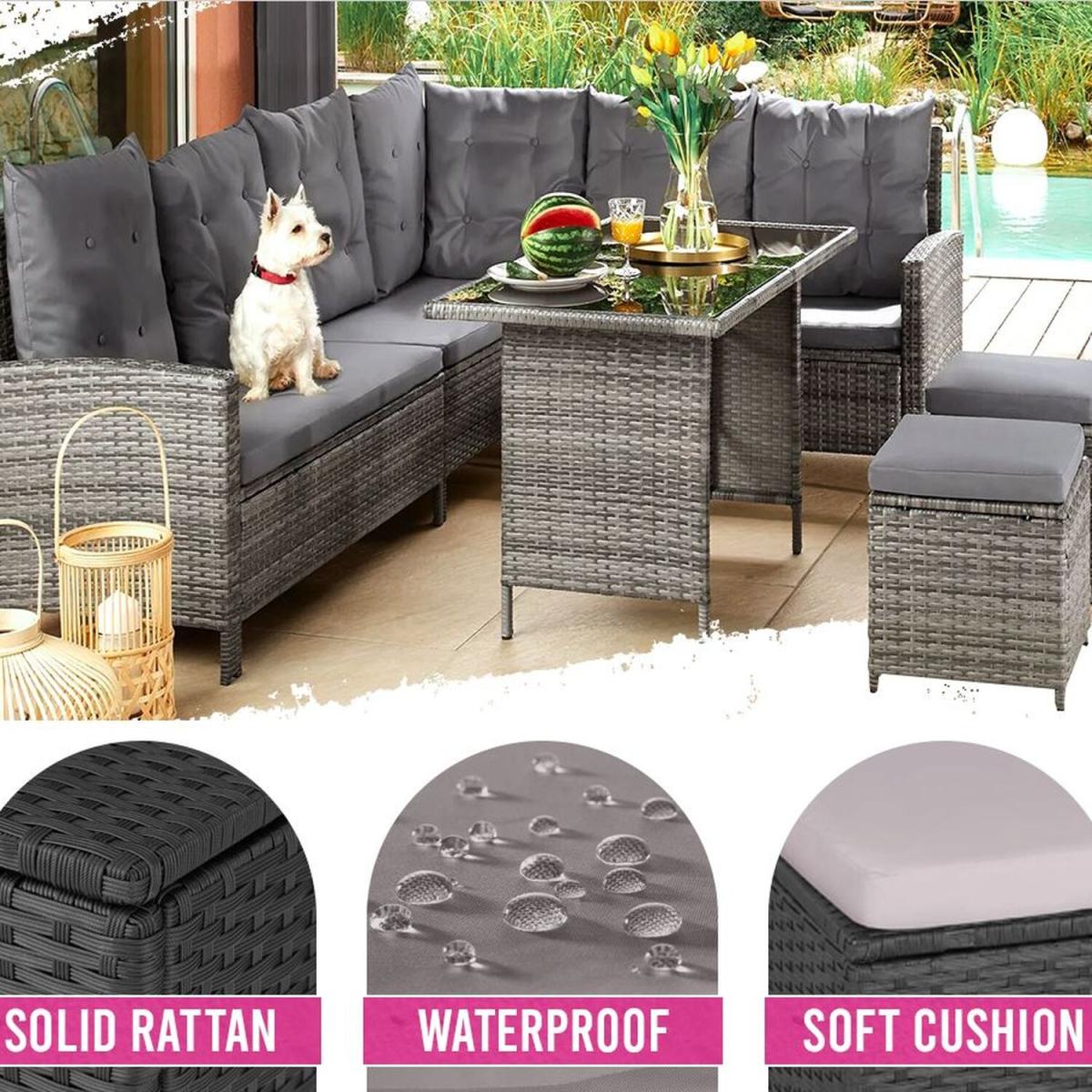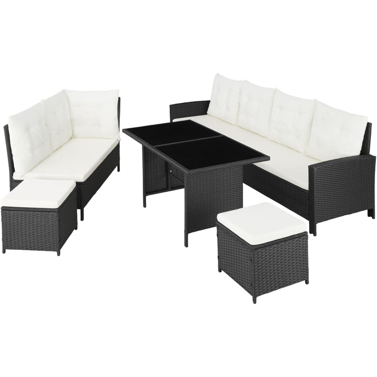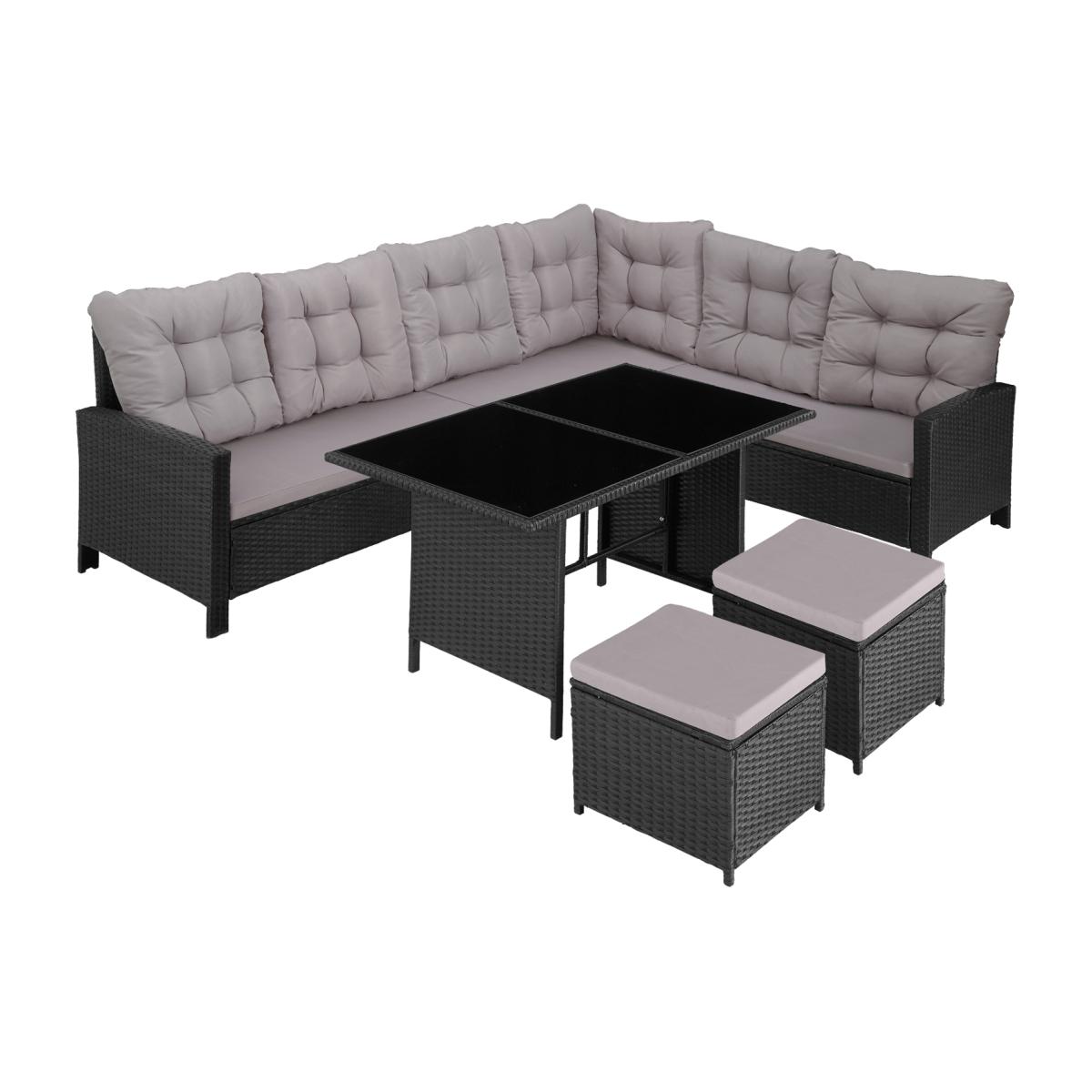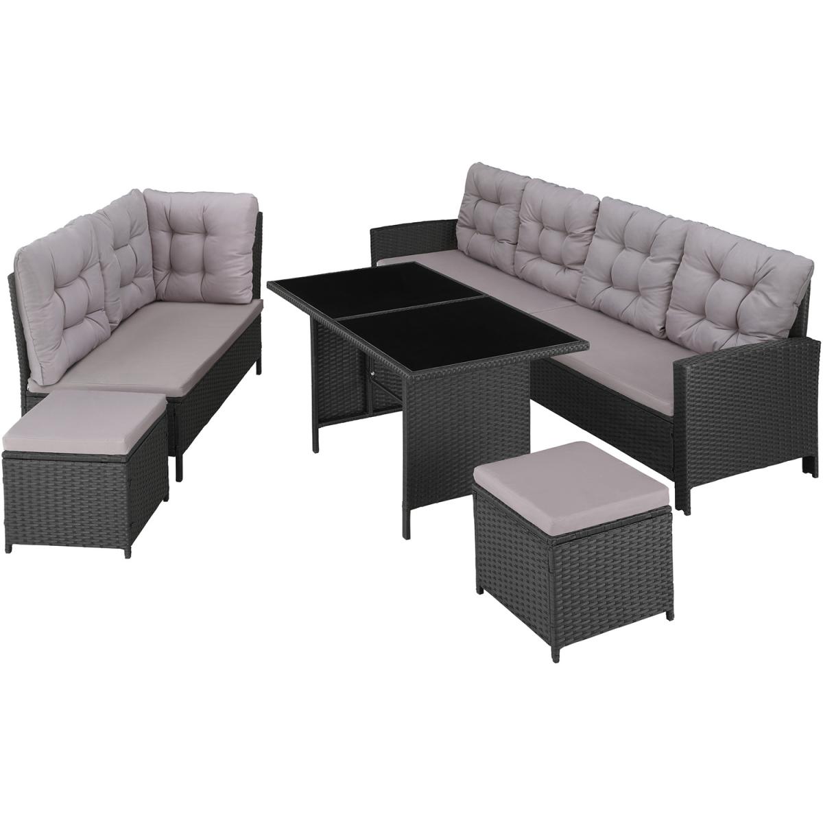 Enjoy cosy, convivial moments with your family and friends on this generous rattan garden furniture set from tectake. This rattan garden furniture offers soft cushions and flexible stools, which can be used as extra seats or comfortable footrests, a comfy and spacious sofa and an elegant glass plate table which altogether ensure relaxed and exclusive outdoor lounge vibes and can also be used for dining on too. The individual elements of this lounge set are adjustable and can be arranged and rearranged with elegant finesse, including into a corner seater. The strong steel base and the durable poly rattan weave guarantee that this rattan garden furniture set from tectake is very durable.