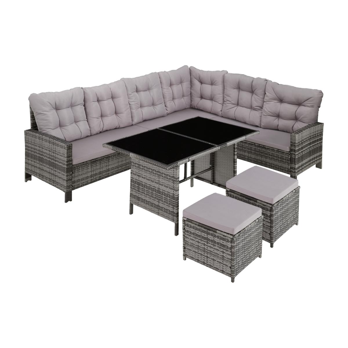 Enjoy cosy, convivial moments with your family and friends on this generous rattan garden furniture set from tectake. This rattan garden furniture offers soft cushions and flexible stools, which can be used as extra seats or comfortable footrests, a comfy and spacious sofa and an elegant glass plate table which altogether ensure relaxed and exclusive outdoor lounge vibes and can also be used for dining on too. The individual elements of this lounge set are adjustable and can be arranged and rearranged with elegant finesse, including into a corner seater. The strong steel base and the durable poly rattan weave guarantee that this rattan garden furniture set from tectake is very durable.