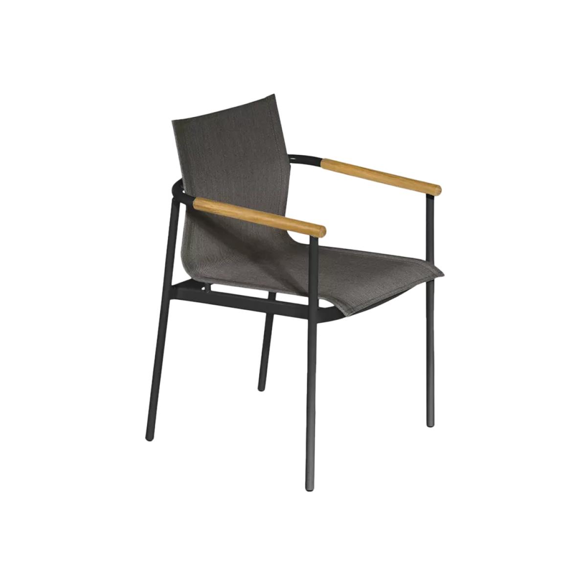 Barlow Tyrie's Around garden furniture range features refined powder-coated aluminium frames in a sleek profile. This garden chair has a comfortable, woven sling back and seat and beautiful, gently curved teak wood armrests. The weather-resistant design is stackable for easy storage.