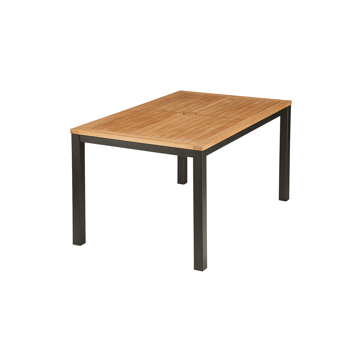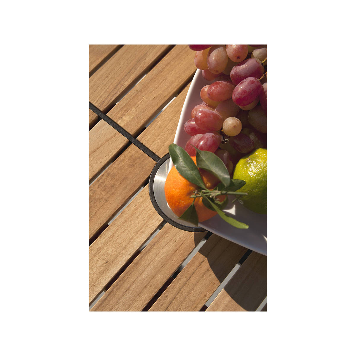 The Aura outdoor dining table offers a sophisticated place to eat and drink with friends, as you while away long summer evenings. The table comes ready with a parasol hole and hole cover. It's sleek and angular, providing style as well as comfort, with a weatherproof elegance that will last for seasons to come. The design features an FSC-certified teak wood surface.