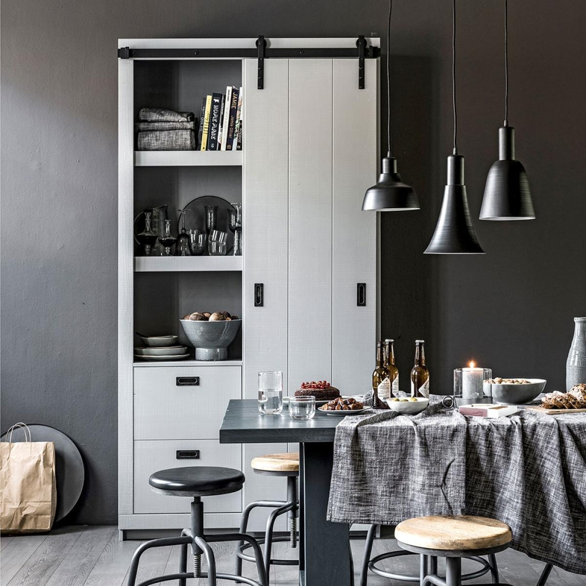 I love this white barn cabinet with sliding doors for its clean, modern aesthetic and functional design. It works particularly well in contemporary or Scandinavian-inspired interiors, where its simplicity complements minimal clutter and enhances the sense of space. Practical styling tips include using open shelving to display essentials or décor pieces, while keeping the sliding doors closed for a streamlined look. Pair it with neutral tones and natural textures to maintain a calm, cohesive vibe, or introduce contrasting colours through accessories for a bolder statement. Its versatile style makes it ideal for kitchens, dining areas, or even living rooms, adding both storage and visual interest without overwhelming the space.