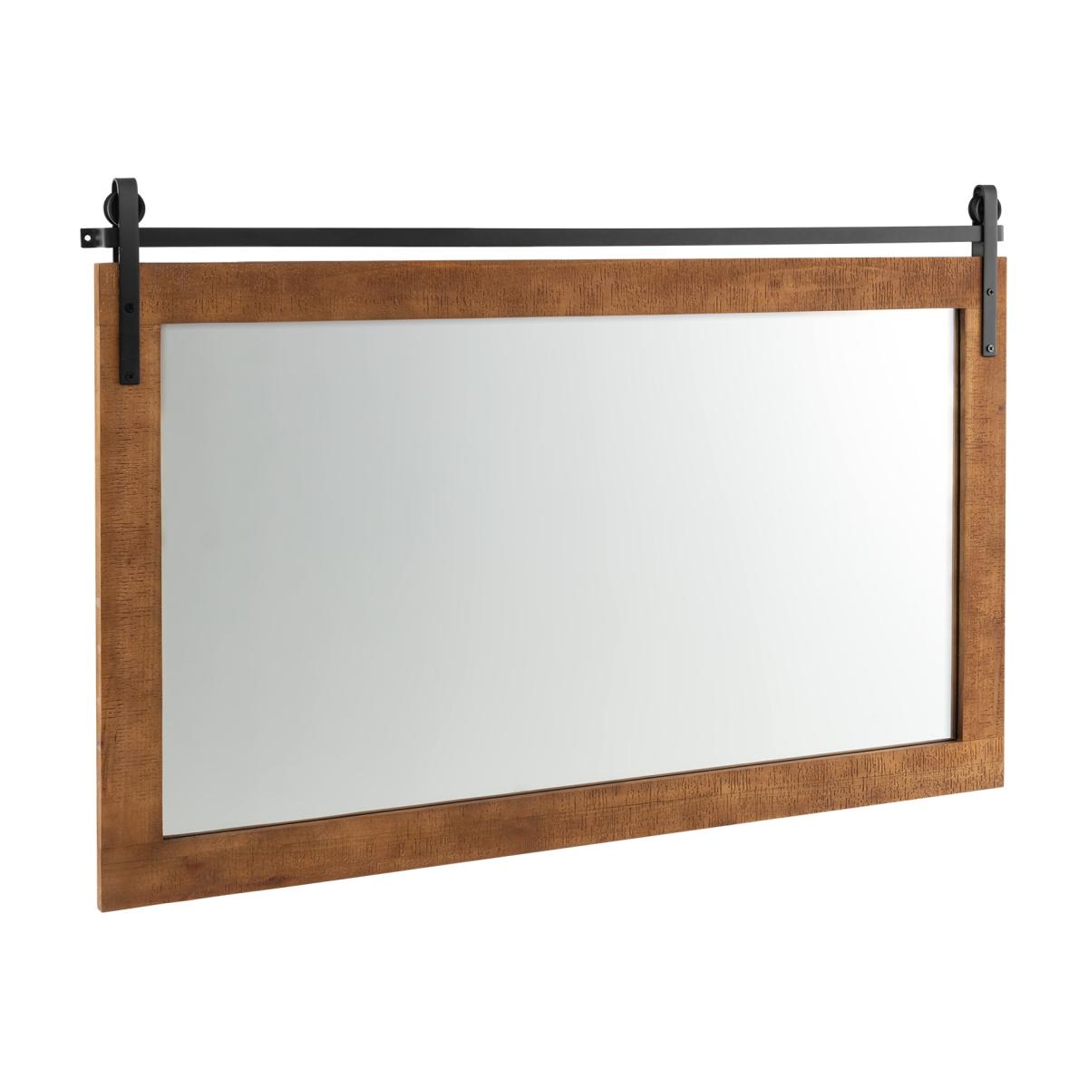 Add a rustic touch to your room with our farmhouse-style mirror. This decorative mirror features a natural wood grain finish and a unique metal frame giving it a distinct and classic appearance that creates a warm and inviting atmosphere in any space, including living rooms, bathrooms, or entrance halls. Furthermore, simplify your indoor decor with its versatile dimensions), which make it effortless for the mirror to fit seamlessly into any room.