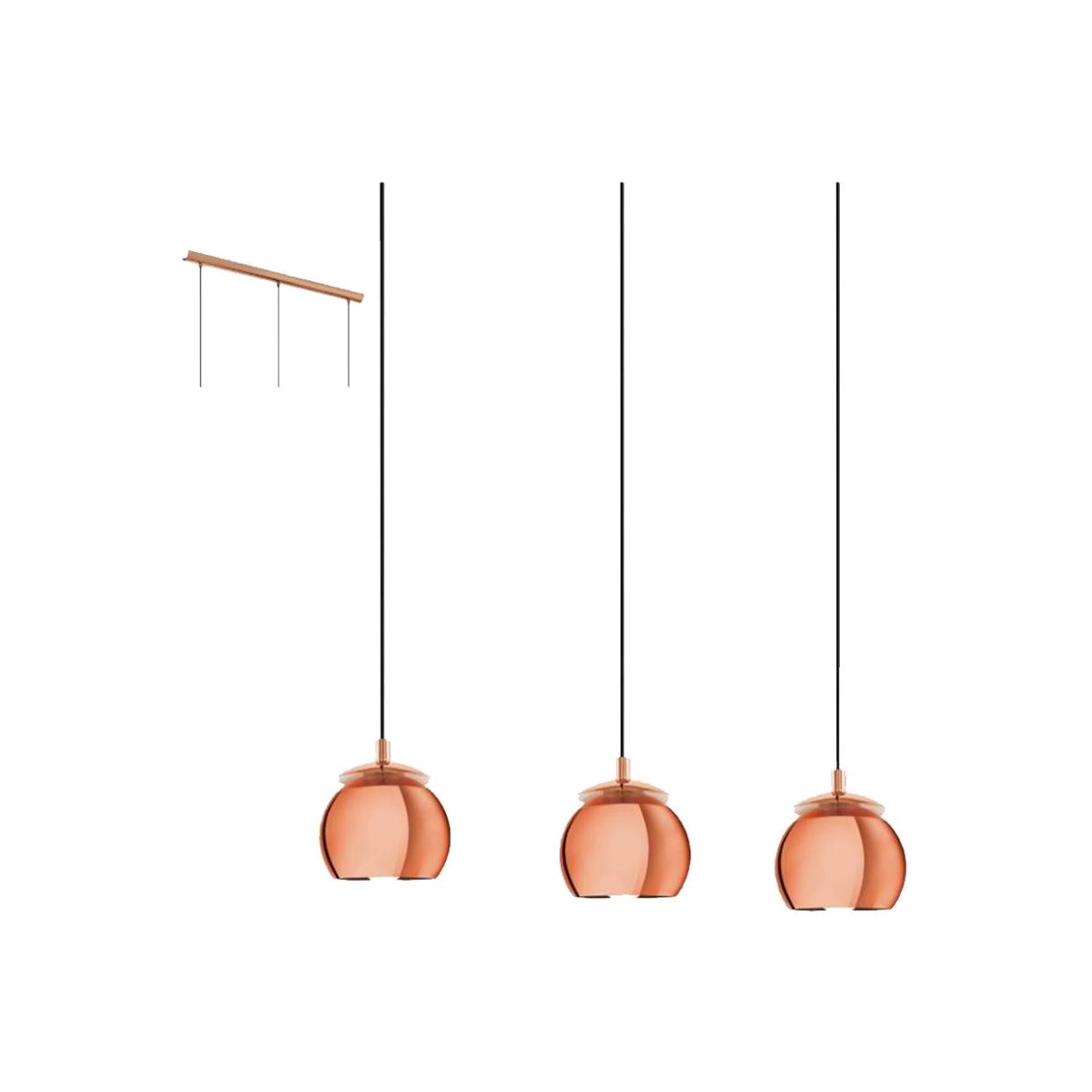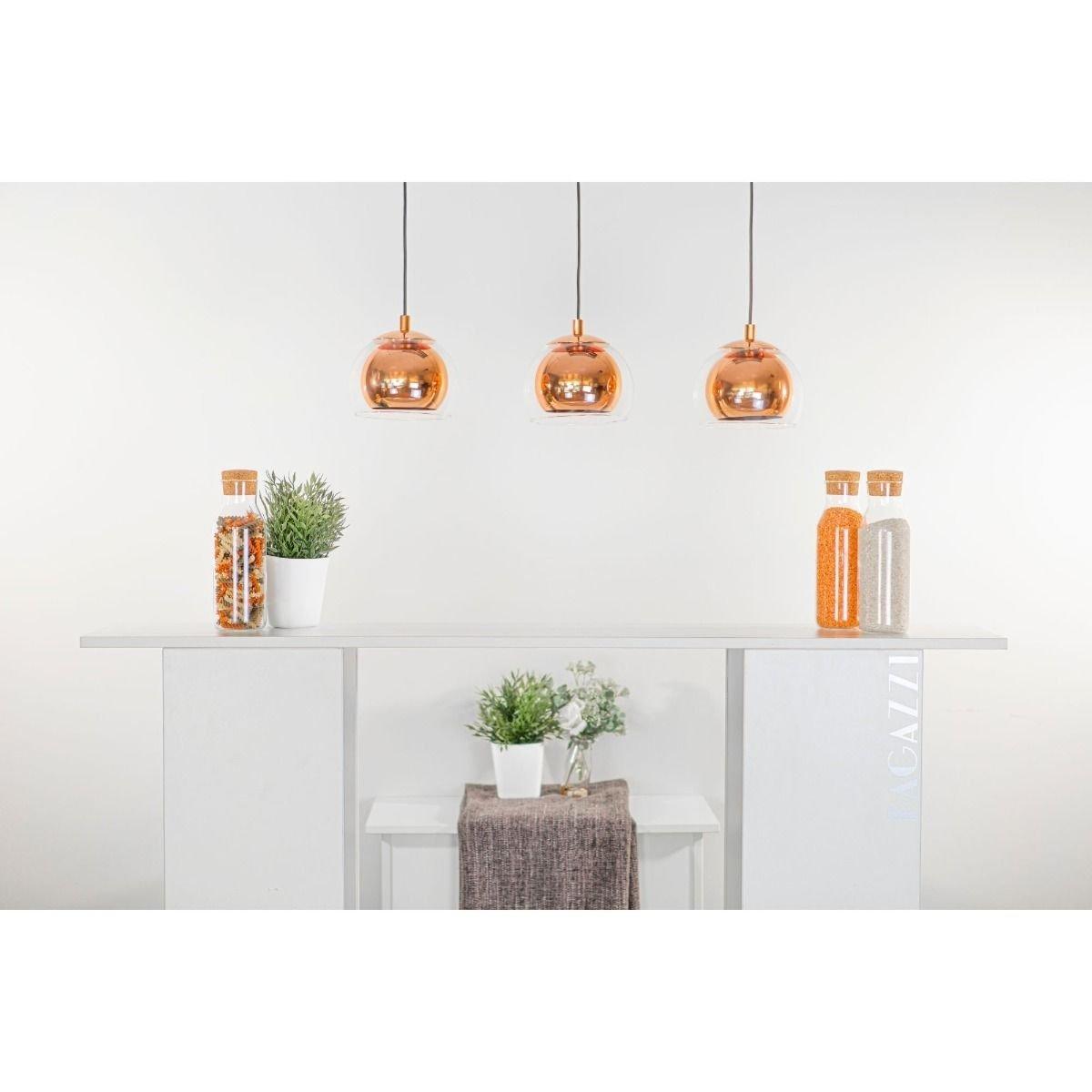 Contemporary Pendant Ceiling Light with copper finish. The Barnet 3 light pendant features a straight, copper ceiling bar from which the pendant wires attach. The outer glass shades connect at the bottom of the wire via a cylindrical, copper attachment. Within the clear glass shades, there are inner copper shades which house the bulbs. Style this light with one of our vast selection of LED E27 light bulbs.