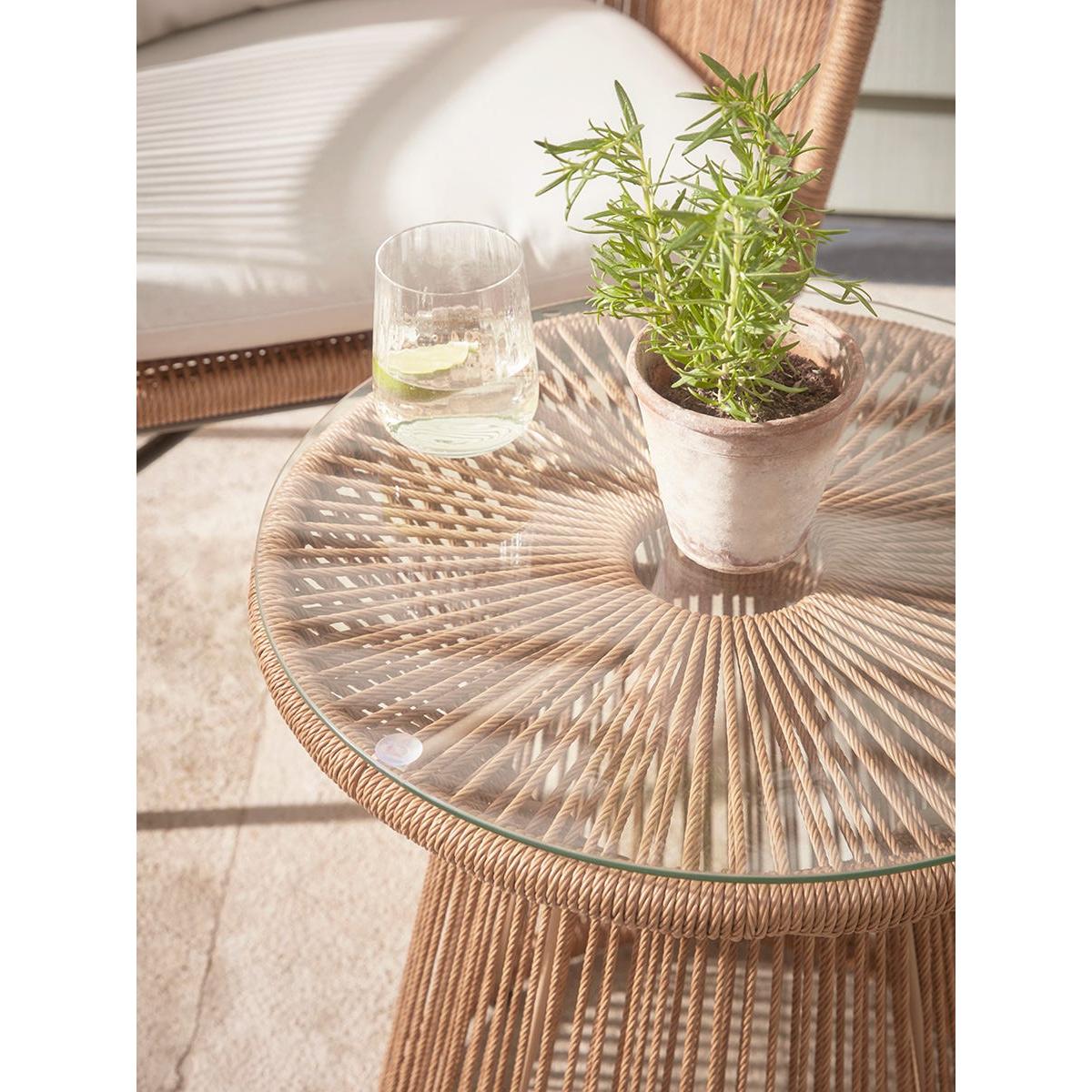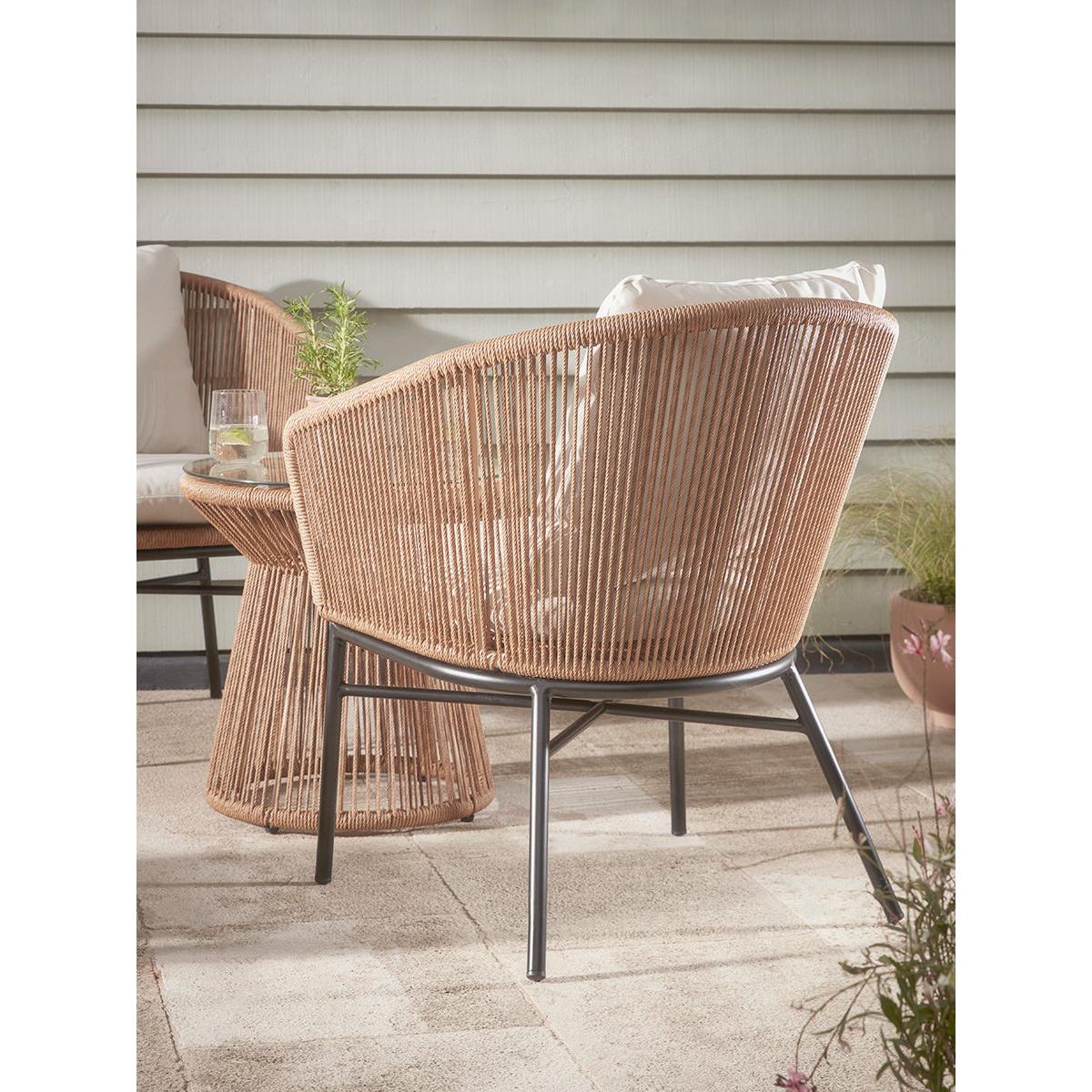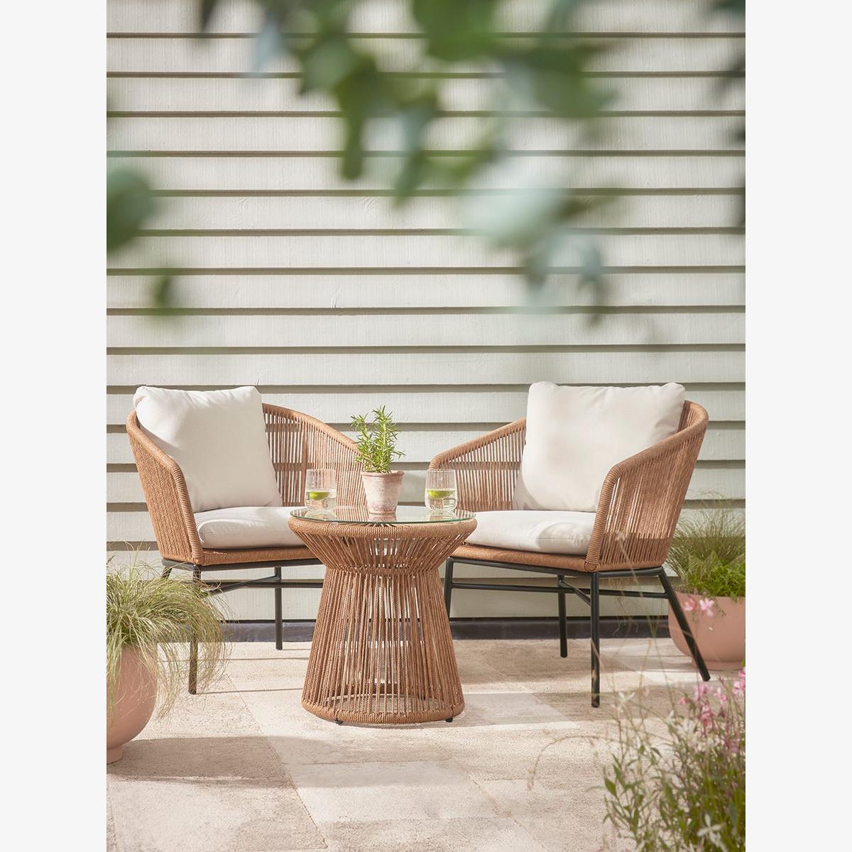 A contemporary bistro set with a wrapped weave of honey coloured faux wicker contrasted with slender black frames. Each armchair has a comforting curve to the back and arms which will envelop the occupant in a supportive manner. Seat and back cushions guarantee a luxurious and comfortable perch.  The table is woven around a geometric angled cylinder which is topped with glass for a smooth surface. Browse our useful Outdoor Furniture Buying Guide.