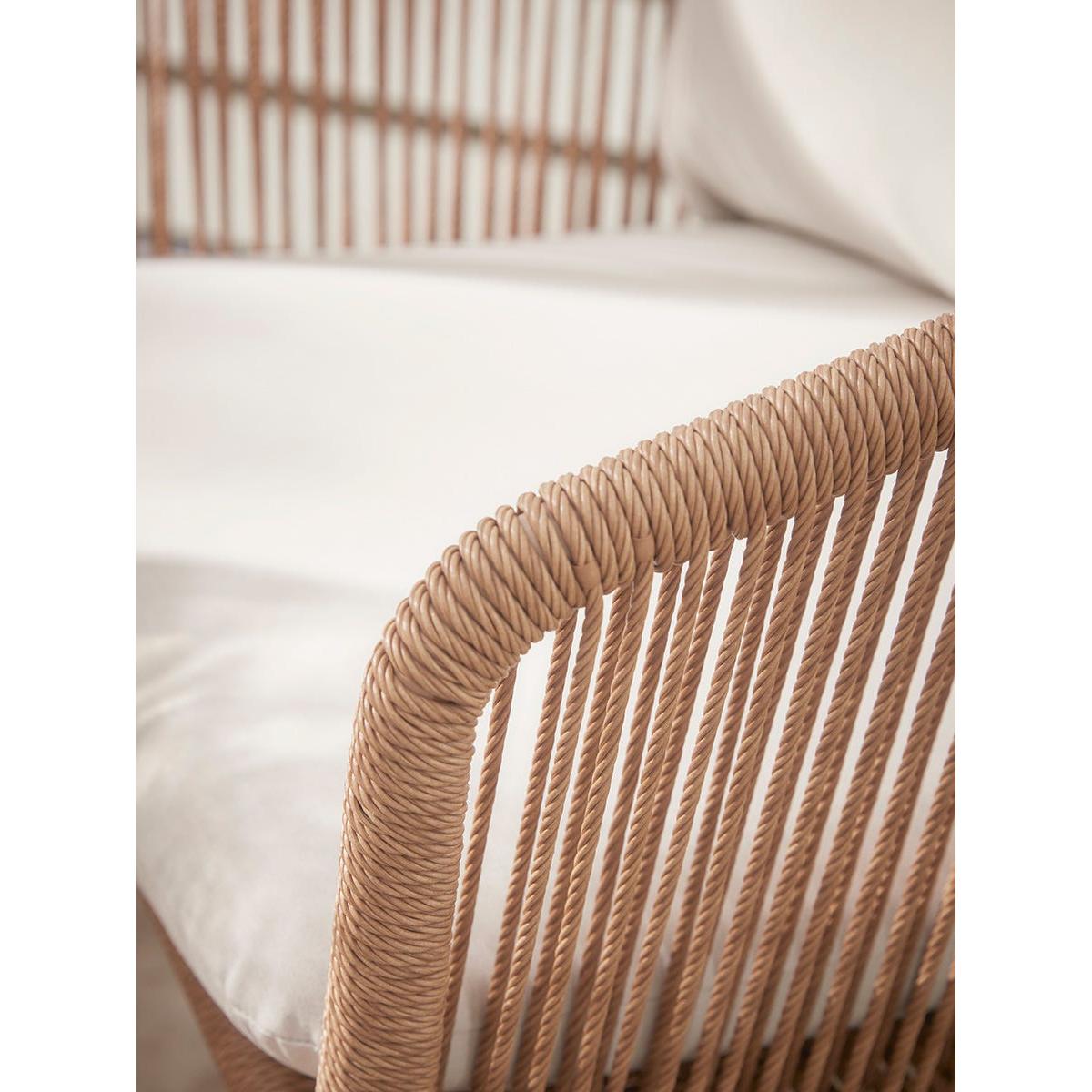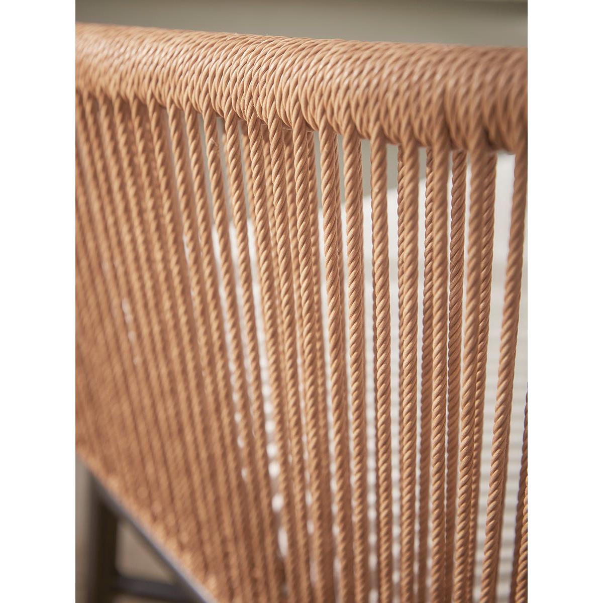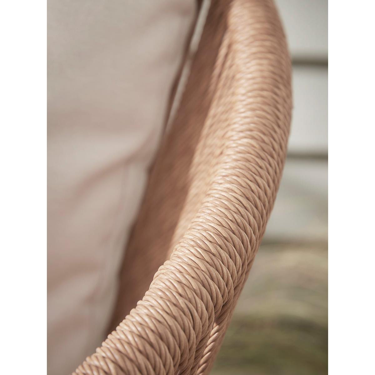 A contemporary bistro set with a wrapped weave of honey coloured faux wicker contrasted with slender black frames. Each armchair has a comforting curve to the back and arms which will envelop the occupant in a supportive manner. Seat and back cushions guarantee a luxurious and comfortable perch.  The table is woven around a geometric angled cylinder which is topped with glass for a smooth surface. Browse our useful Outdoor Furniture Buying Guide.