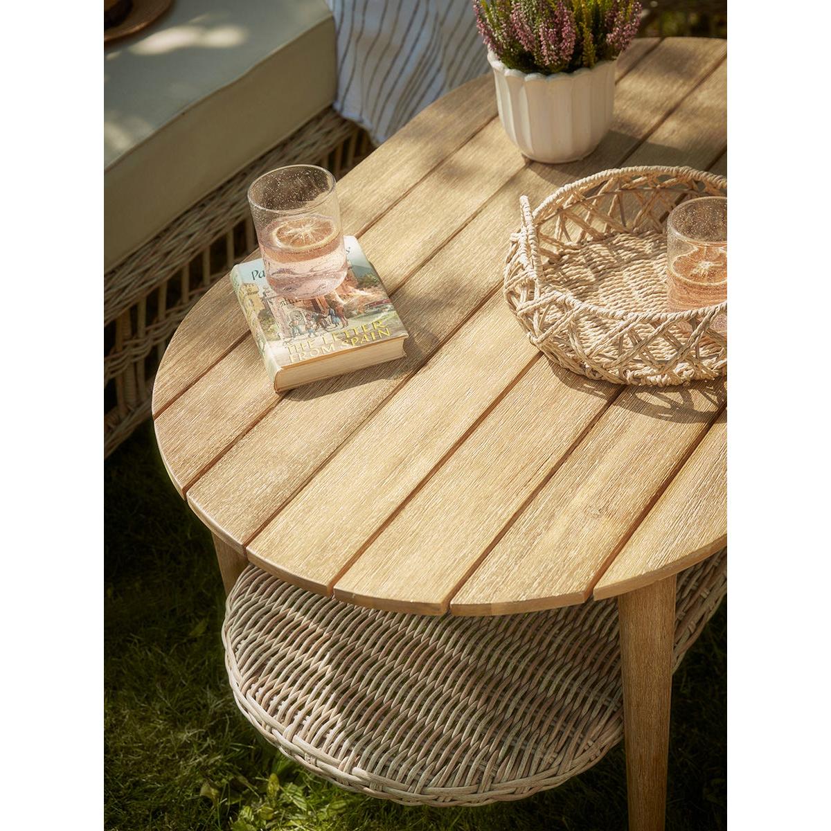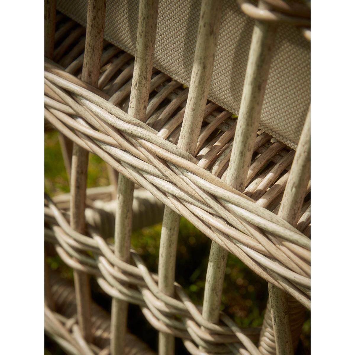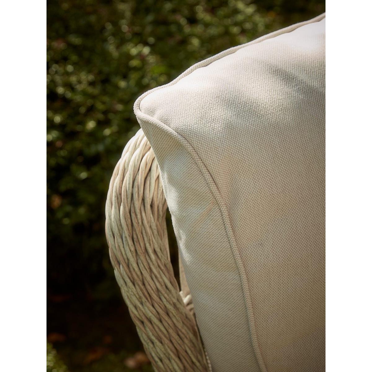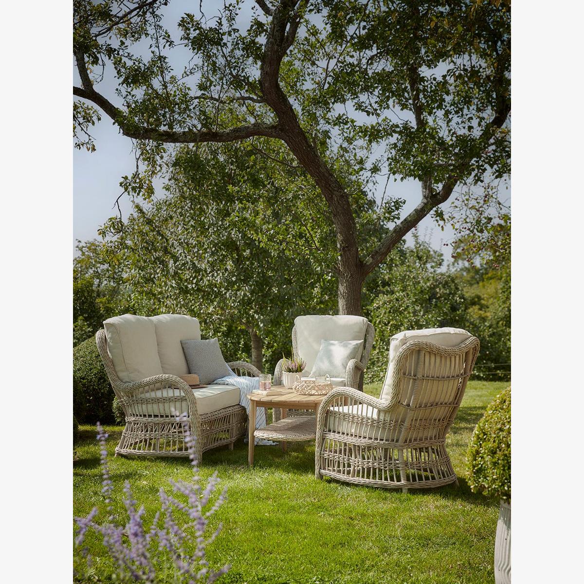 Relish in the nostalgia of Grannys cottage with our Barolo Lounge Set. Featuring two chairs and a sofa, the high backs and deep cushions provide a super comfortable place to rest and recoup on a hot summers day. In a light neutral fabric, the cushions add an airy and whimsical feel to your garden. Pairing well with the cushions, the blonde wicker frames with curvaceous lines create a softness, working wonderfully with the warm toned frame of the table. With a wicker shelf, the table is perfect for holding your book whilst you sit back and relax with a refreshing drink.