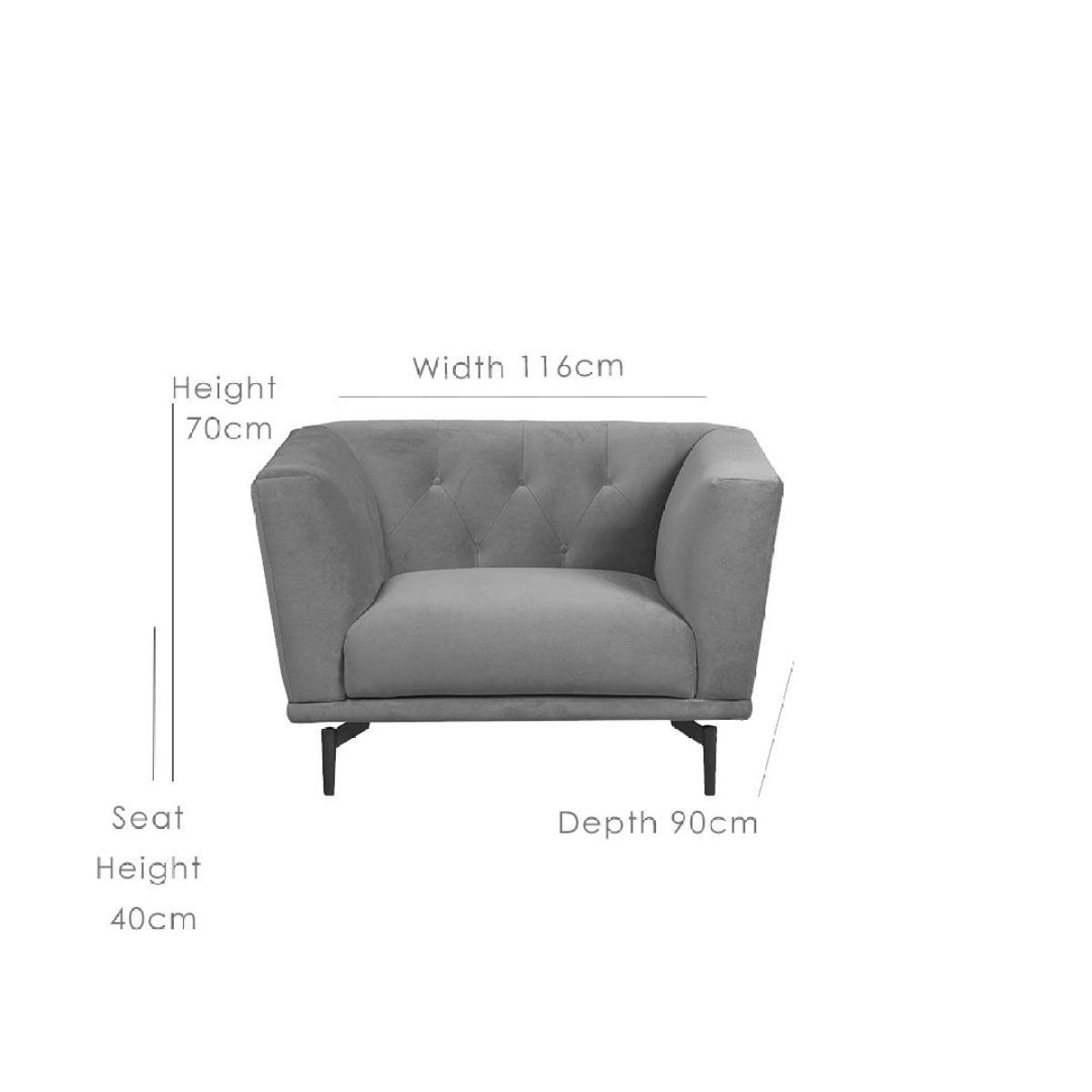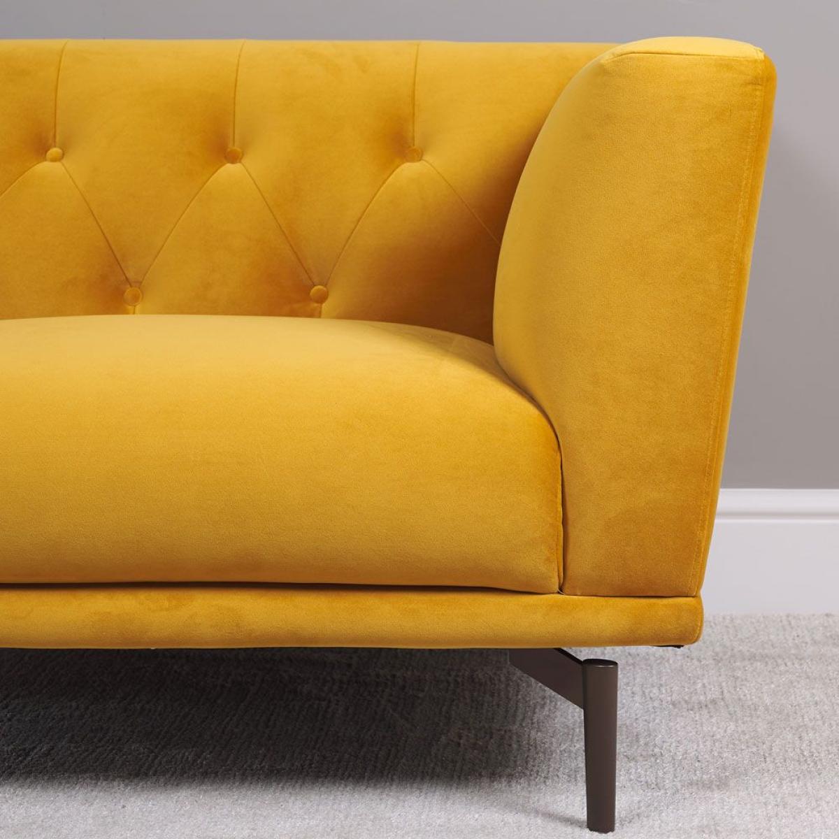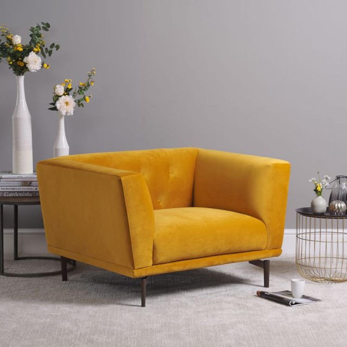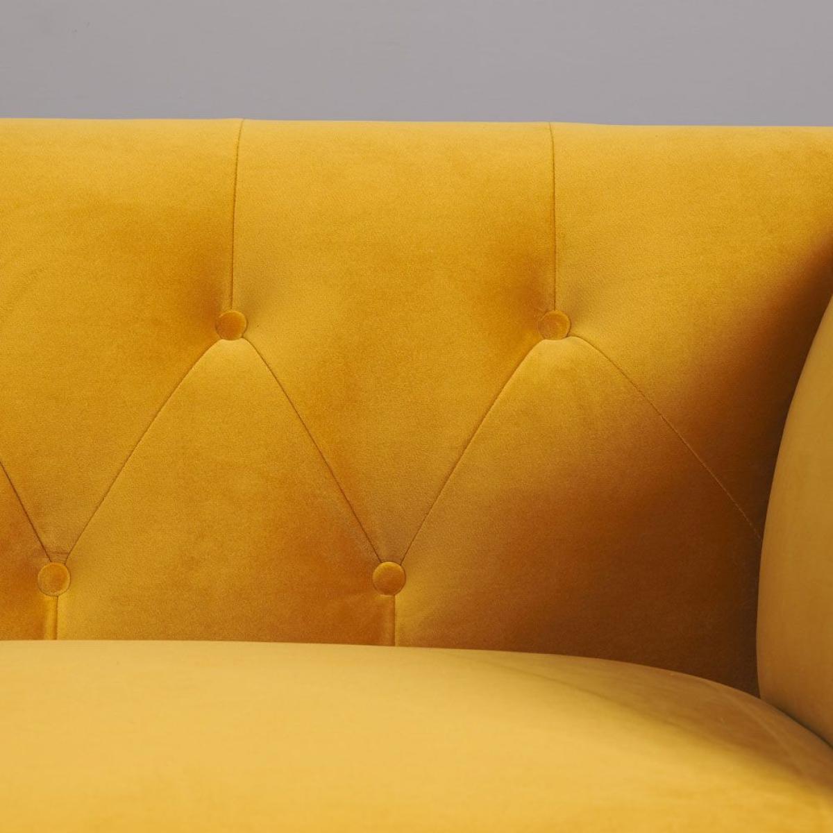 The on trend Baron armchair brings a room to life with its velvet mustard yellow upholstered finish. Featuring a retro inspired design as seen in its geometric cushioned arms and buttoned back. This collection also includes an armchair and an alternative deep grey upholstered finish.