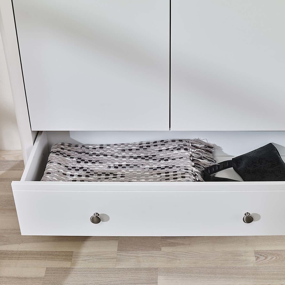 I really like this wardrobe because of its clean, classic silhouette and versatile white finish, which works well in both traditional and contemporary bedrooms. It’s a practical choice for adding brightness and a sense of space, especially in rooms with limited natural light. When styling around it, consider pairing with neutral or softly coloured linens to keep the look cohesive, or add metallic accents like brushed gold or chrome for a touch of elegance. Practical tips include using the drawers at the bottom for smaller items to keep clutter out of sight, and organising within with storage boxes or dividers to maximise the wardrobe’s internal space. It’s a functional piece that combines style and utility effortlessly.