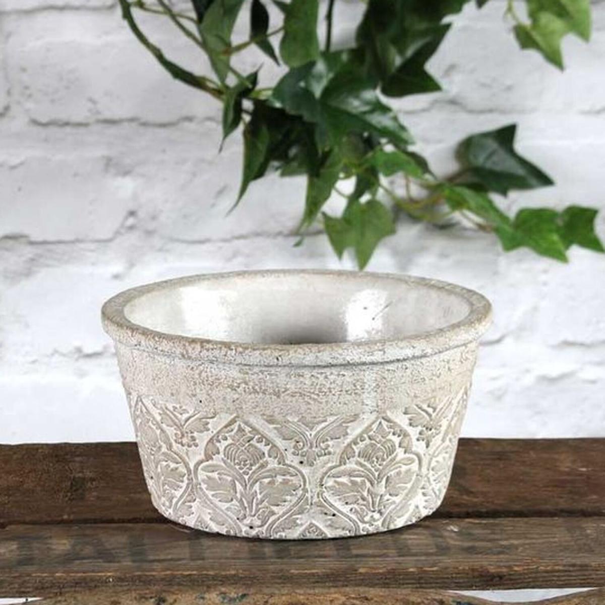 Beautiful ceramic pot with a vintage embossed pattern design and an aged stone feel. Antique white colour. Great for potting greenery and flowers. Can be used indoors or outdoor. Ideal for gifting. This pot has no drainage holes.