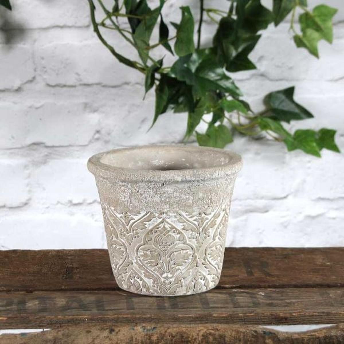 Beautiful ceramic pot with a vintage embossed pattern design and an aged stone feel. Antique white colour. Great for potting greenery and flowers. Can be used indoors or outdoor. Ideal for gifting. This pot has no drainage holes.