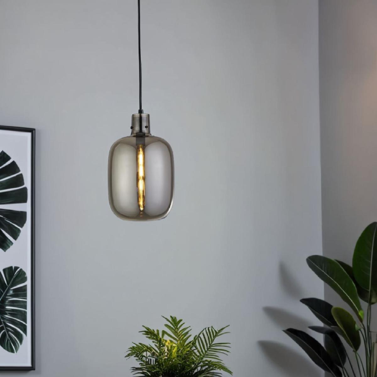 Barrel 1-light pendant ceiling light, featuring a dark smoked glass shade and matte black finish. A striking fixture that combines modern aesthetics with a touch of industrial charm, this pendant light features a dark smoked glass shade, which provides a moody and sophisticated ambiance. Complemented by a sleek matte black finish, the Barrel pendant exudes contemporary elegance and is perfect for adding a stylish accent to any room. Ideal for kitchens, dining areas or living rooms, the Barrel pendant light offers focused illumination while serving as a captivating focal point. Its stylish combination of dark smoked glass and matte black finish makes it a versatile addition to various interior styles, from modern to industrial. Barrel 1-light pendant ceiling light, featuring a dark smoked glass shade and matte black finish. A striking fixture that combines modern aesthetics with a touch of industrial charm, this pendant light features a dark smoked glass shade, which provides a moody and sophisticated ambiance. Complemented by a sleek matte black finish, the Barrel pendant exudes contemporary elegance and is perfect for adding a stylish accent to any room. Ideal for kitchens, dining areas or living rooms, the Barrel pendant light offers focused illumination while serving as a captivating focal point. Its stylish combination of dark smoked glass and matte black finish makes it a versatile addition to various interior styles, from modern to industrial.