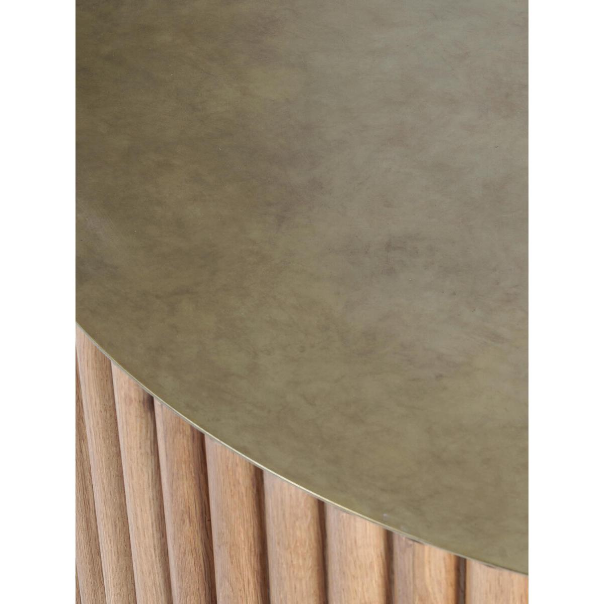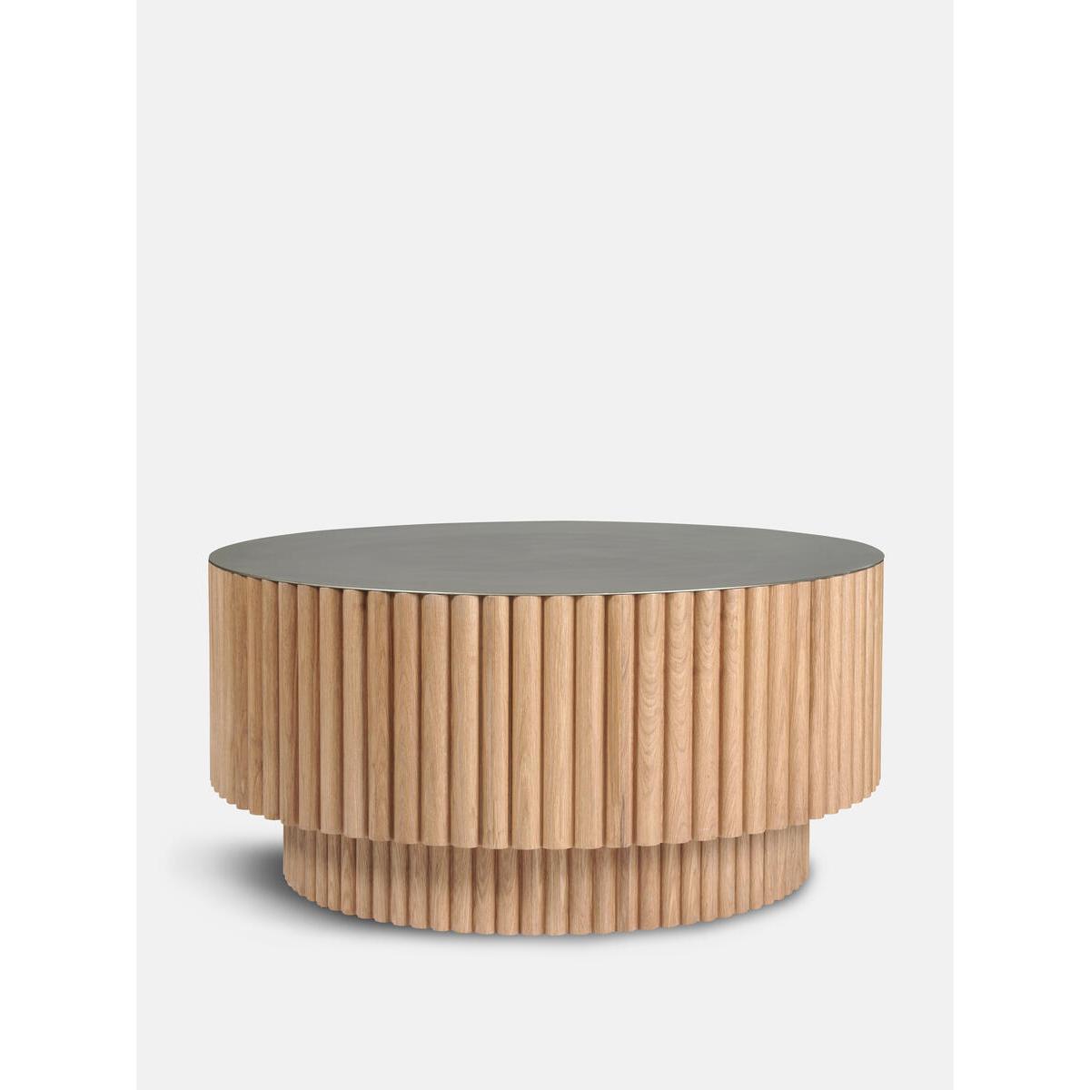 Intricately designed with smooth oak cylinders that create itscharacteristic barrel shape, this coffee table will add a freshfocal point to any room. The drum top is finished with antiquedbrass that's treated for a naturally aged quality, making each oneunique. It's inspired by designs from 180 House, opening soon on. London's Strand. Oak cylinders, antiqued brass top.